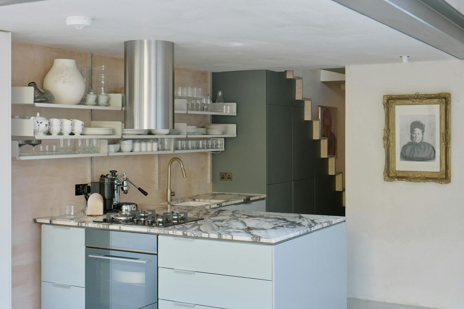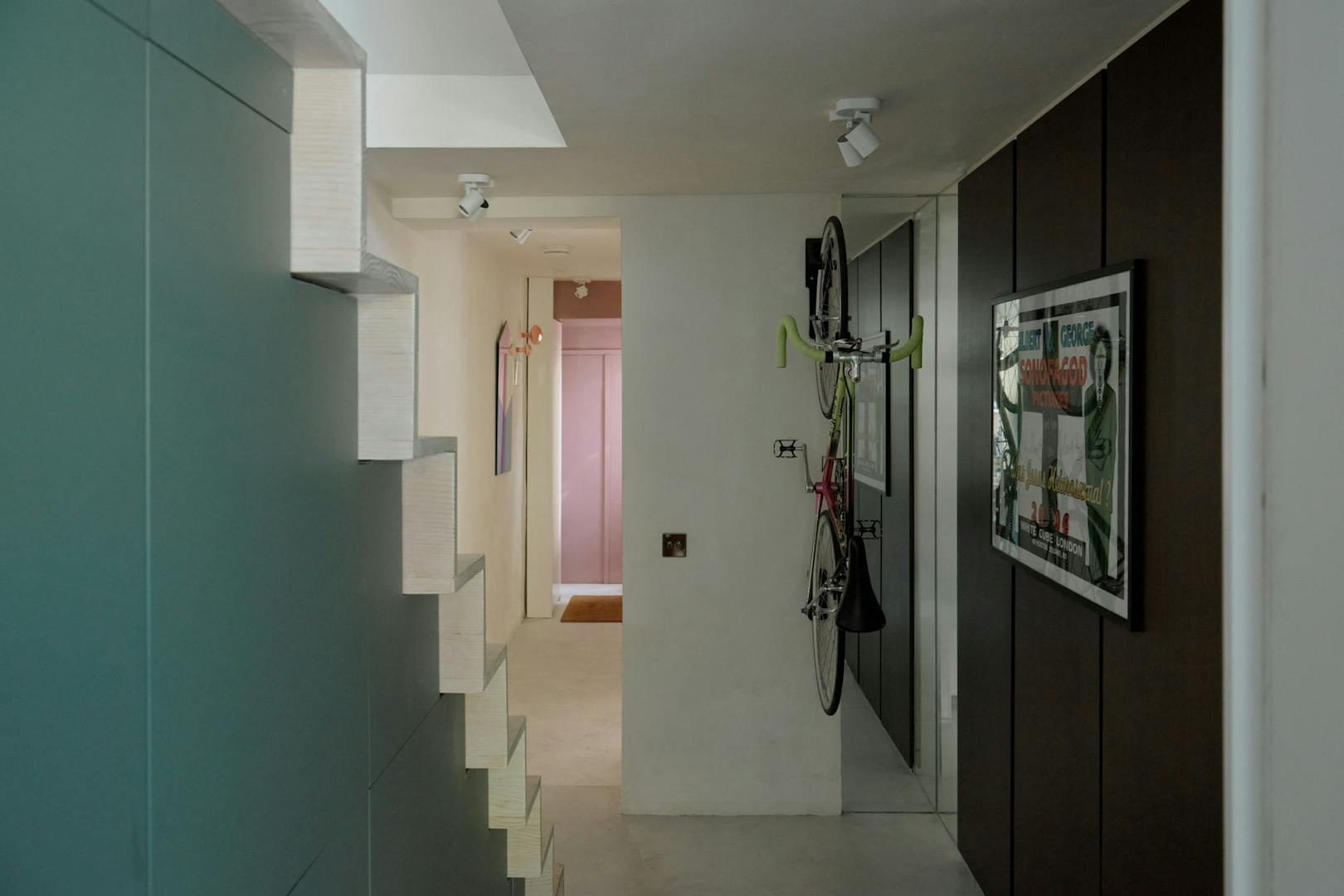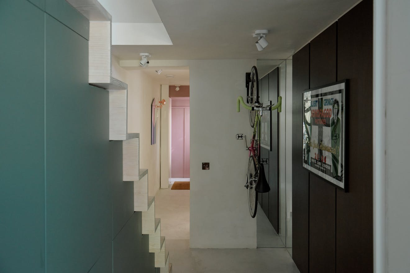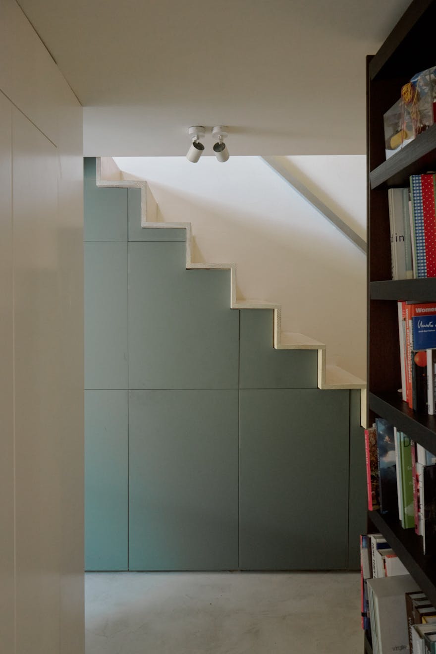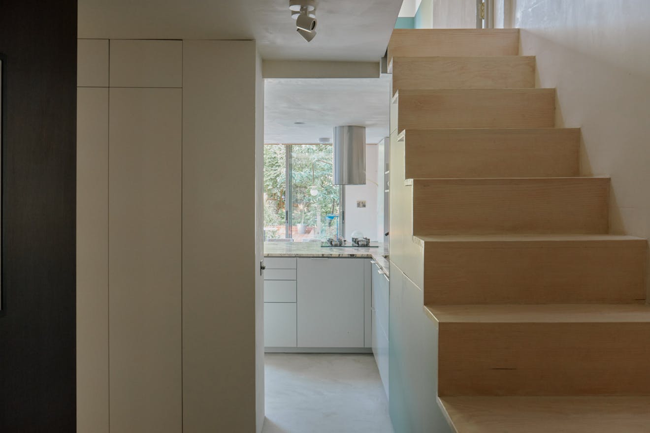 Entry is via a private front door at garden level, set back from the street behind a terracotta brick-tiled path. Inside, a polished concrete floor anchors the space, drawing the eye towards a sculptural staircase that rises to the upper bedroom.