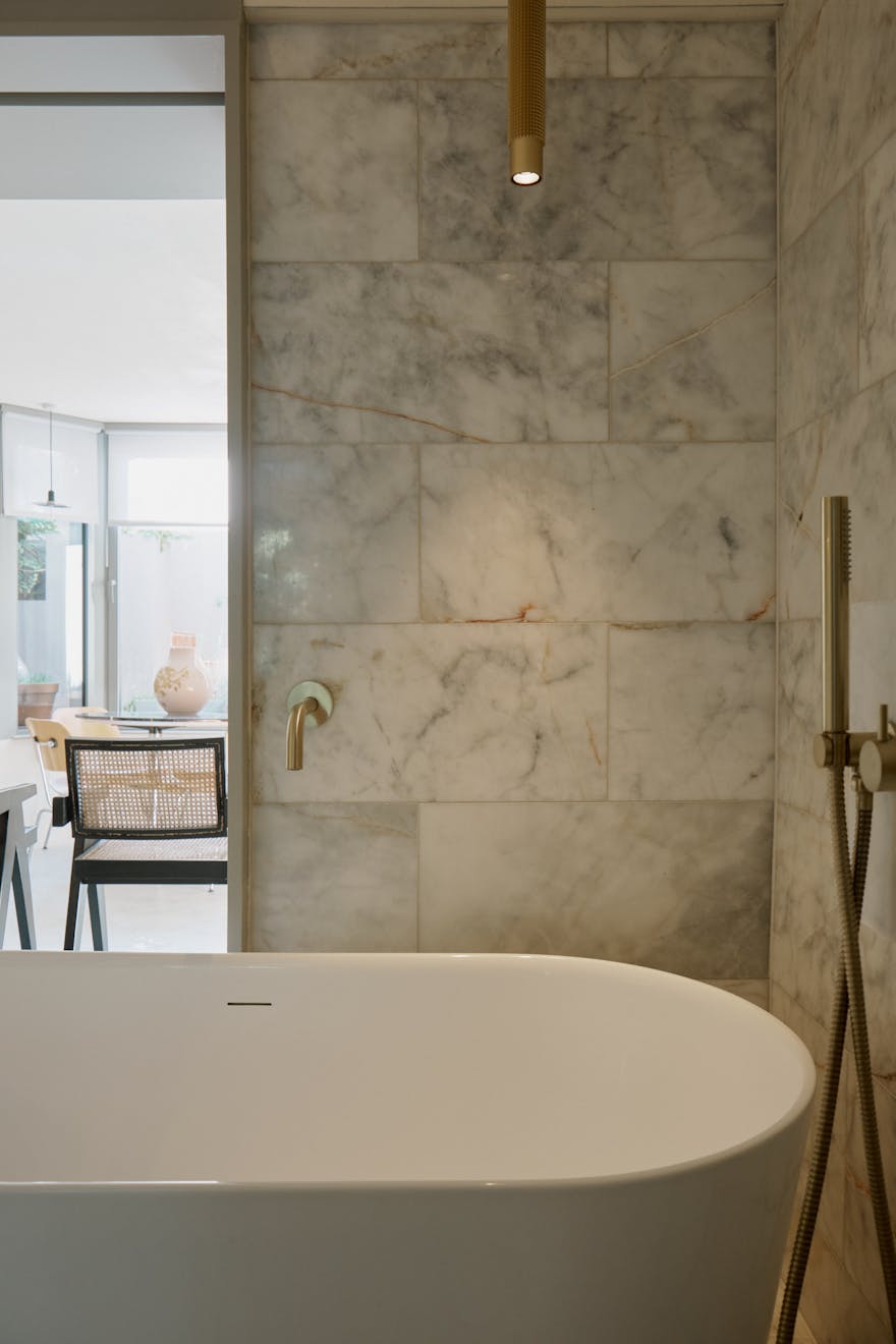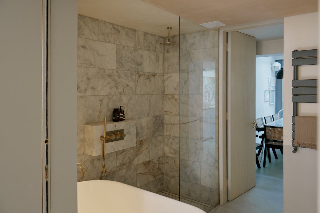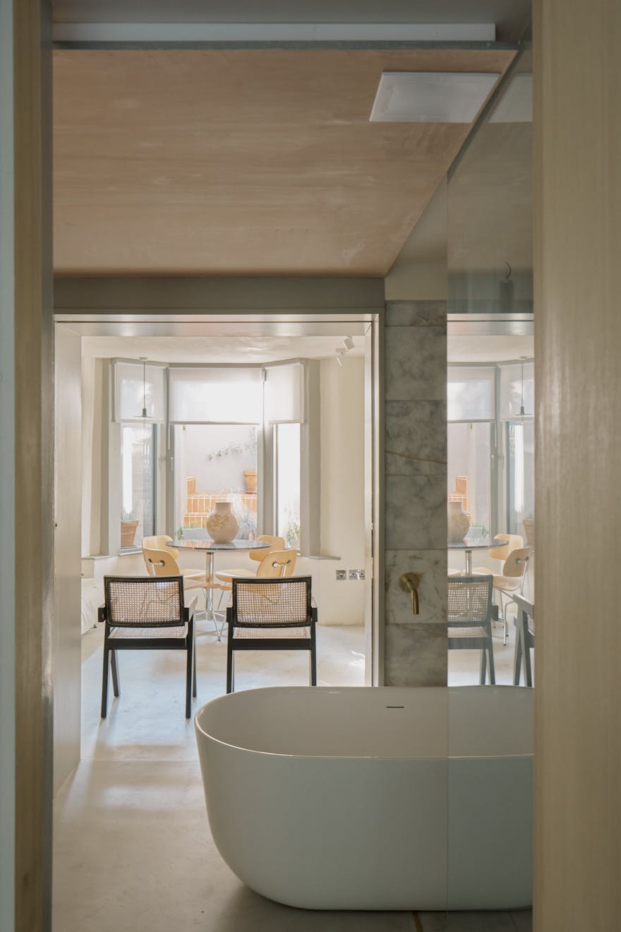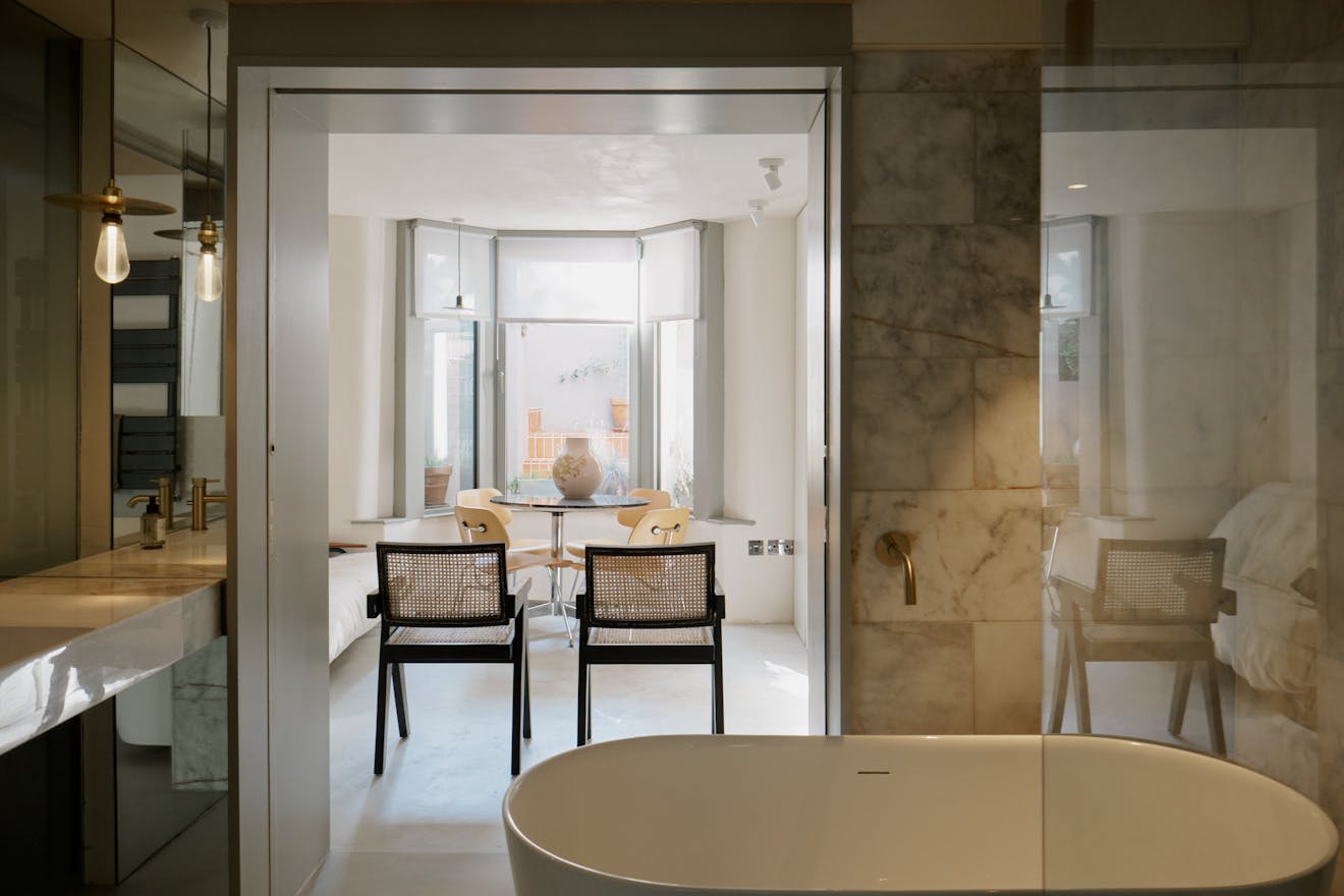 To the front, the principal bedroom has been conceived as a gentle retreat. Bespoke storage solutions maximise function, while twist-and-turn glazing within the bay window softens the boundary between inside and out. Double pocket doors slide open to reveal a beautifully detailed bathroom, where a freestanding rolltop bath, rainfall shower and floating basin are set within a palette that speaks to quiet luxury.