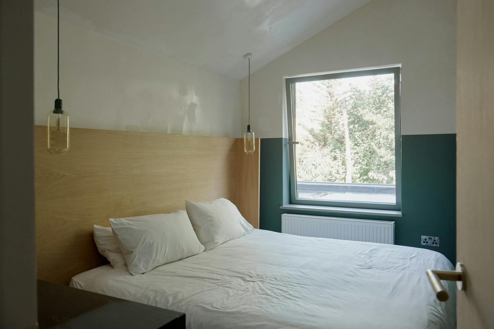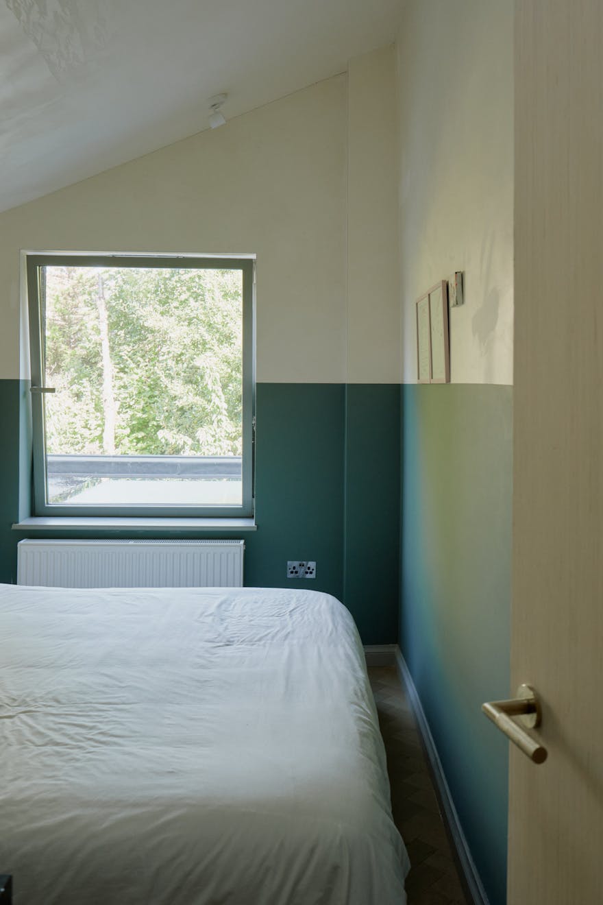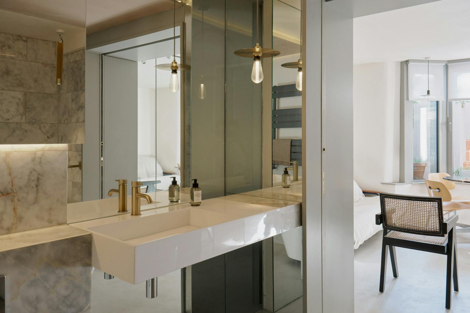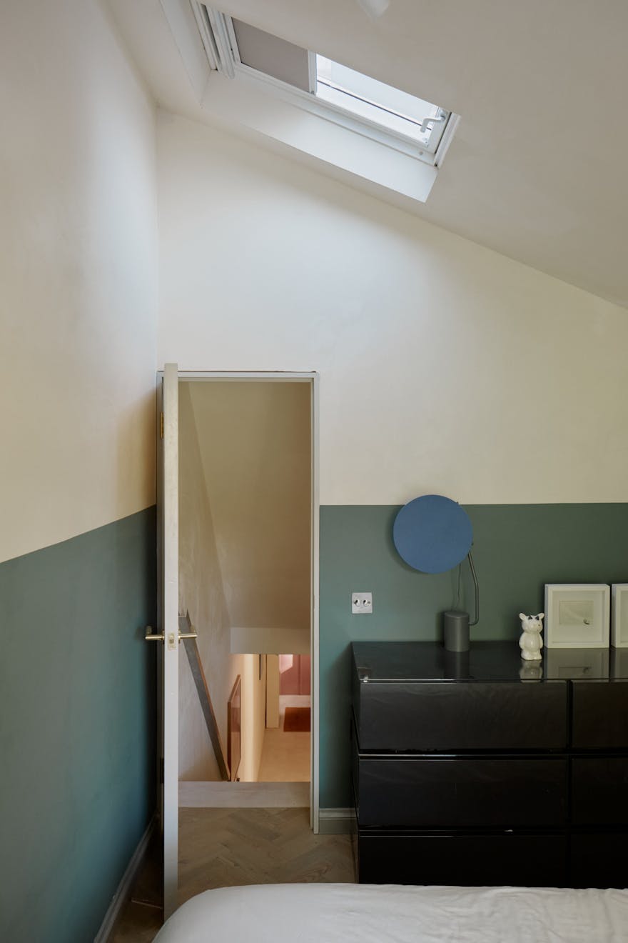 To the front, the principal bedroom has been conceived as a gentle retreat. Bespoke storage solutions maximise function, while twist-and-turn glazing within the bay window softens the boundary between inside and out. Double pocket doors slide open to reveal a beautifully detailed bathroom, where a freestanding rolltop bath, rainfall shower and floating basin are set within a palette that speaks to quiet luxury.