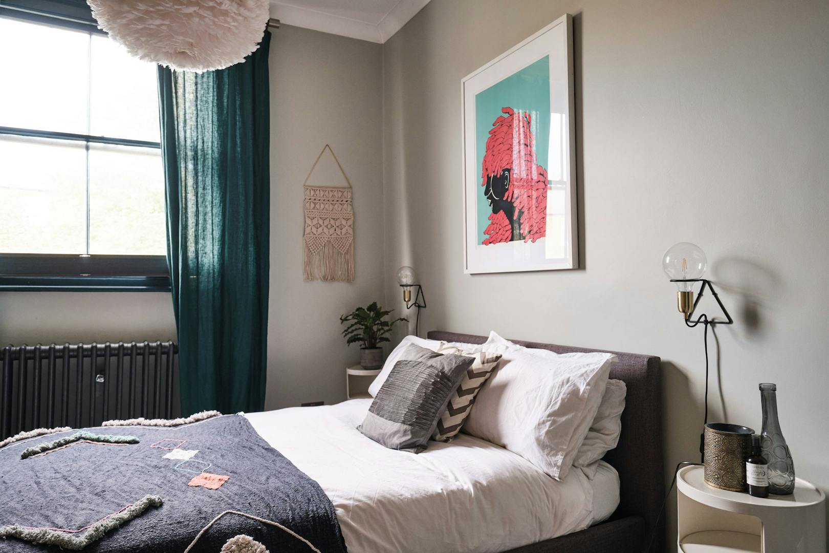 The first of the two bathrooms is located just up the first set of stairs. It takes shape as a fully tiled wet room and features a large rainfall shower, a discreet corner WC, and a built-in basin with storage. Continue up to the first floor to find a double bedroom to the right, complete with terrazzo wallpaper by Hay, built-in storage and feature fireplace. The master bedroom is just next door, at the front of the house, and benefits from two south-facing sash windows, and period built-in storage cupboards either side of the original chimney breast.