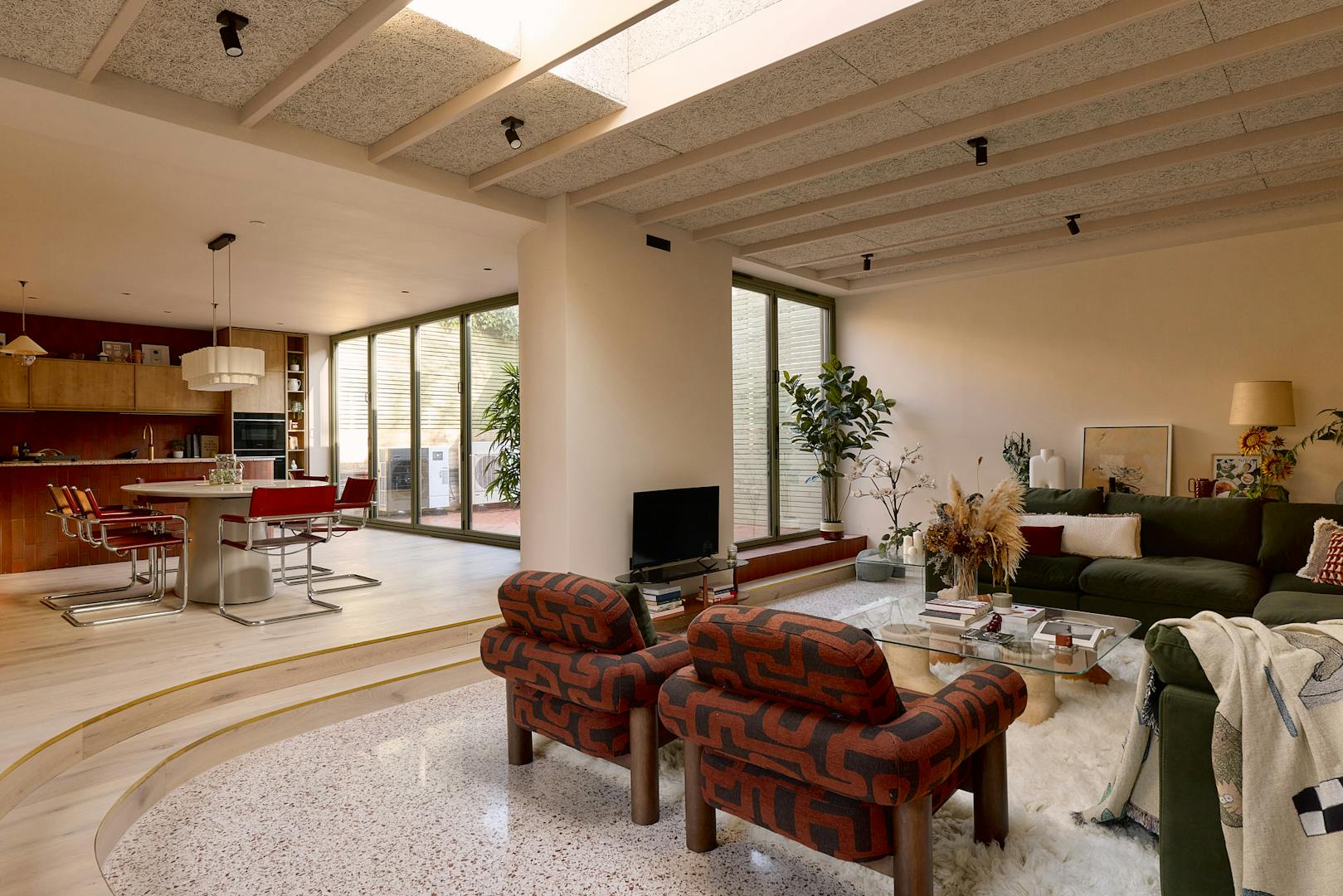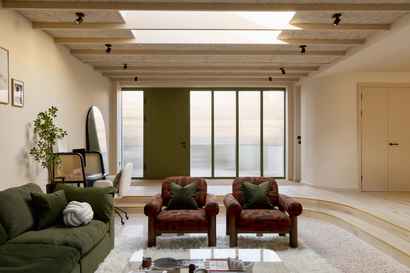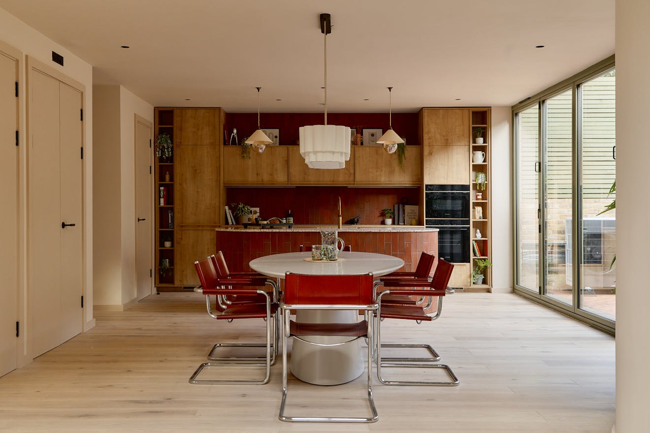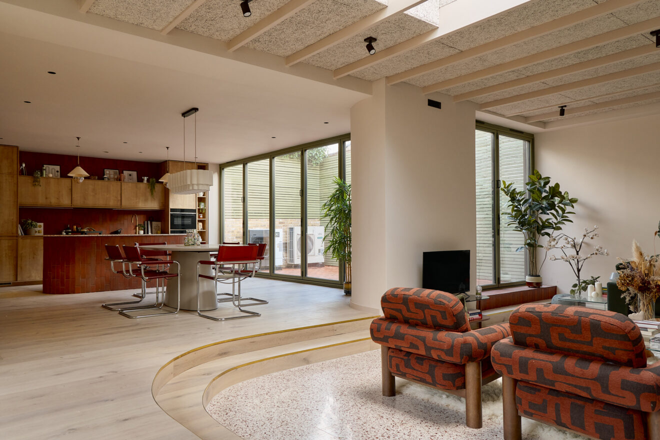 The house is anchored by a lateral living plan, brilliantly arranged for contemporary life and echoing the ease of a mid-century layout. Unfolding across 170 sq m, the design is underpinned by an eco-conscious approach. Porotherm clay blocks, chosen for their exceptional thermal performance and breathability, were used throughout the construction. A sunken living area creates a relaxed, cocooning atmosphere, while overhead glazing and bi-fold doors opening to a generous courtyard bathe the interior with natural light. A spacious and sociable dining table sits in the heart of the home and draws the eye towards the kitchen.