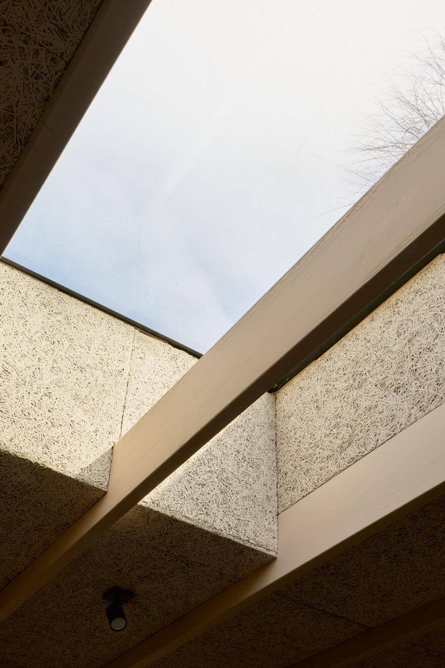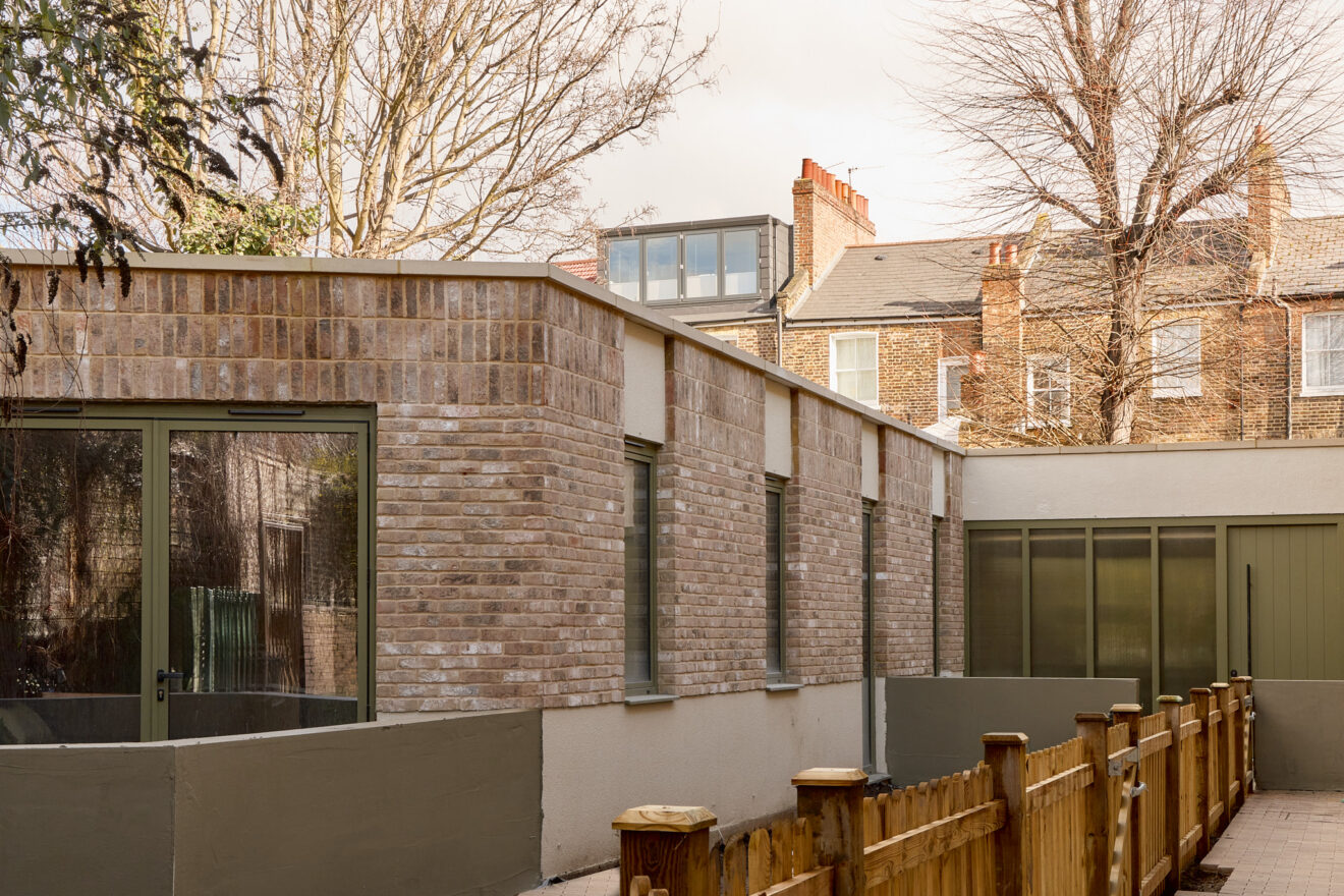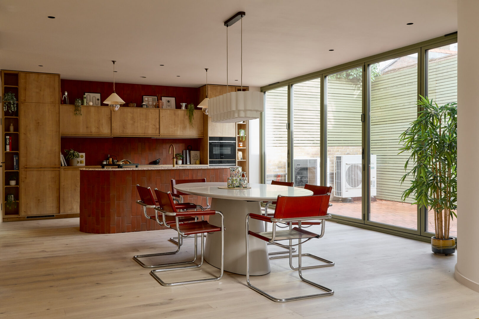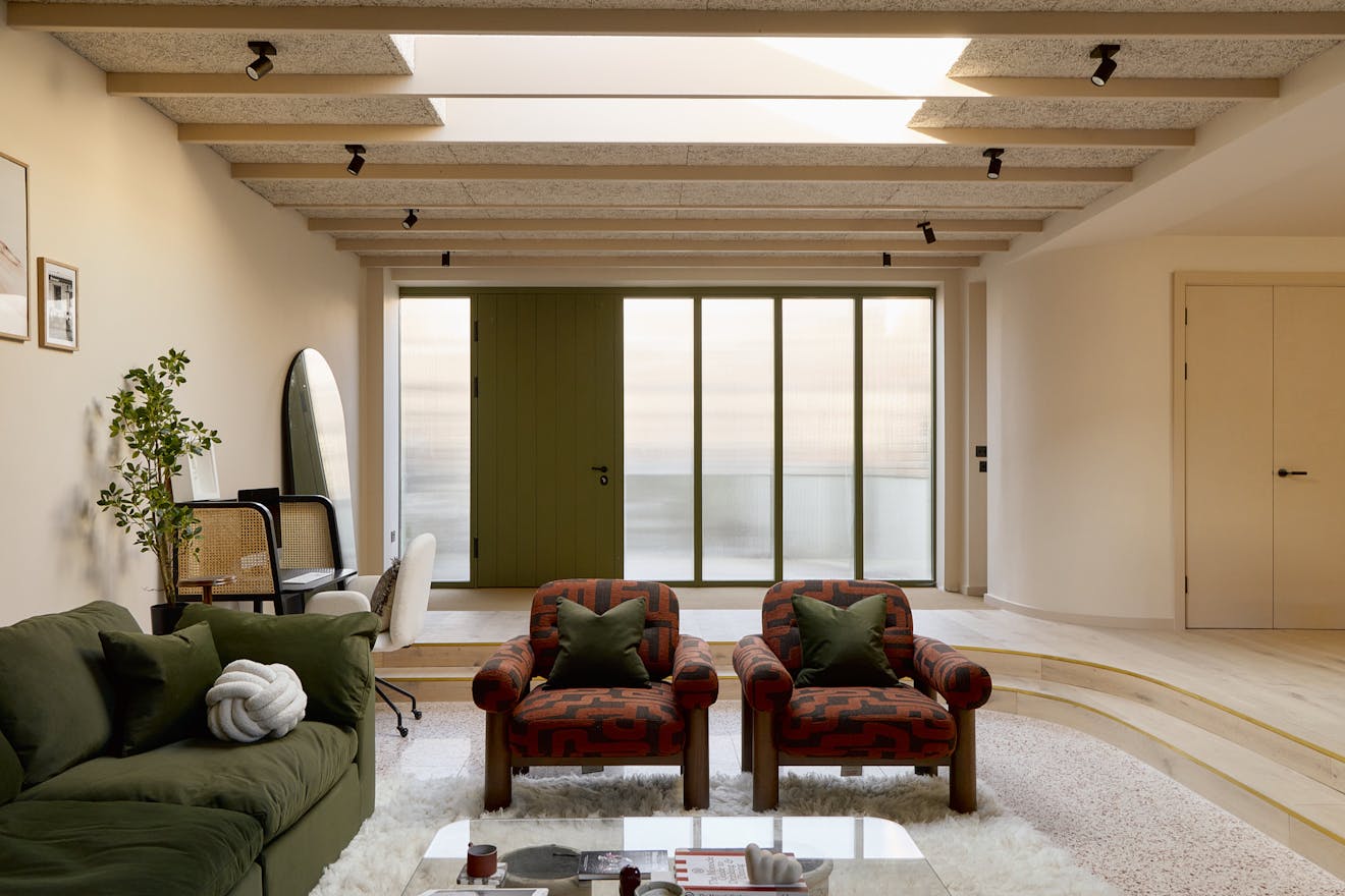 The house is anchored by a lateral living plan, brilliantly arranged for contemporary life and echoing the ease of a mid-century layout. Unfolding across 170 sq m, the design is underpinned by an eco-conscious approach. Porotherm clay blocks, chosen for their exceptional thermal performance and breathability, were used throughout the construction. A sunken living area creates a relaxed, cocooning atmosphere, while overhead glazing and bi-fold doors opening to a generous courtyard bathe the interior with natural light. A spacious and sociable dining table sits in the heart of the home and draws the eye towards the kitchen.