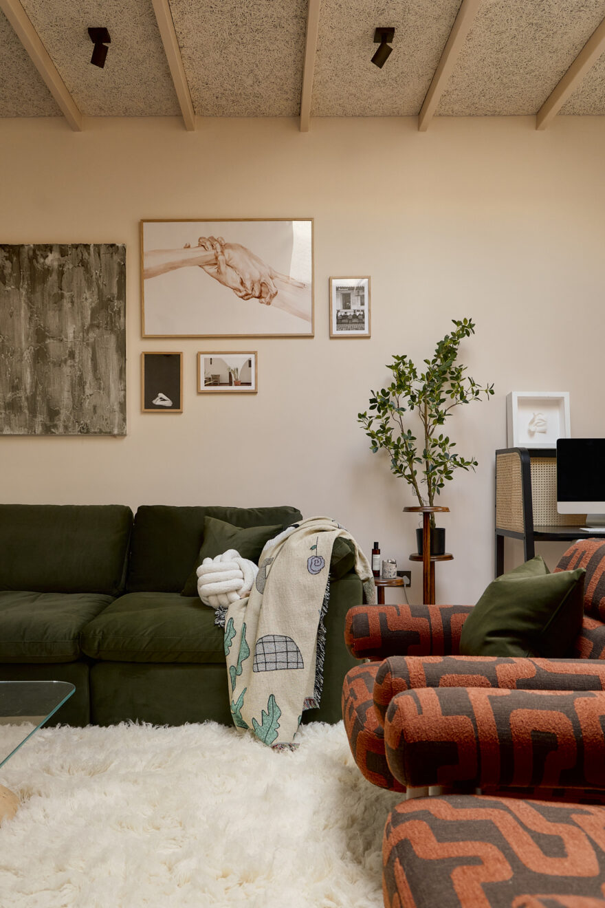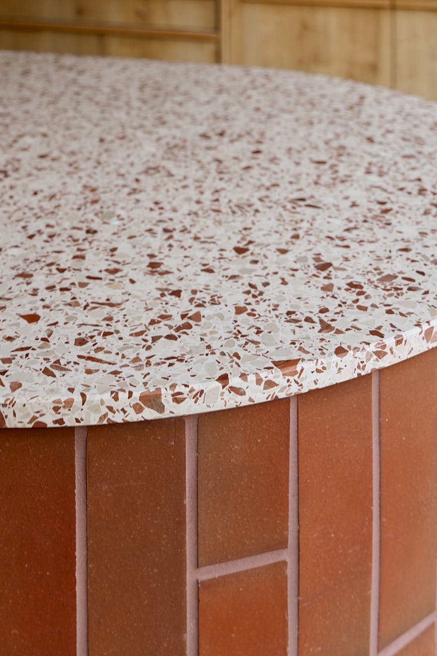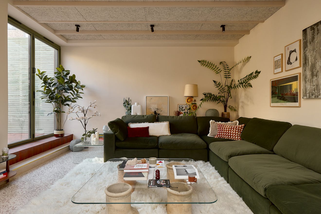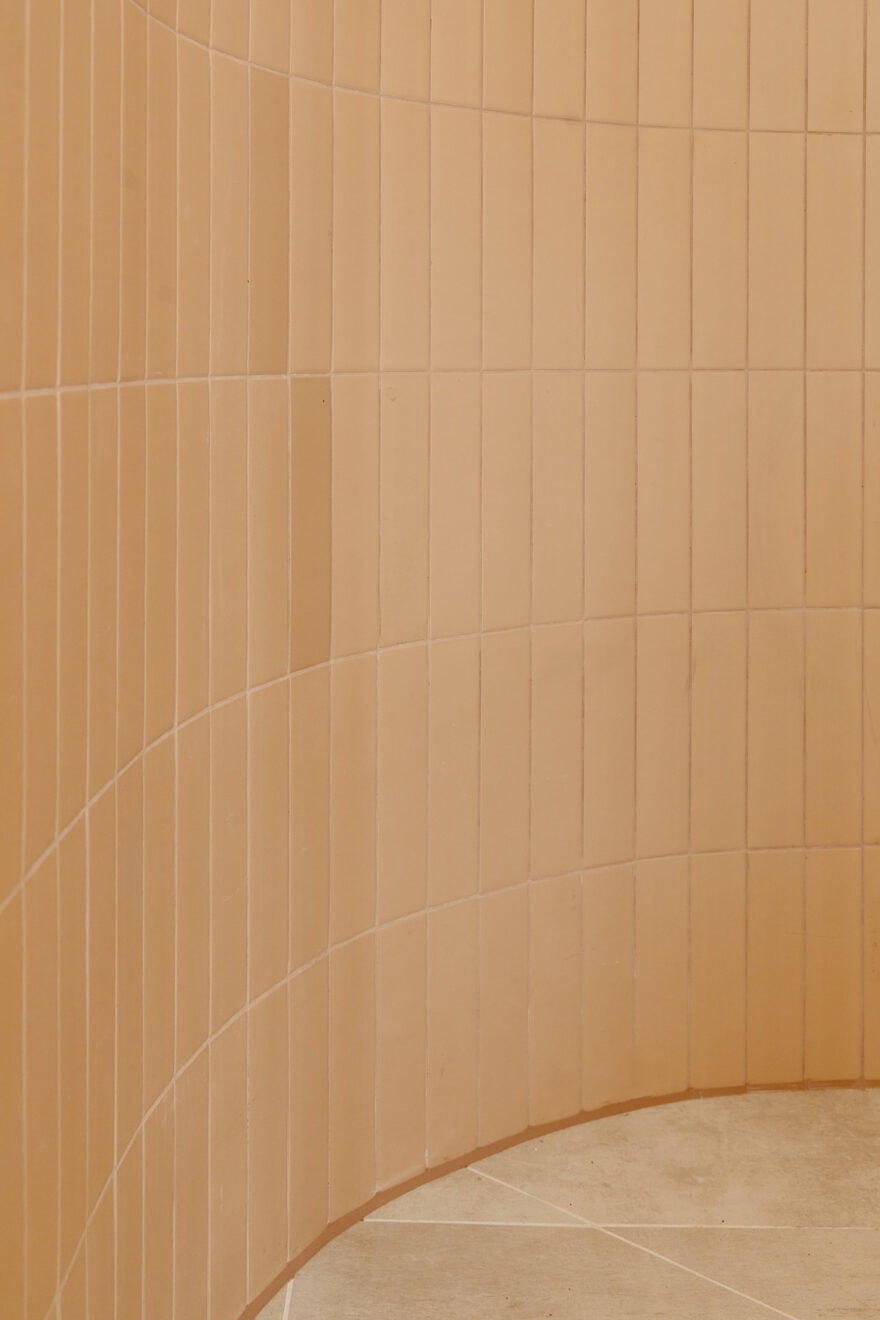 The house is anchored by a lateral living plan, brilliantly arranged for contemporary life and echoing the ease of a mid-century layout. Unfolding across 170 sq m, the design is underpinned by an eco-conscious approach. Porotherm clay blocks, chosen for their exceptional thermal performance and breathability, were used throughout the construction. A sunken living area creates a relaxed, cocooning atmosphere, while overhead glazing and bi-fold doors opening to a generous courtyard bathe the interior with natural light. A spacious and sociable dining table sits in the heart of the home and draws the eye towards the kitchen.