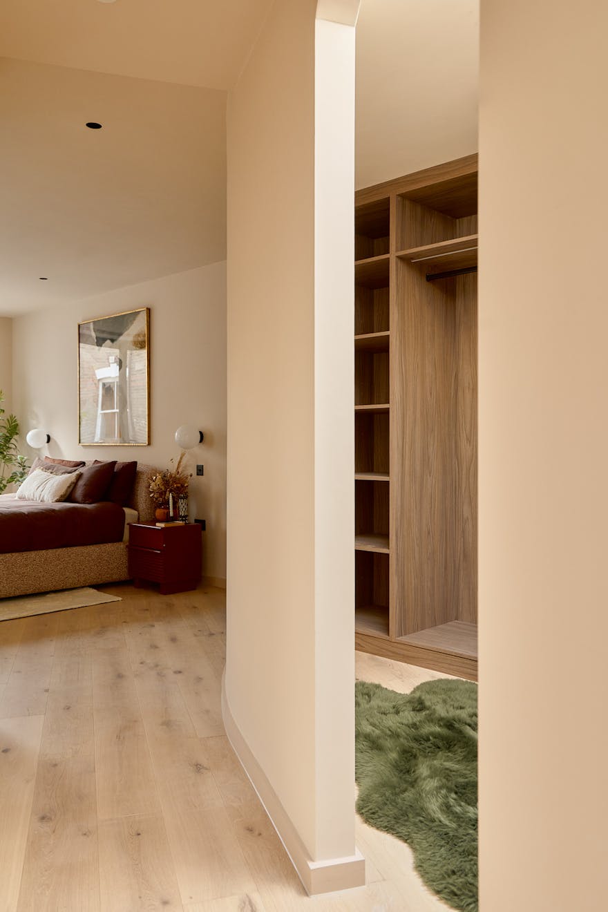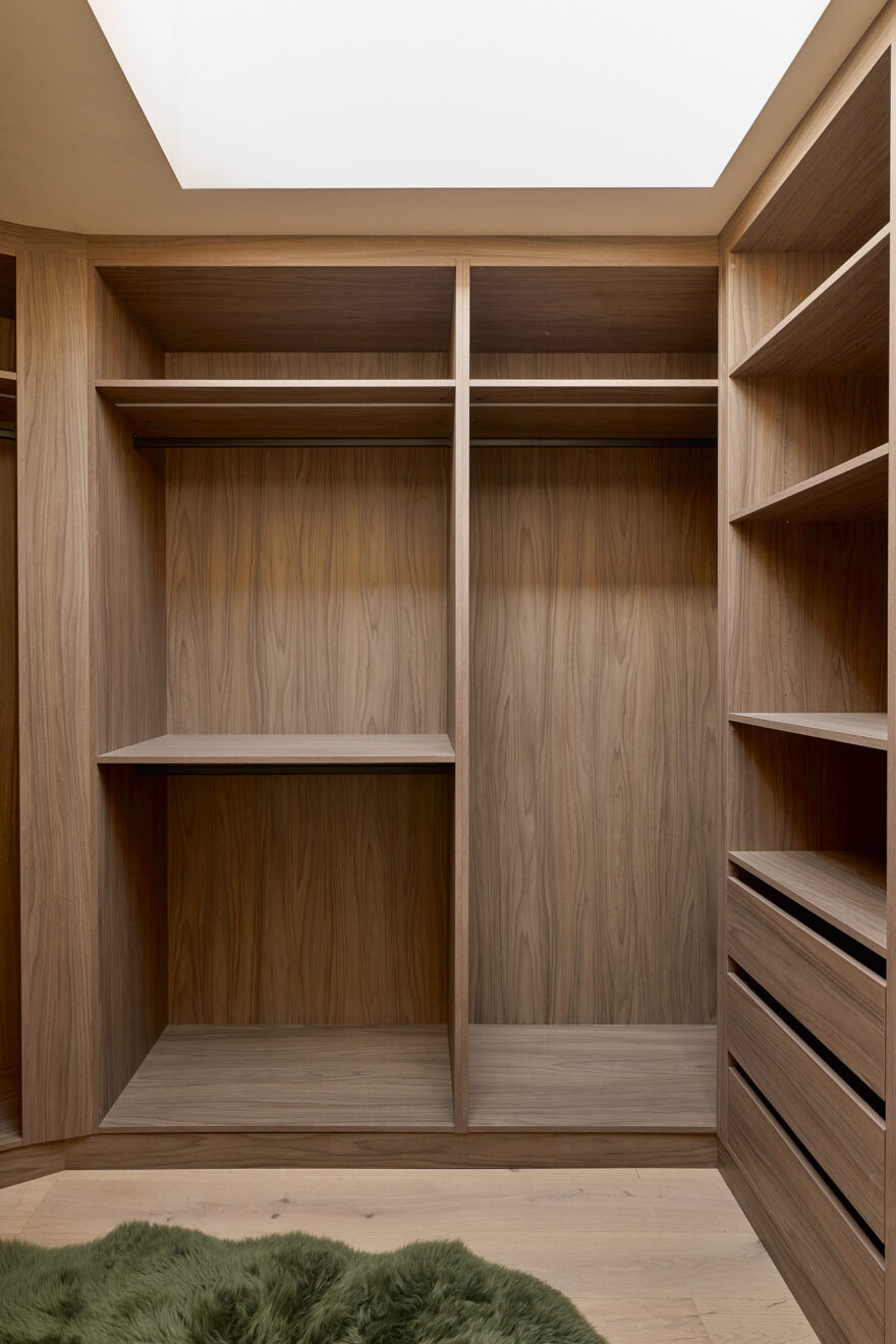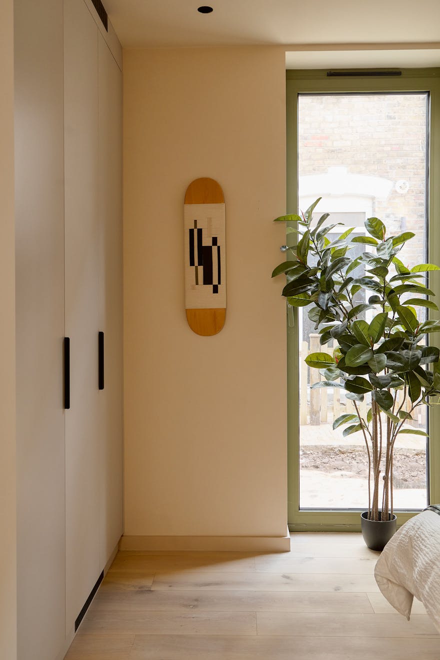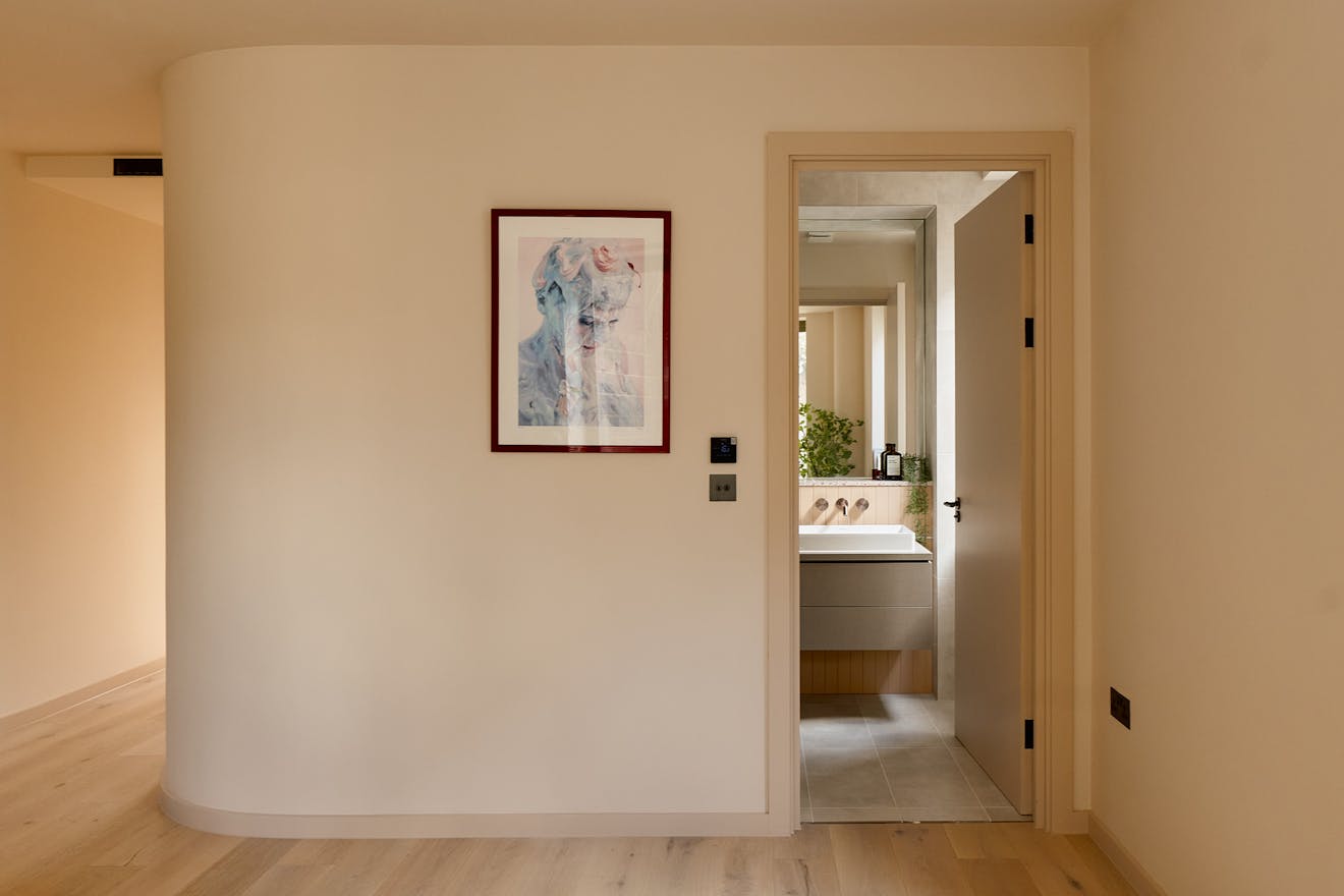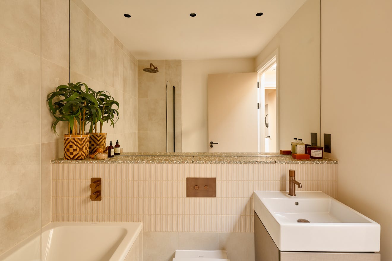 Artform’s interior design partners Scenesmith have worked in collaboration with Leicht, a carbon-neutral manufacturer, on the colourful ‘Kyoto’ kitchen, which references Japanese minimalism and imbues the space with warmth and quality. The striking kitchen island is clad in quarry tiles and topped with chestnut-flecked terrazzo. Integrated Siemens appliances are paired with a brass Quooker hot tap. A separate utility room is neatly tucked away, alongside additional storage for coats and bags.