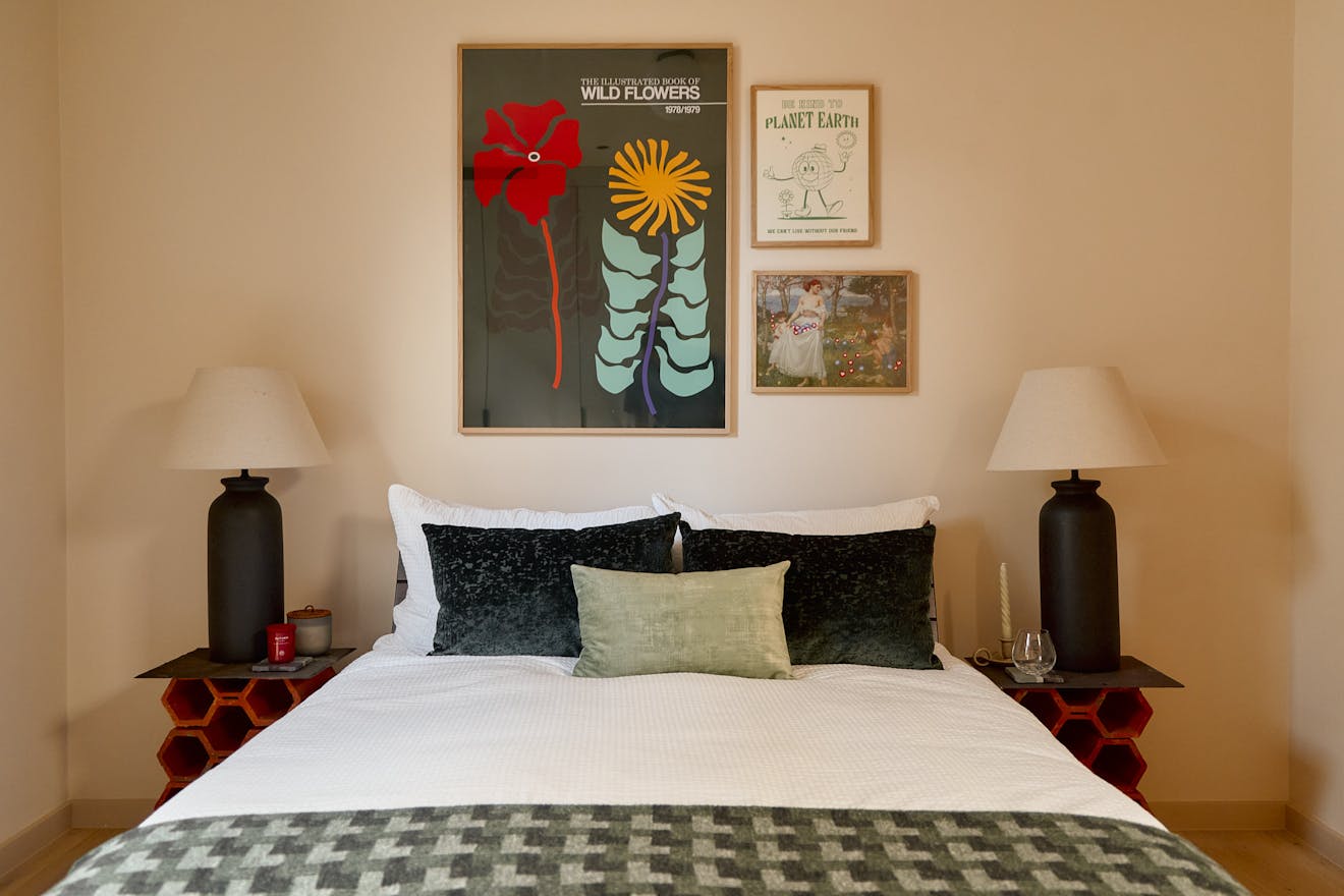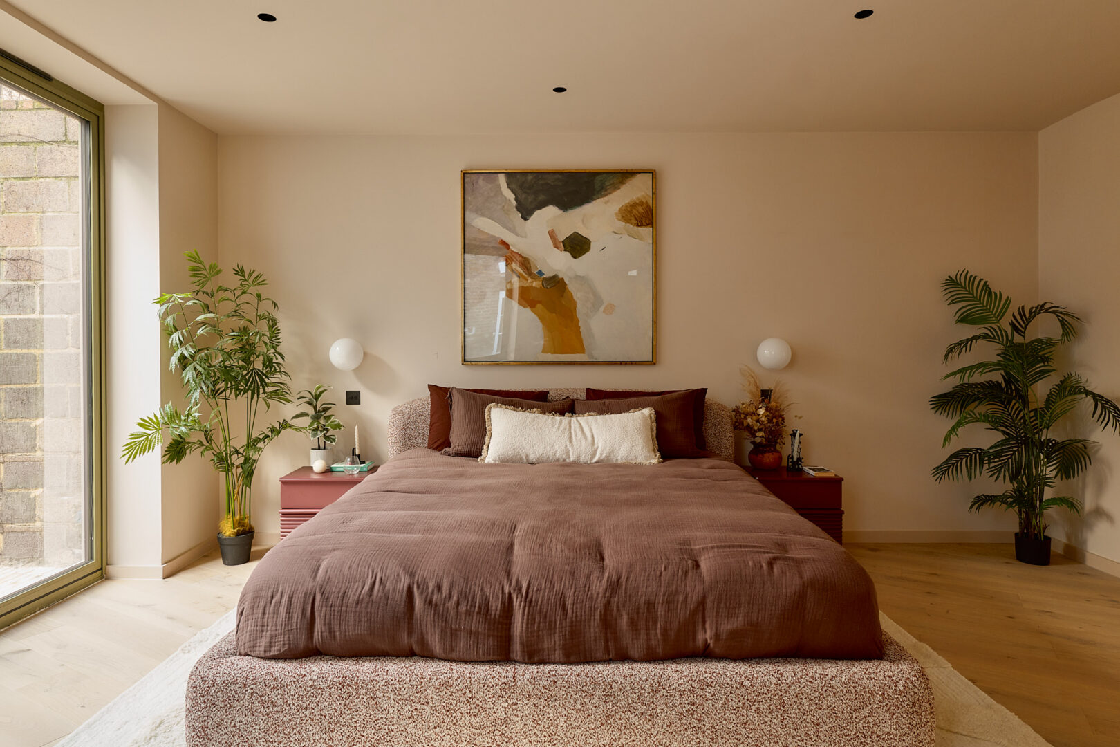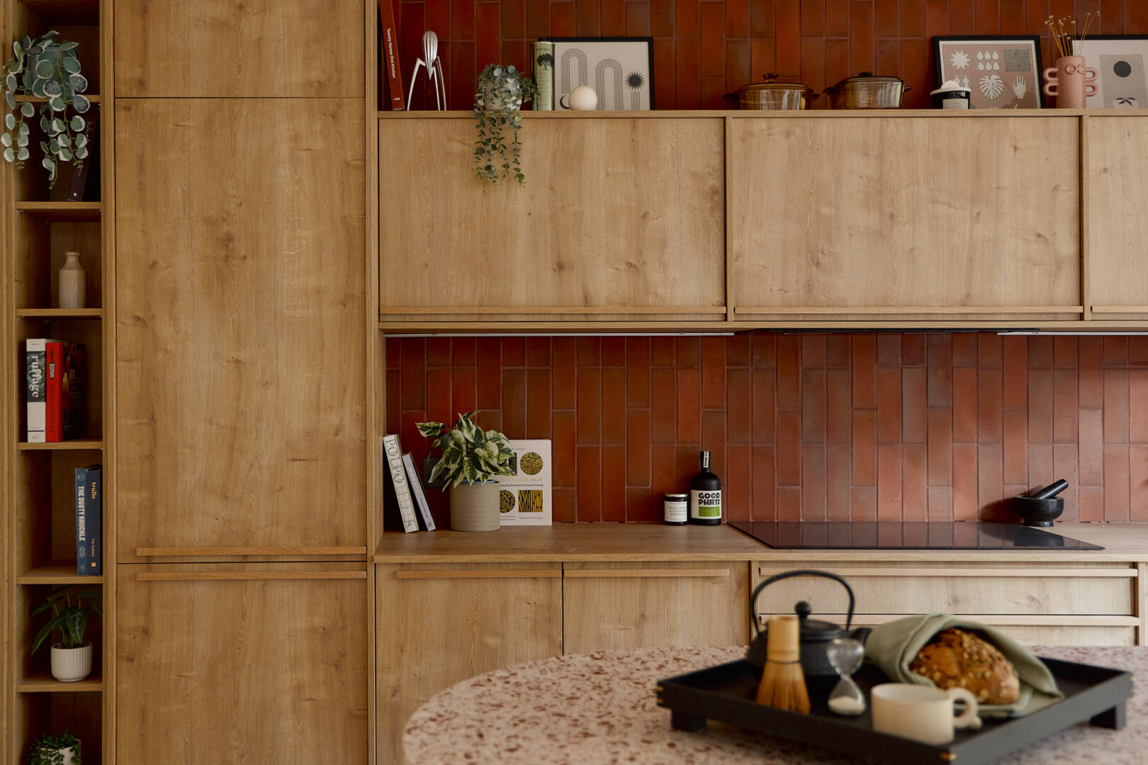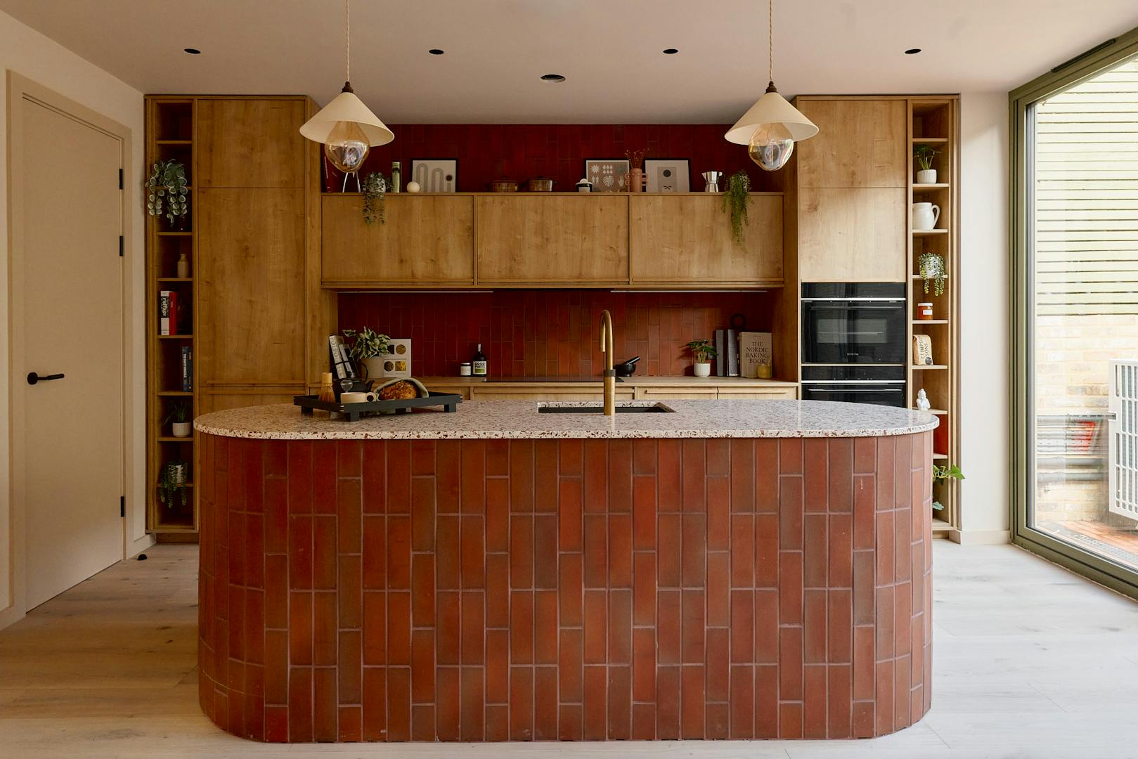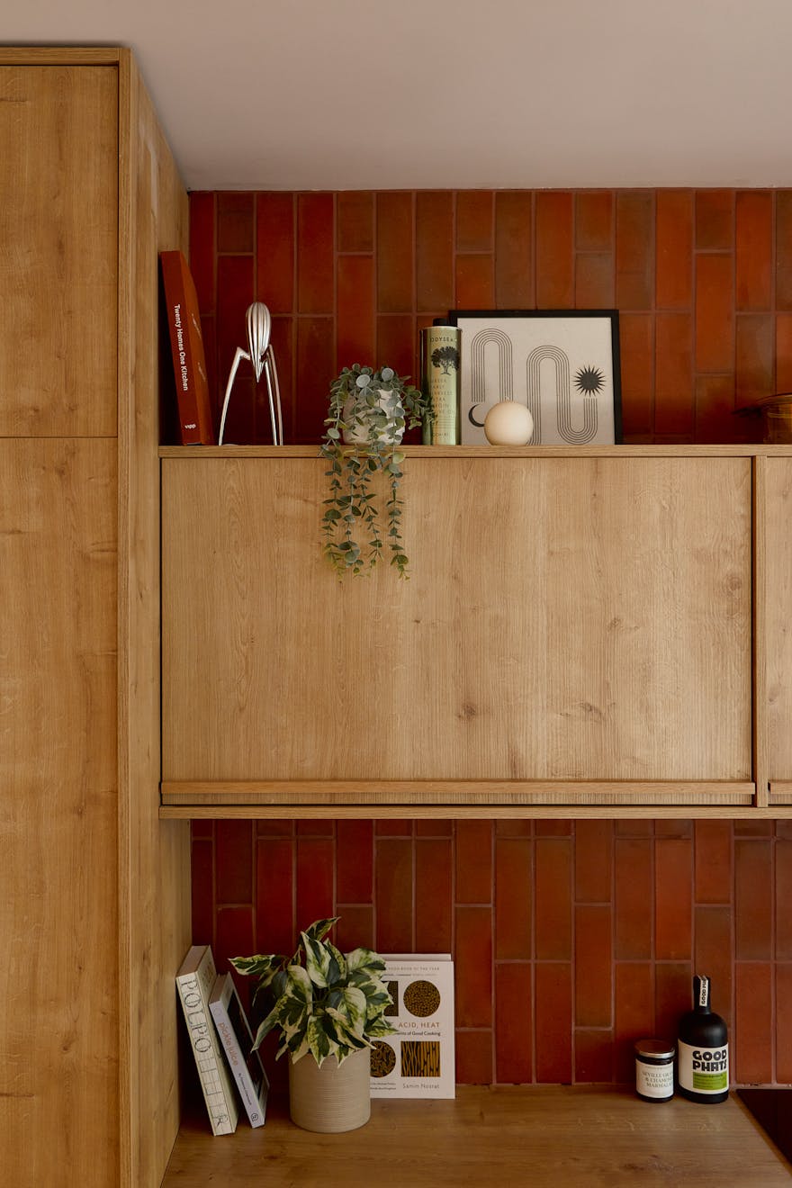 Artform’s interior design partners Scenesmith have worked in collaboration with Leicht, a carbon-neutral manufacturer, on the colourful ‘Kyoto’ kitchen, which references Japanese minimalism and imbues the space with warmth and quality. The striking kitchen island is clad in quarry tiles and topped with chestnut-flecked terrazzo. Integrated Siemens appliances are paired with a brass Quooker hot tap. A separate utility room is neatly tucked away, alongside additional storage for coats and bags.