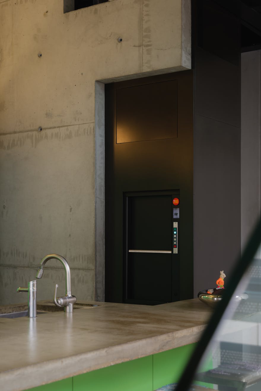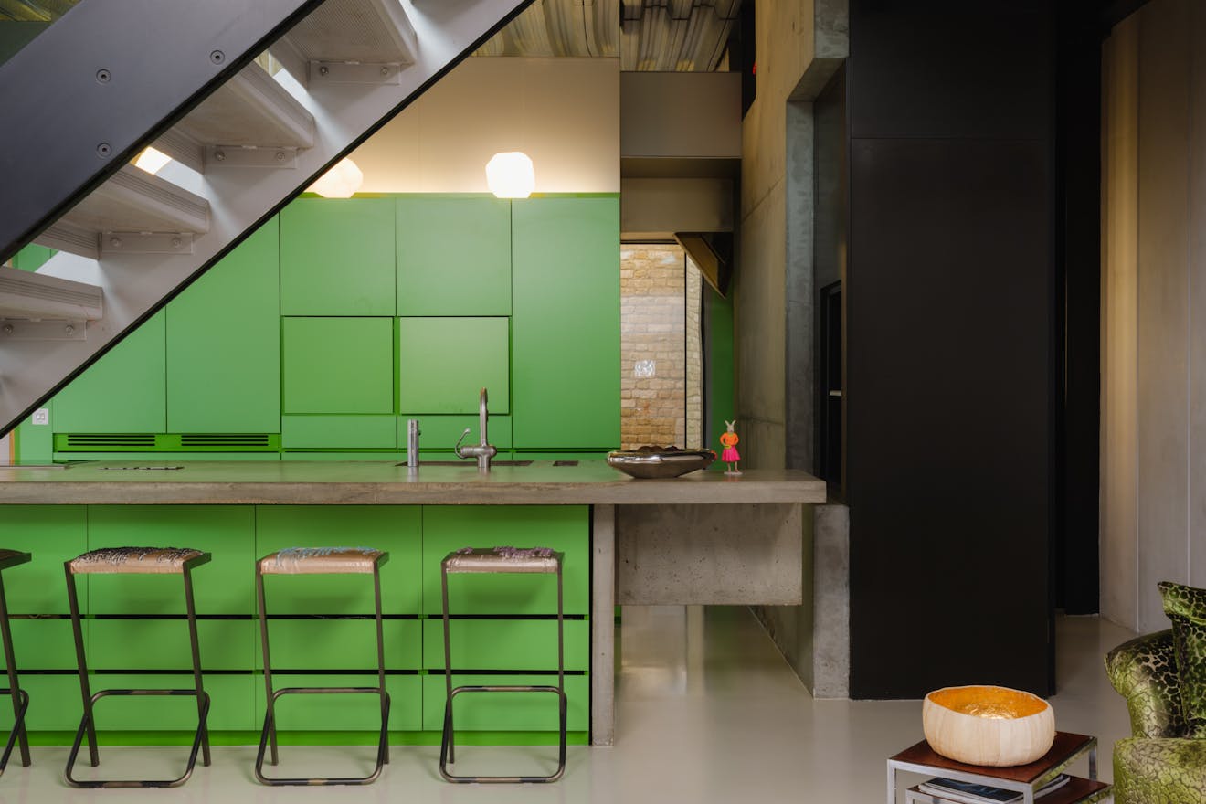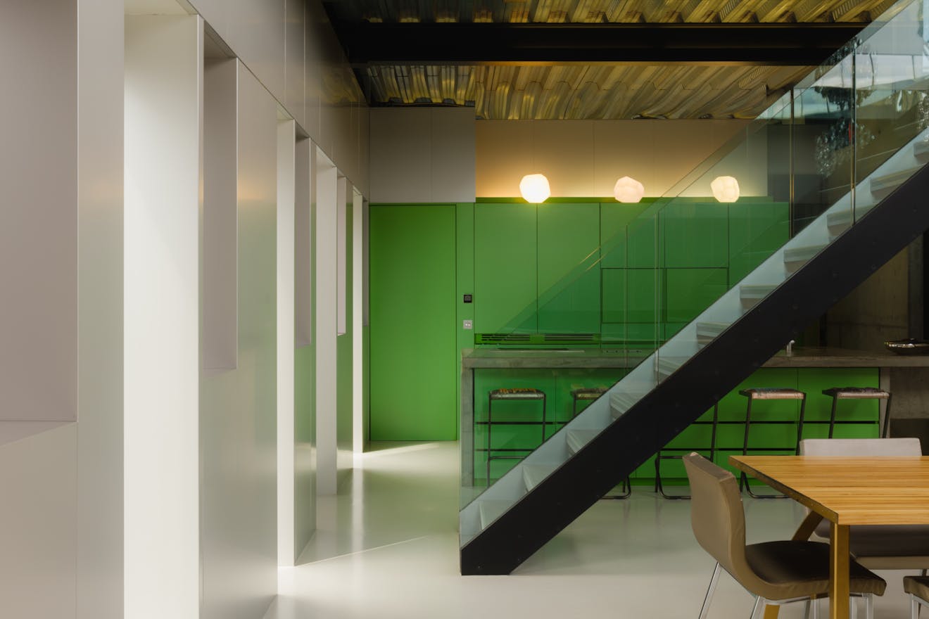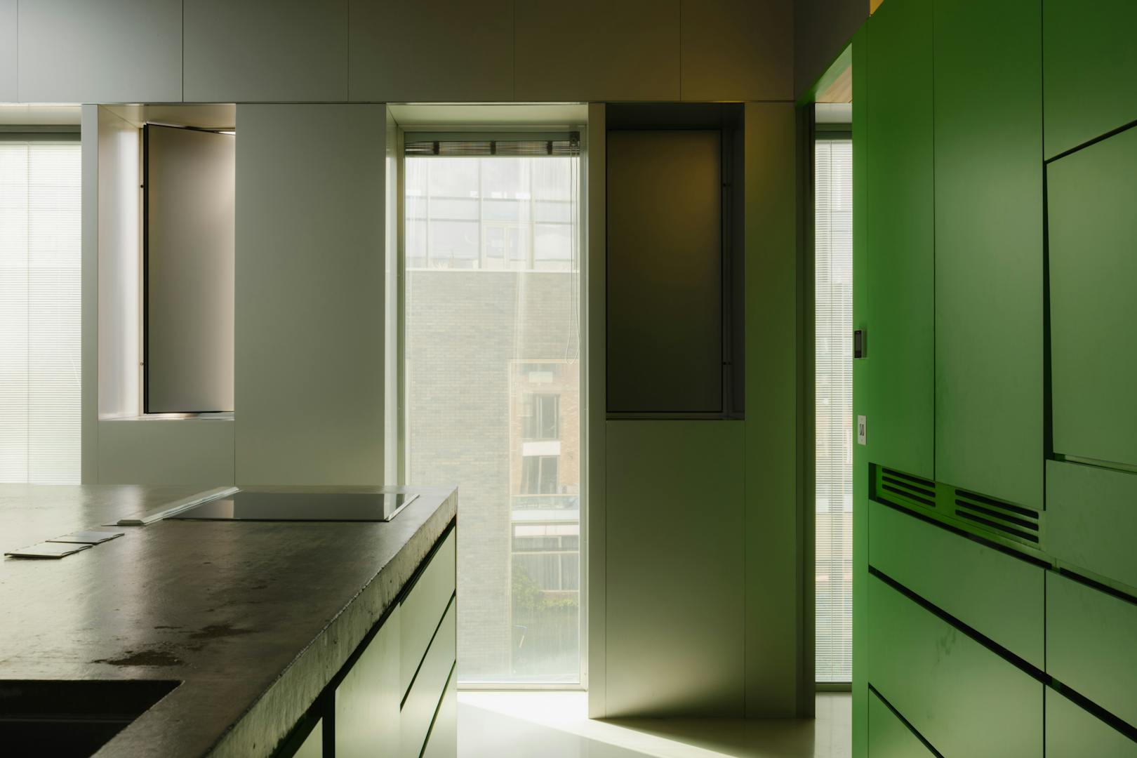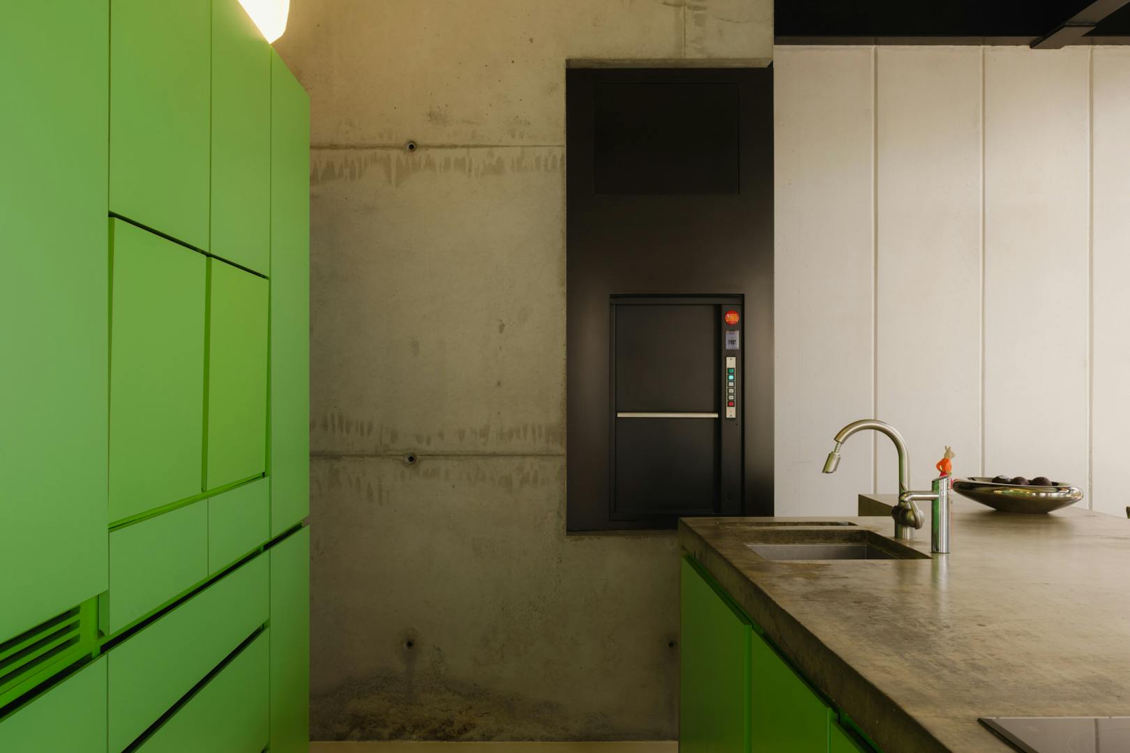 The kitchen itself is a testament to the architect's approach to detail — the primary palette of concrete and steel is offset by zest-green cabinetry, and the space is thoughtfully designed to reduce the need for furniture.