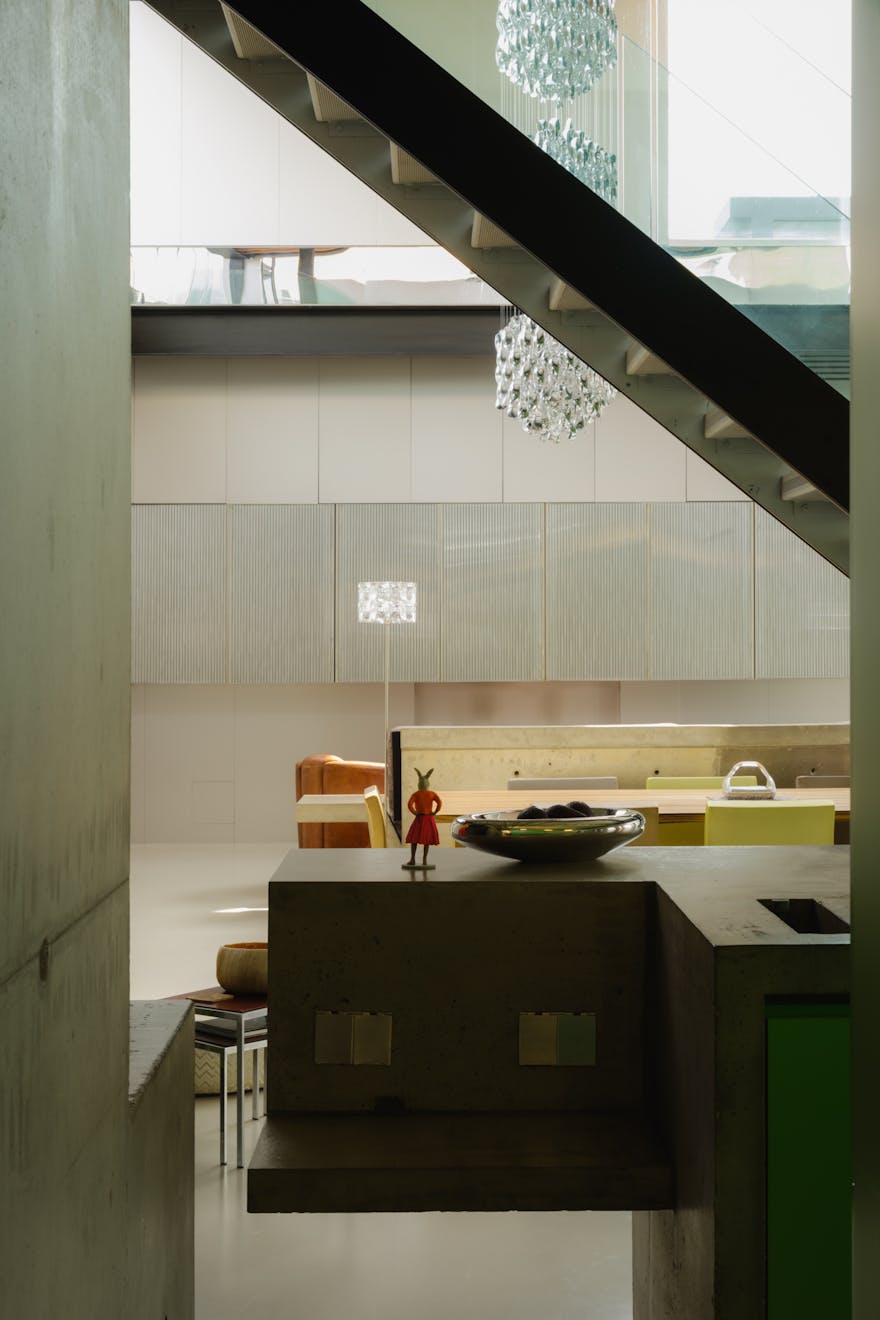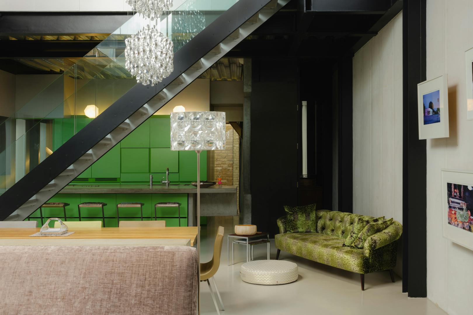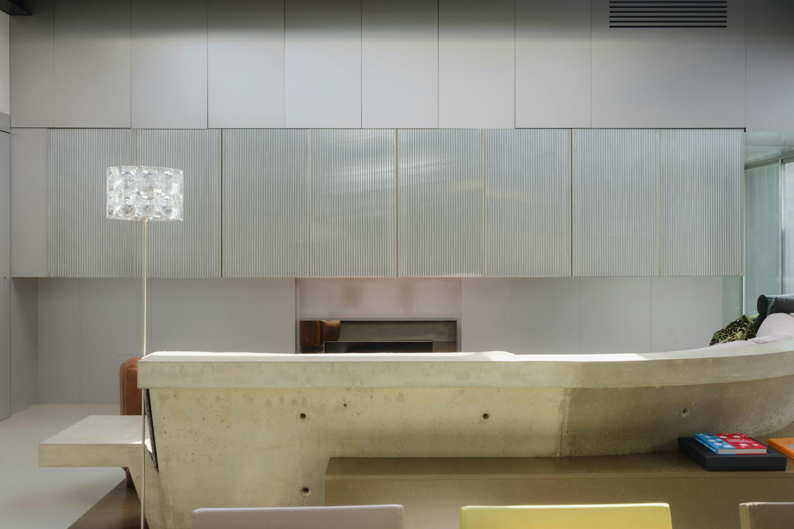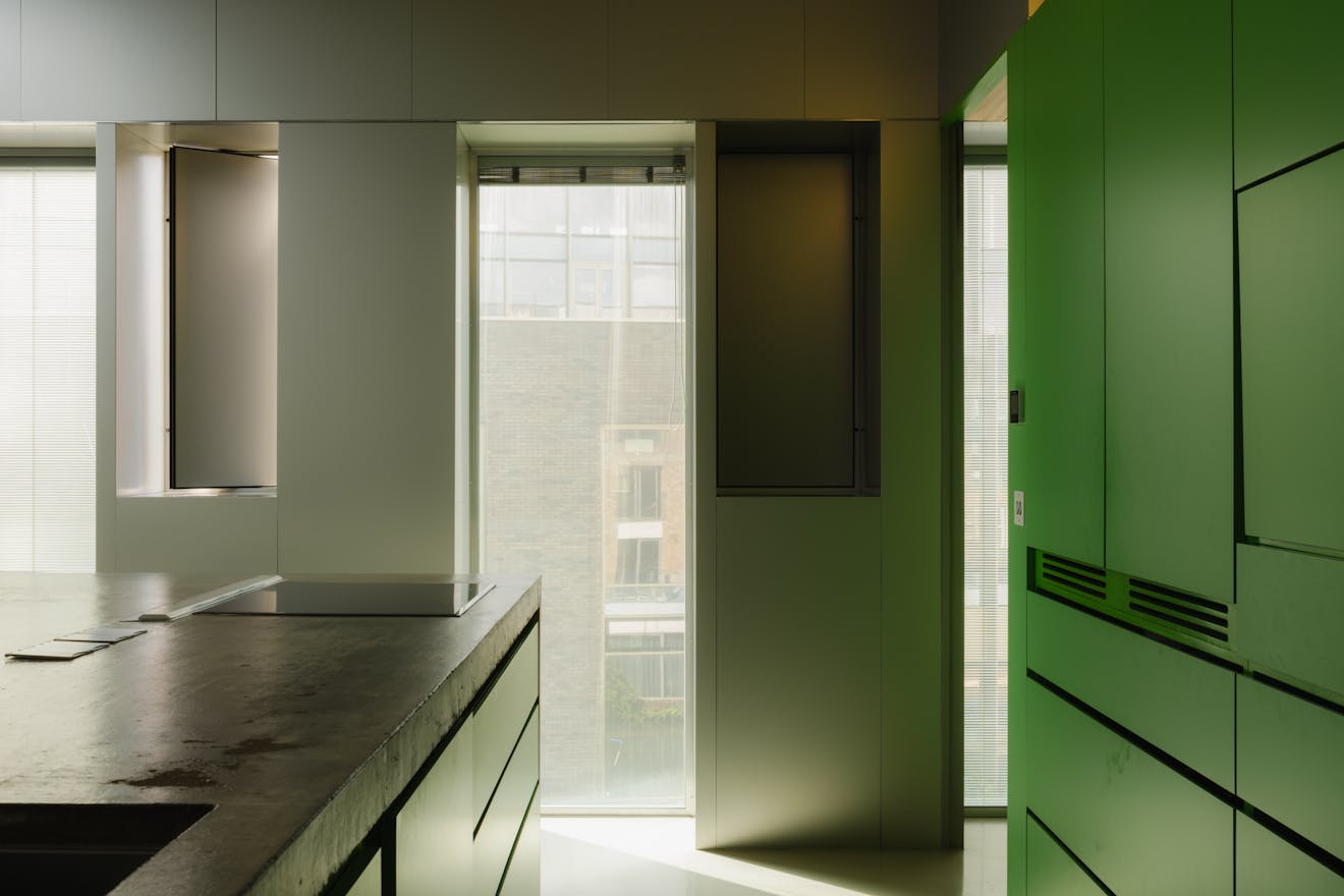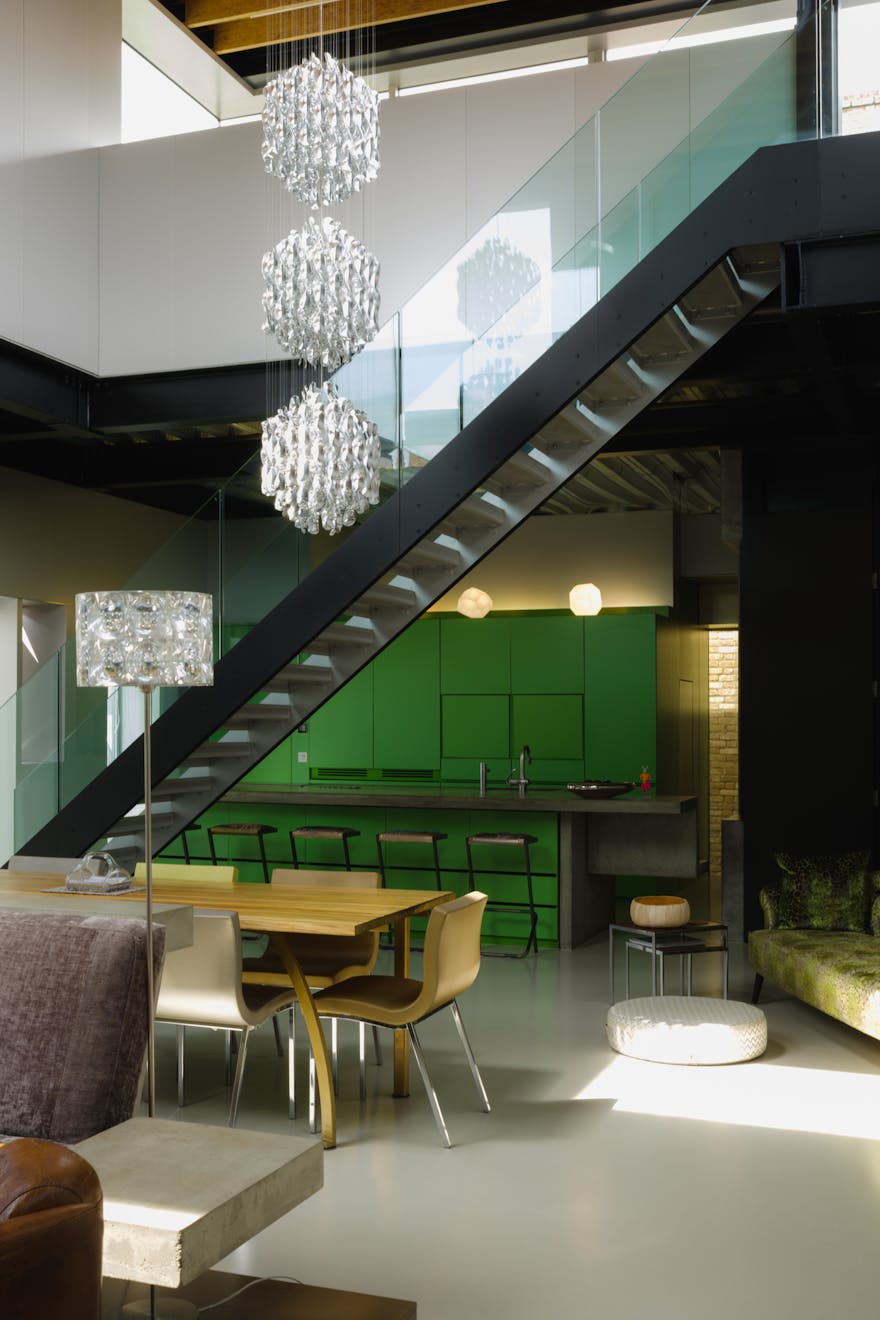 The kitchen itself is a testament to the architect's approach to detail — the primary palette of concrete and steel is offset by zest-green cabinetry, and the space is thoughtfully designed to reduce the need for furniture.