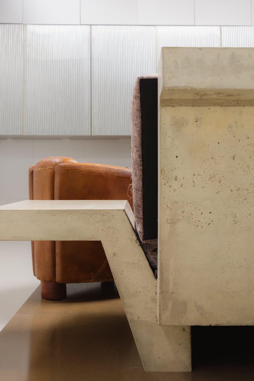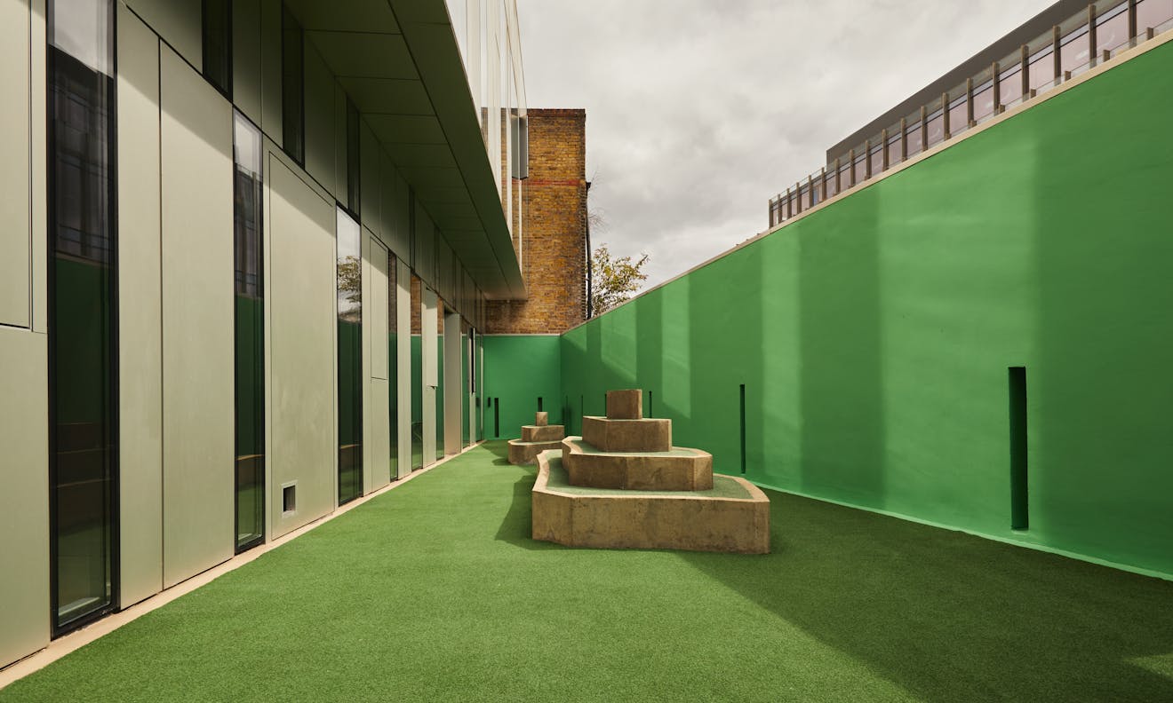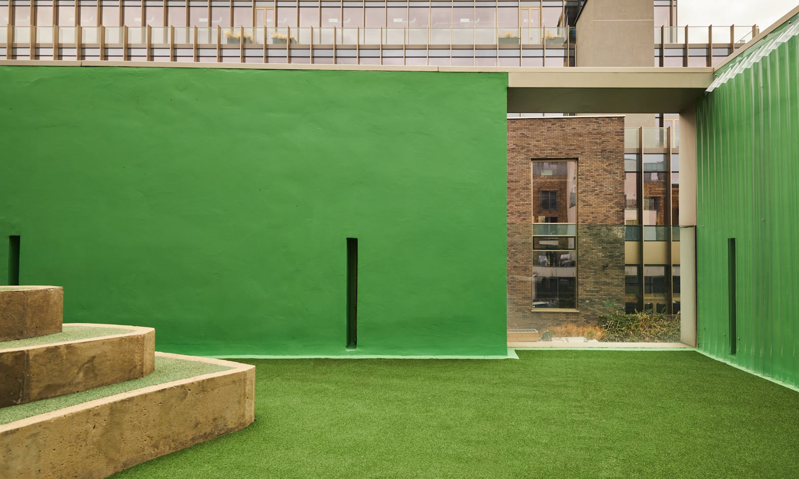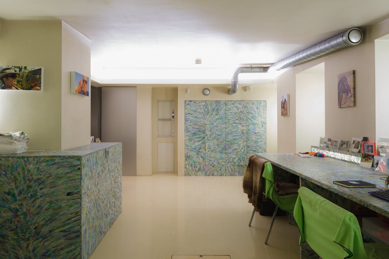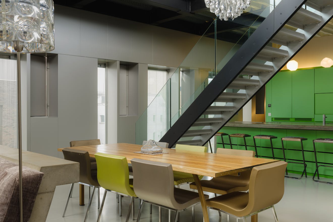 The kitchen itself is a testament to the architect's approach to detail — the primary palette of concrete and steel is offset by zest-green cabinetry, and the space is thoughtfully designed to reduce the need for furniture.