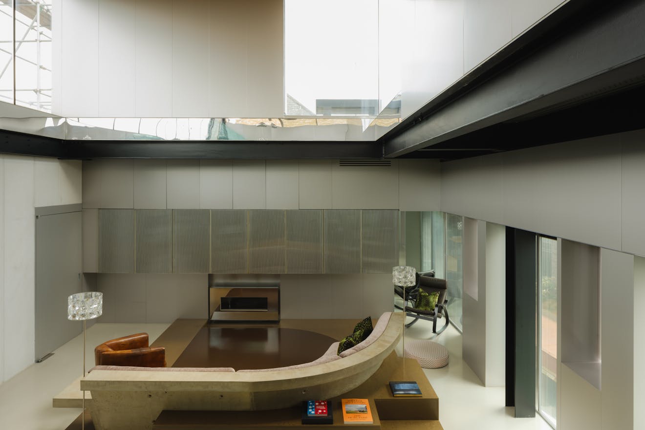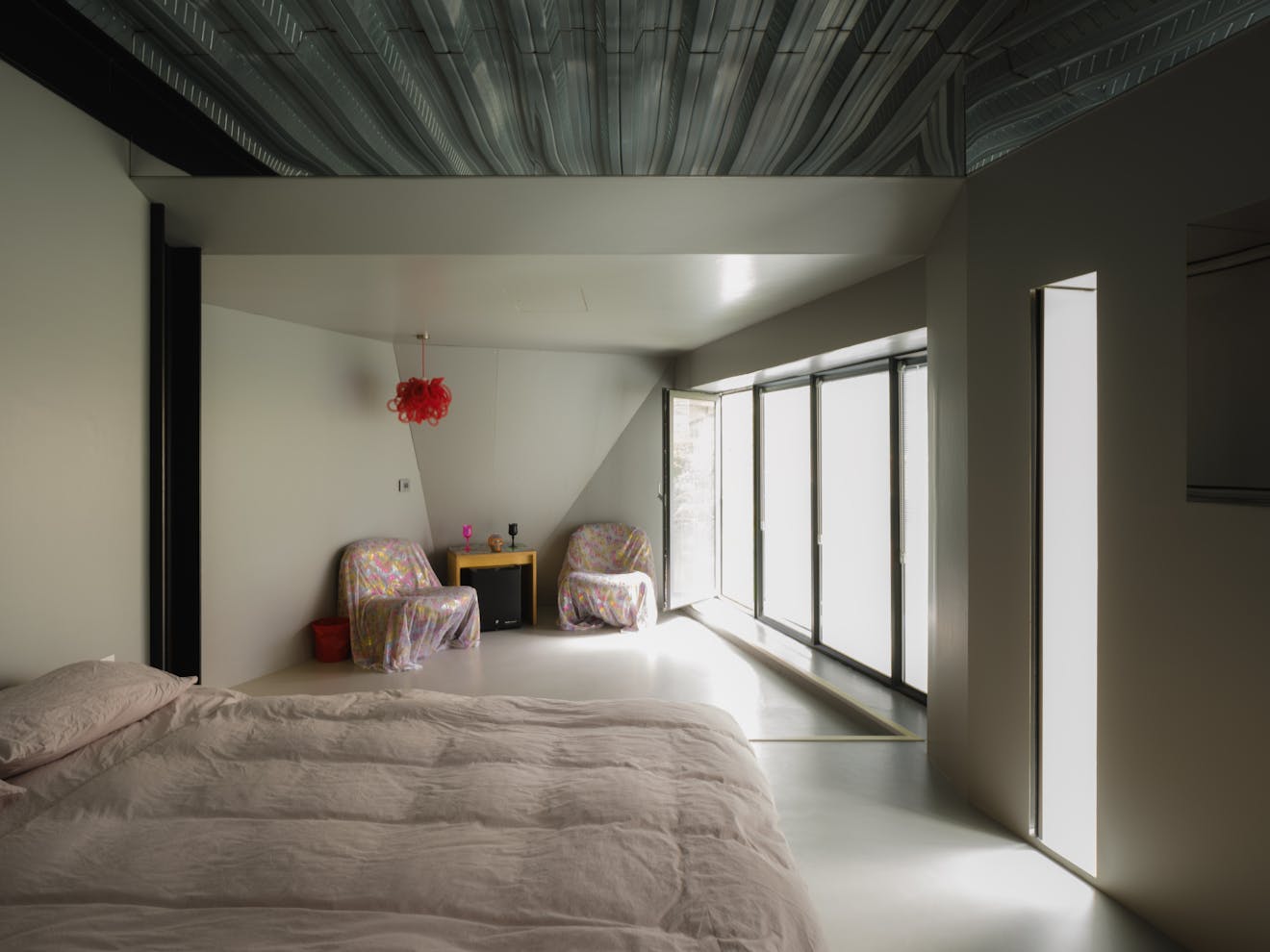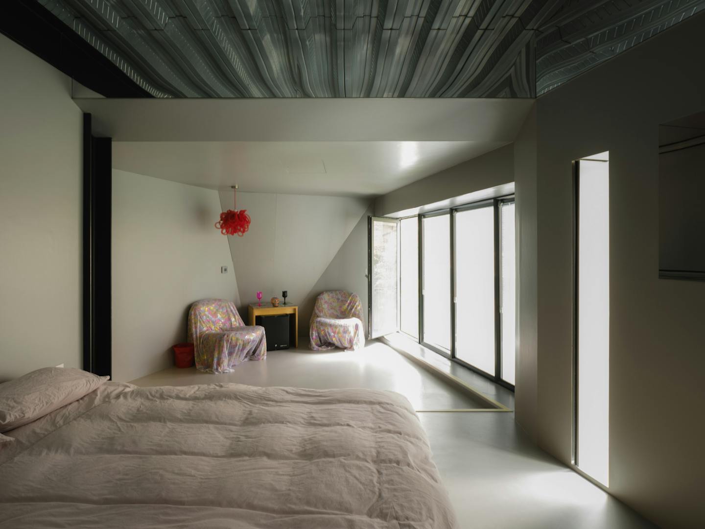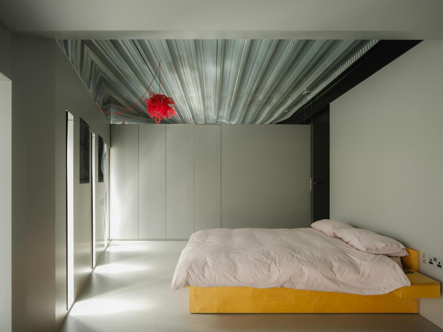 On the ground floor, there are two further rooms that express the more intimate traits of the house; a cork-clad music room and library, and a guest room with a dedicated shower space and concealed storage. Exposed steel beams stretch overhead with rows of corrugated steel between them, flooding the space with light coming from strip windows and glass doors that open directly onto the canal. The lower ground floor is designed as a utility space and home office, conveniently connected to the kitchen by a dumbwaiter.