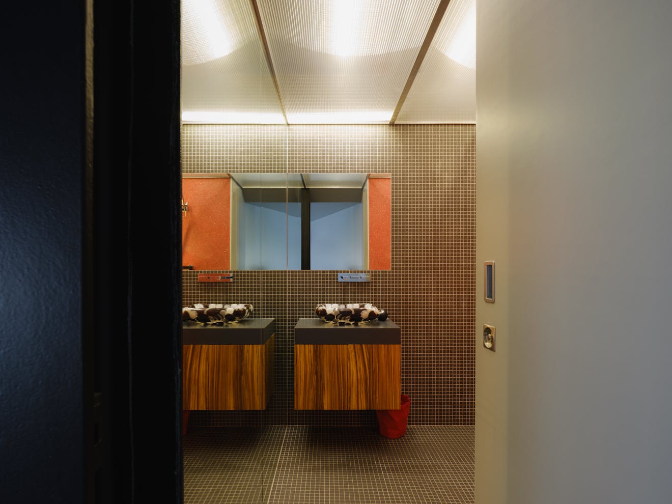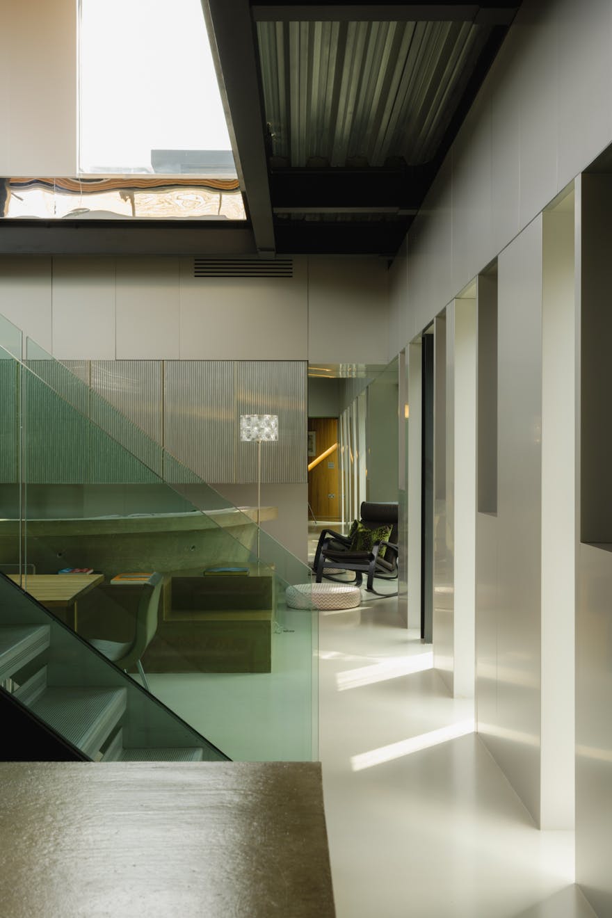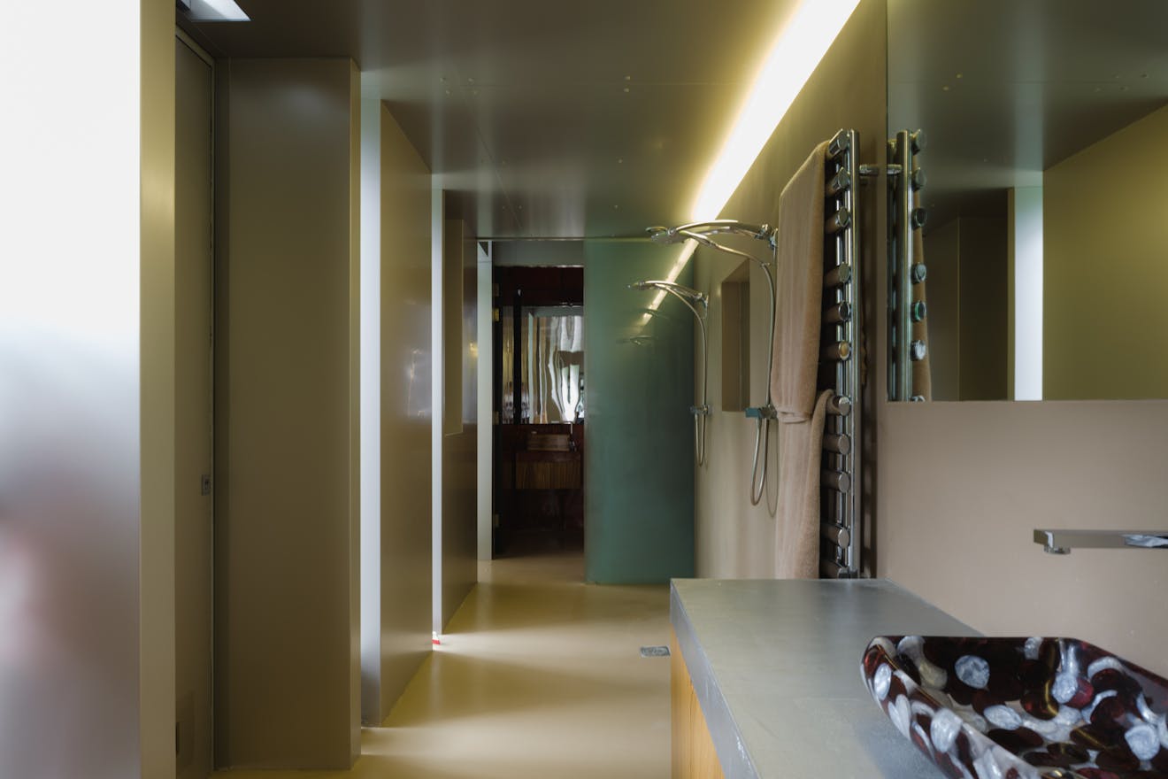 On the ground floor, there are two further rooms that express the more intimate traits of the house; a cork-clad music room and library, and a guest room with a dedicated shower space and concealed storage. Exposed steel beams stretch overhead with rows of corrugated steel between them, flooding the space with light coming from strip windows and glass doors that open directly onto the canal. The lower ground floor is designed as a utility space and home office, conveniently connected to the kitchen by a dumbwaiter.
