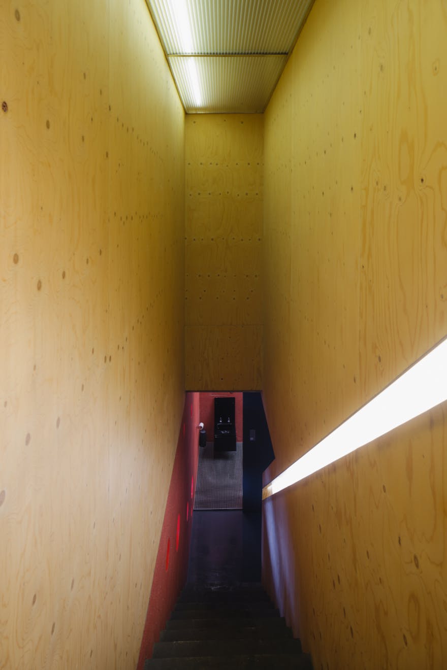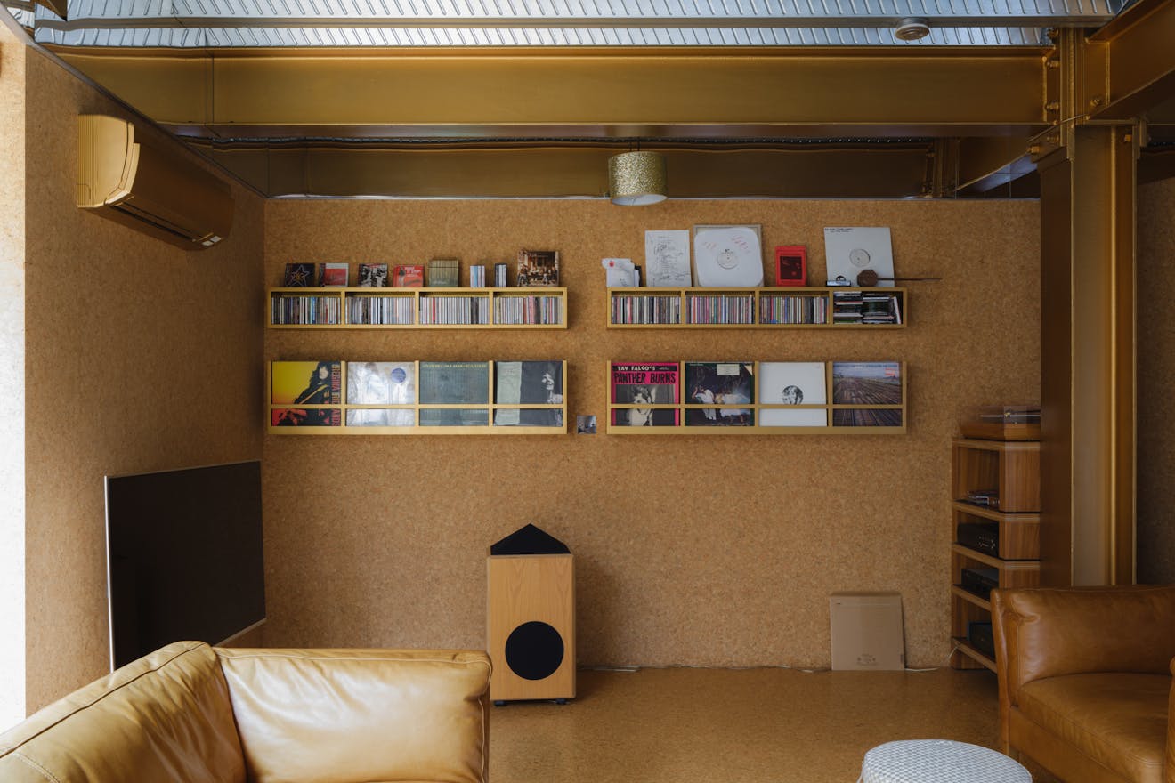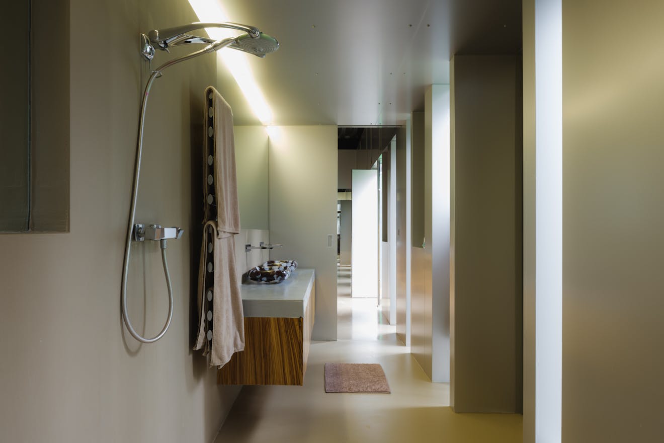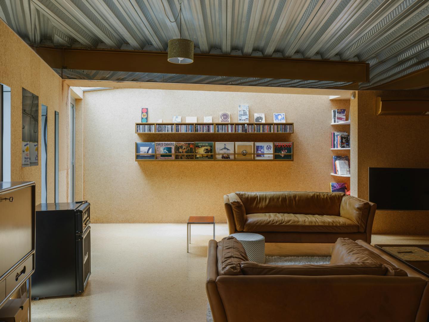 On the ground floor, there are two further rooms that express the more intimate traits of the house; a cork-clad music room and library, and a guest room with a dedicated shower space and concealed storage. Exposed steel beams stretch overhead with rows of corrugated steel between them, flooding the space with light coming from strip windows and glass doors that open directly onto the canal. The lower ground floor is designed as a utility space and home office, conveniently connected to the kitchen by a dumbwaiter.