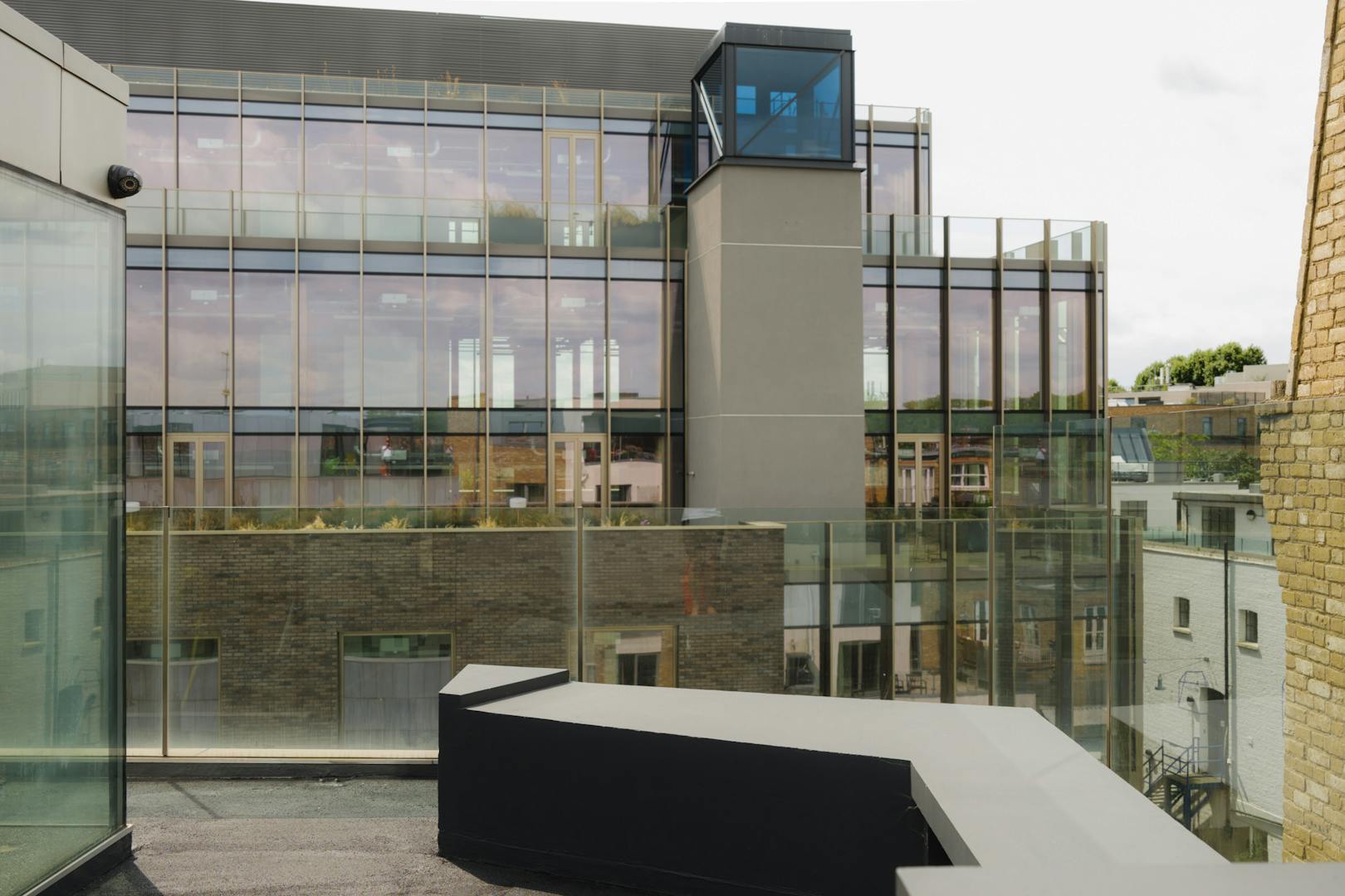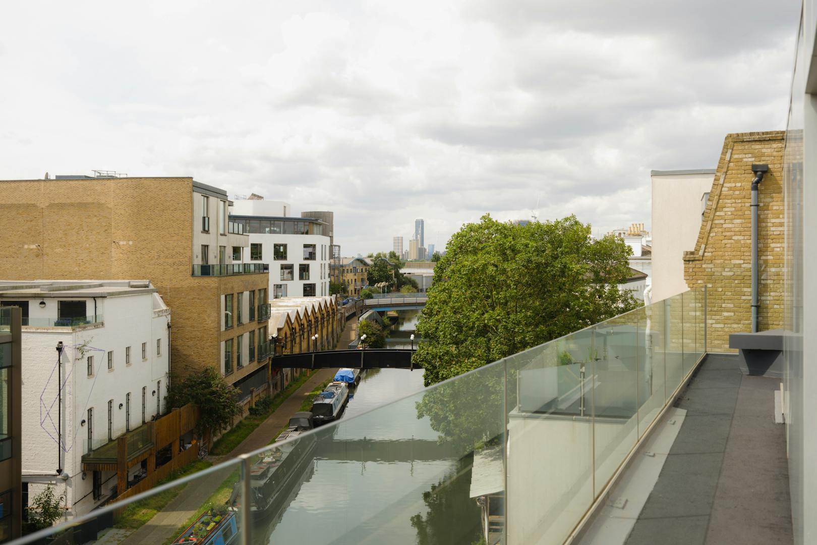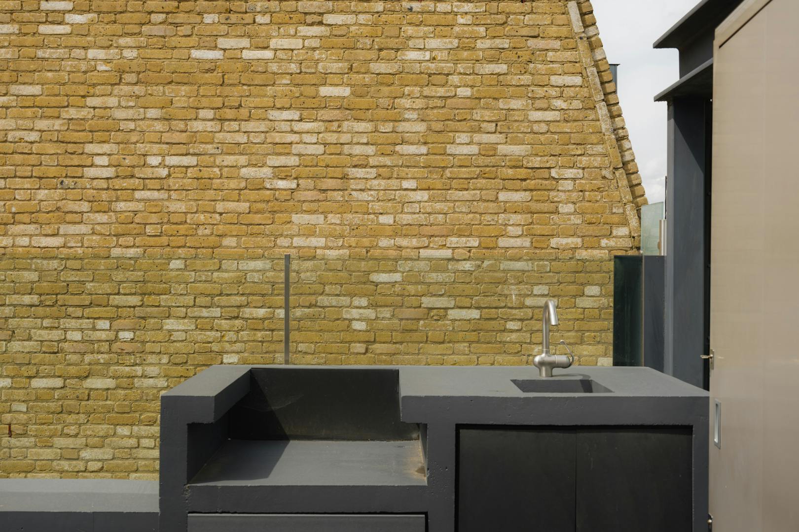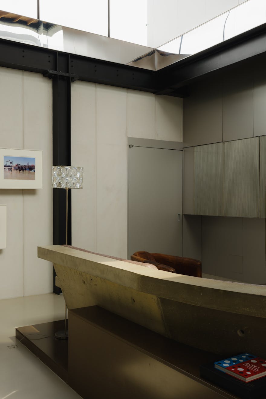 From materiality to arrangement, this home subverts convention. Each floor is fit for purpose and designed for living, entirely independent from what exists above and below. A dramatic stairwell — that simultaneously serves as an acoustic buffer — leads onto the second-floor living room and kitchen. An abundance of natural light highlights bespoke concrete elements arranged within aluminium and concrete walls, punctuated by a steel staircase. The stairs separate the dining area from the kitchen island, rising onto a south-facing roof garden with views of the canal, equipped with a bar for entertaining. Double-height ceilings and mirror-framed windows run the length of the upper walls, creating a sense of expansiveness.