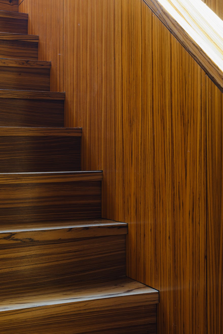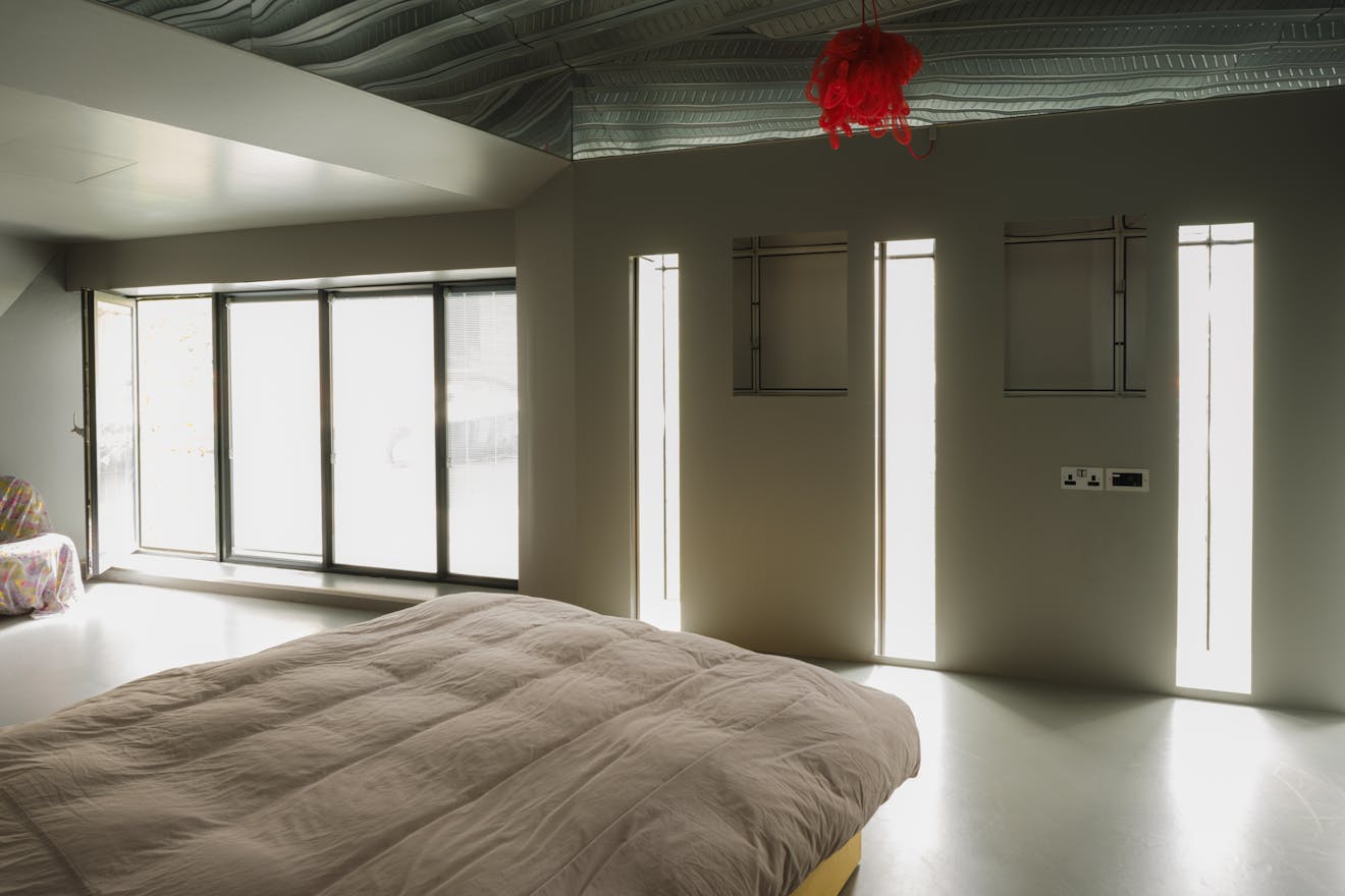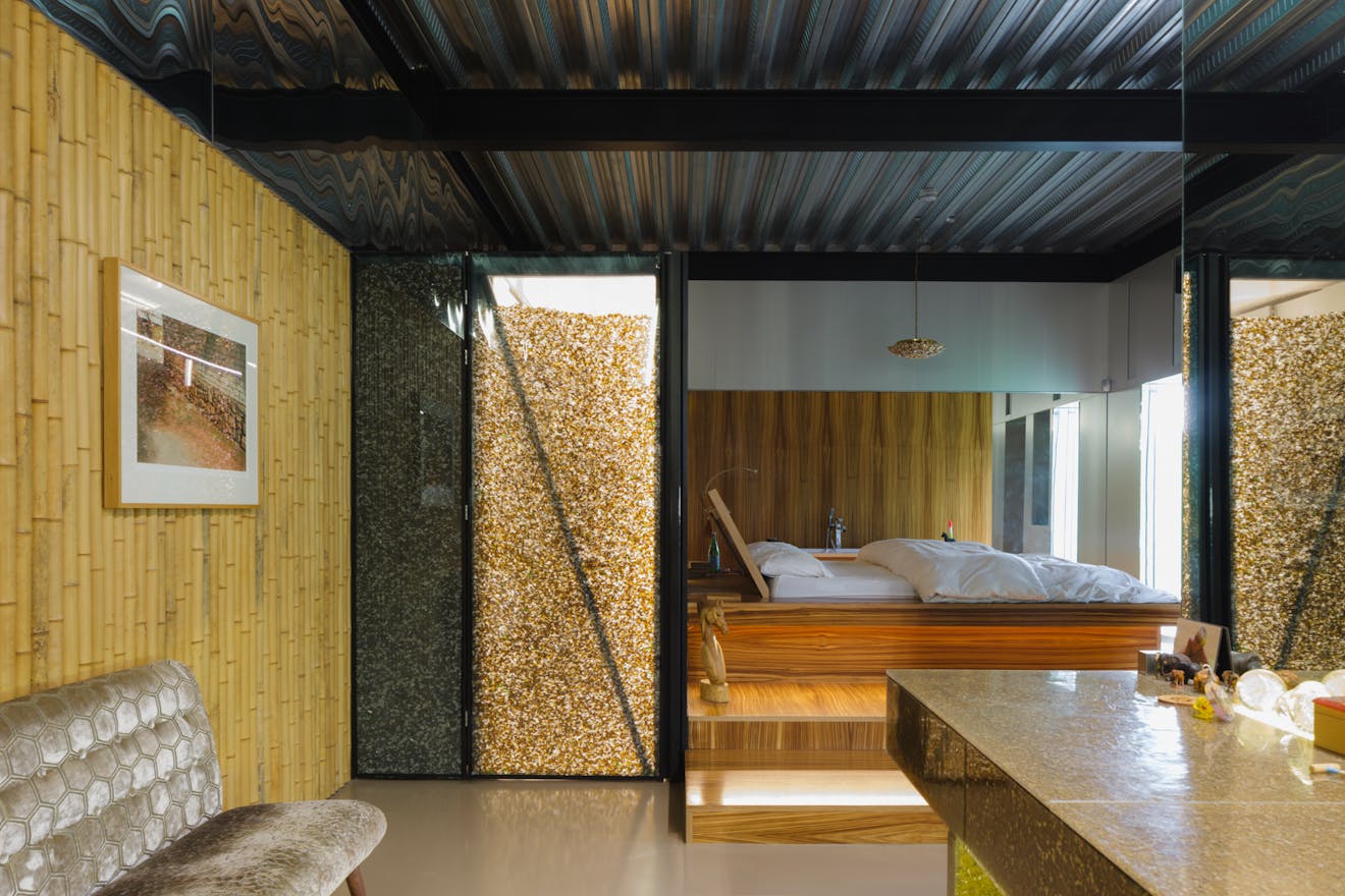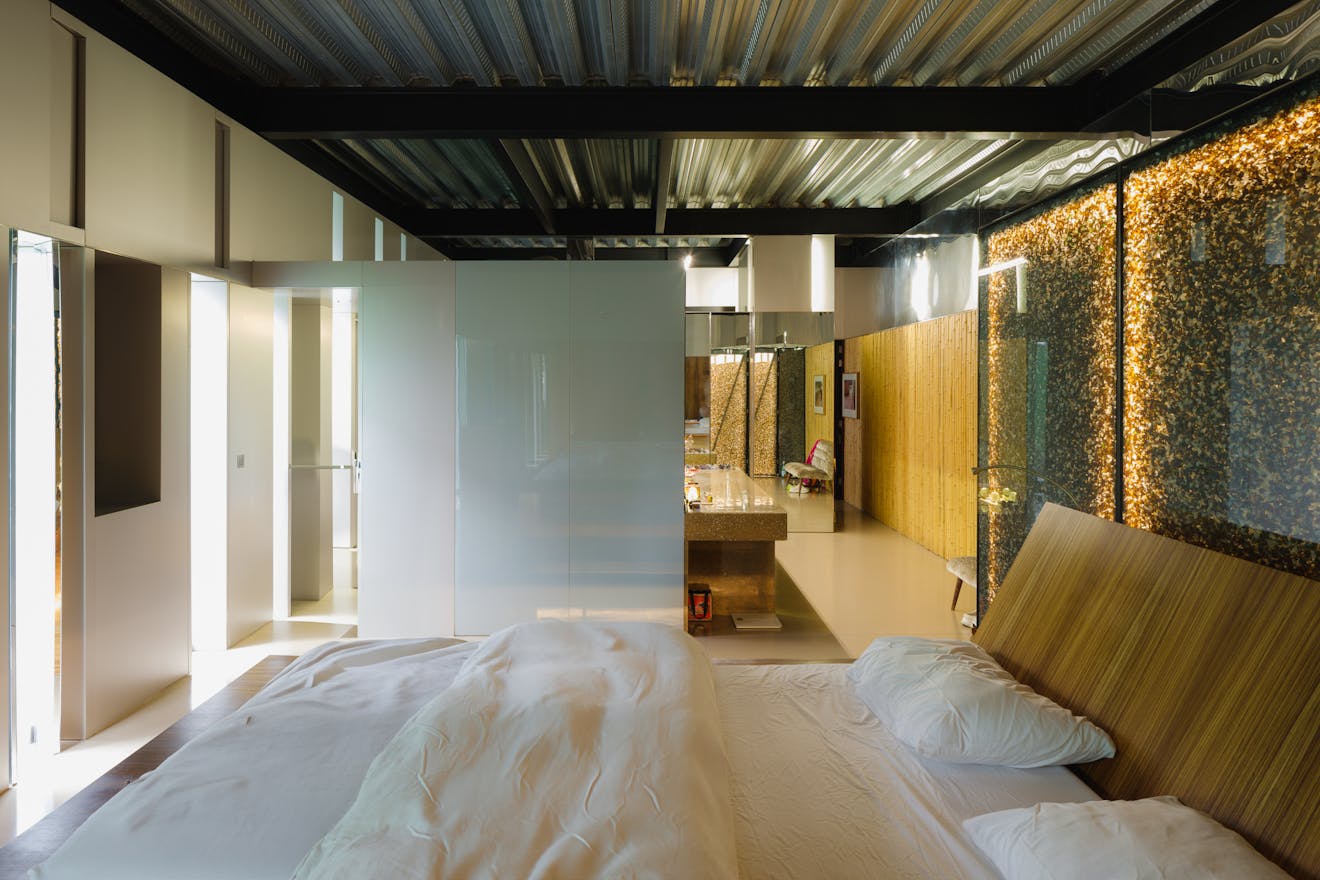A statement stairwell, made from Zebrano wood, descends from the living space into the master bedroom. The room is arranged around a dressing area and shower room, featuring a built-in Zebrano bed that backs onto a walk-in wardrobe constructed from glazed panels of broken coloured glass. Floor-to-ceiling windows fill the space with natural light, and multiple doors open onto a private terrace.