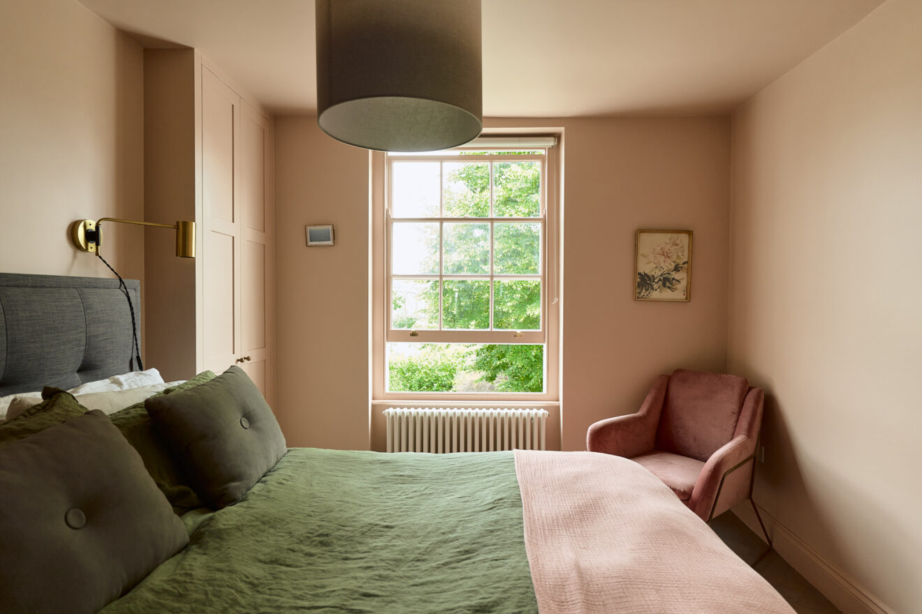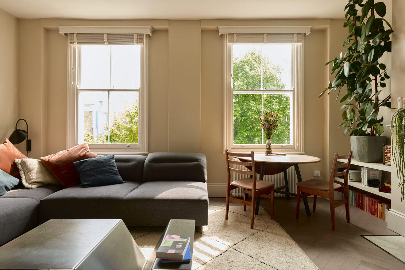The top floor is home to two generously proportioned bedrooms and a bathroom suite. The principal bedroom, finished in soft neutral tones, looks out across the leafy rear gardens, heightening its sense of calm. Across the hallway, a second double bedroom benefits from underfloor heating. The main bathroom also enjoys underfloor heating and is centred around a freestanding clawfoot bath, perfectly positioned to take in treetop views over De Beauvoir.