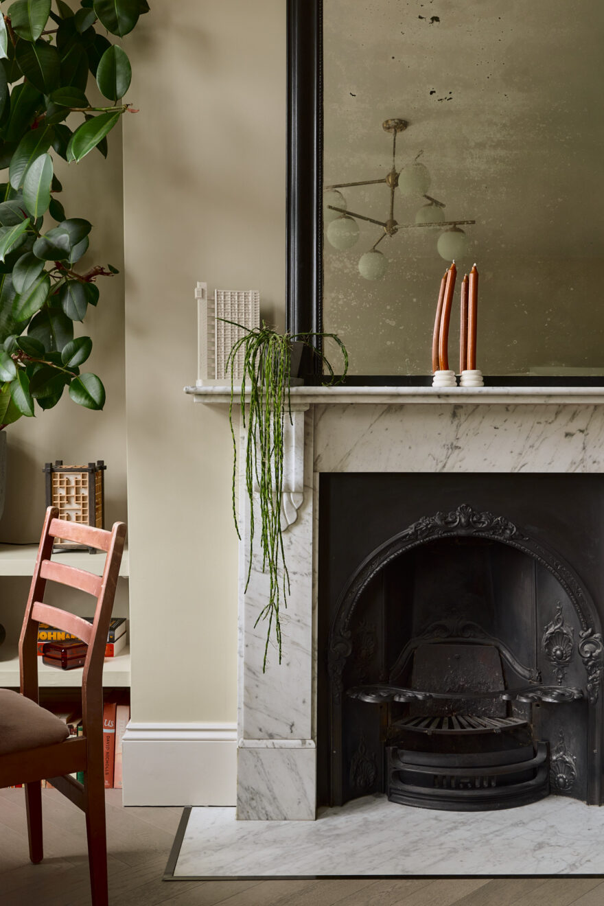 The entrance has beautifully laid Buff York stone paving and a meticulously repointed façade, finished in traditional lime mortar. The first floor is anchored by a beautifully proportioned reception room, where two generous sash windows draw in natural light and walls painted in Farrow & Ball’s Joa’s White. Oak parquet herringbone flooring runs underfoot, complemented by classic column radiators and centre piece marble fireplace that nod to the home’s Victorian origins.