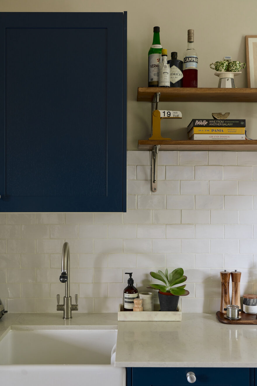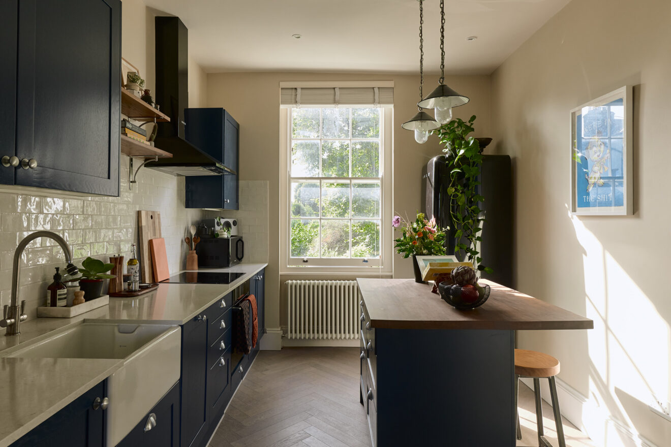 At the rear, the open-plan kitchen has a Belfast sink and deep-navy blue shaker cabinetry, contrasted by light quartz worktops. A timber-topped island provides a warm, tactile counterpoint and a natural gathering point within the space. Thanks to the home’s east–west orientation and open-plan layout, light moves effortlessly through the room from morning to evening.