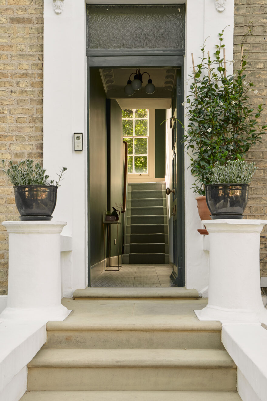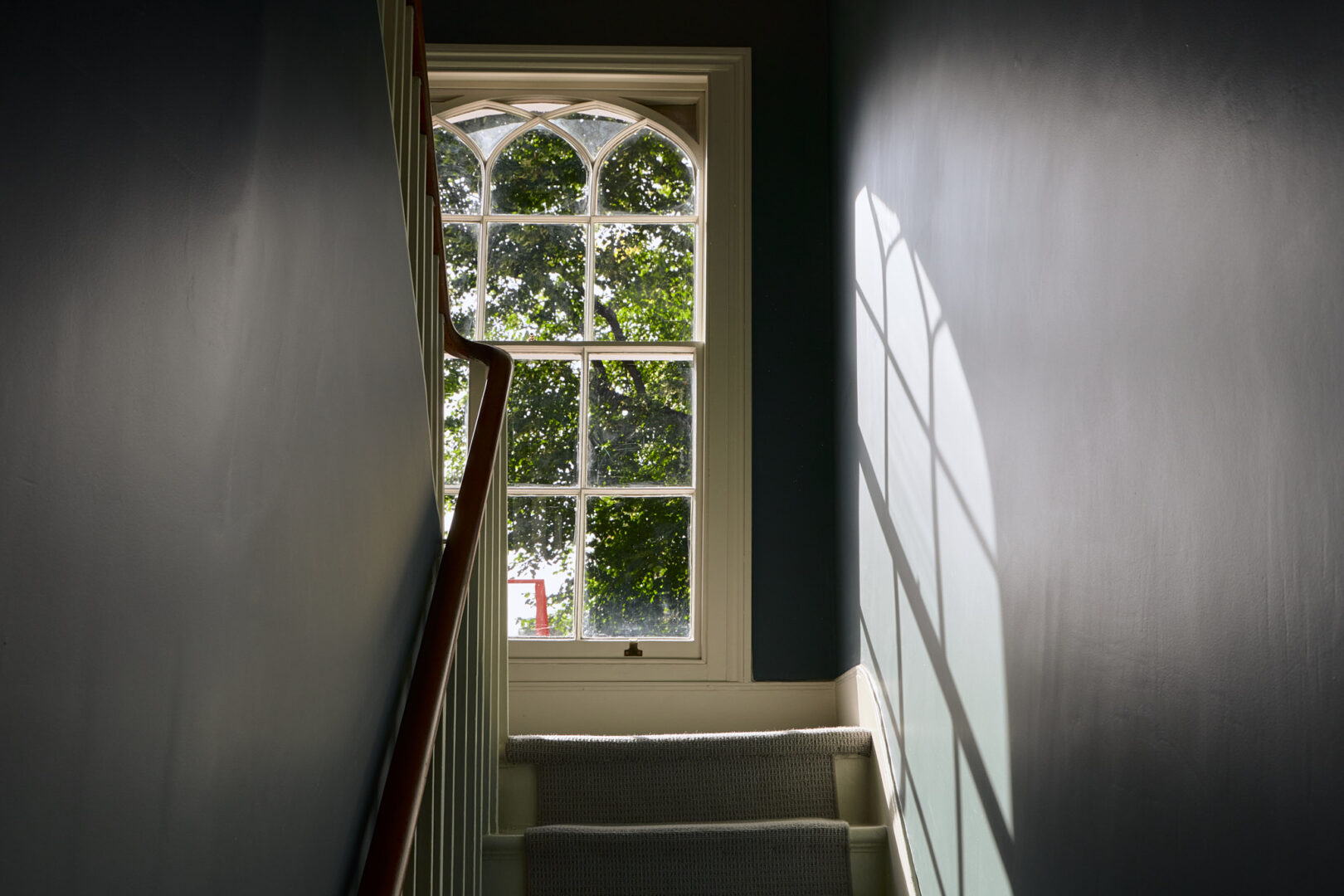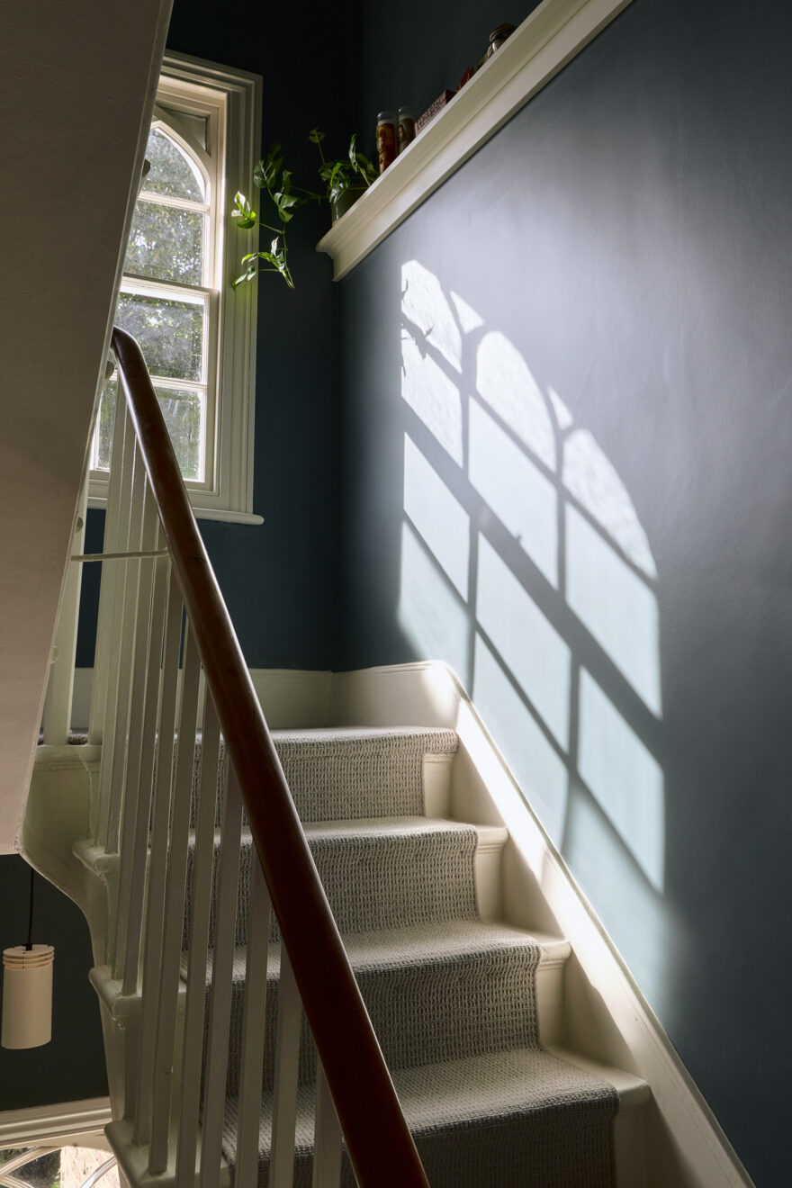 The hallway continues the theme of considered design, painted in Farrow & Ball Inchyra Blue which compliments the herringbone flooring leading the way beneath an original staircase, complete with its curved timber handrail and a classic runner. Light filters in through a series of original side-by-side sash windows, each elegantly framed by softly arched reveals. These subtle architectural details quietly underscore the home’s heritage. From the hallway, an iron staircase leads down into the west-facing, landscaped garden. Sheltered from neighbouring homes, this private retreat is ideal for morning coffee or a sundowner.