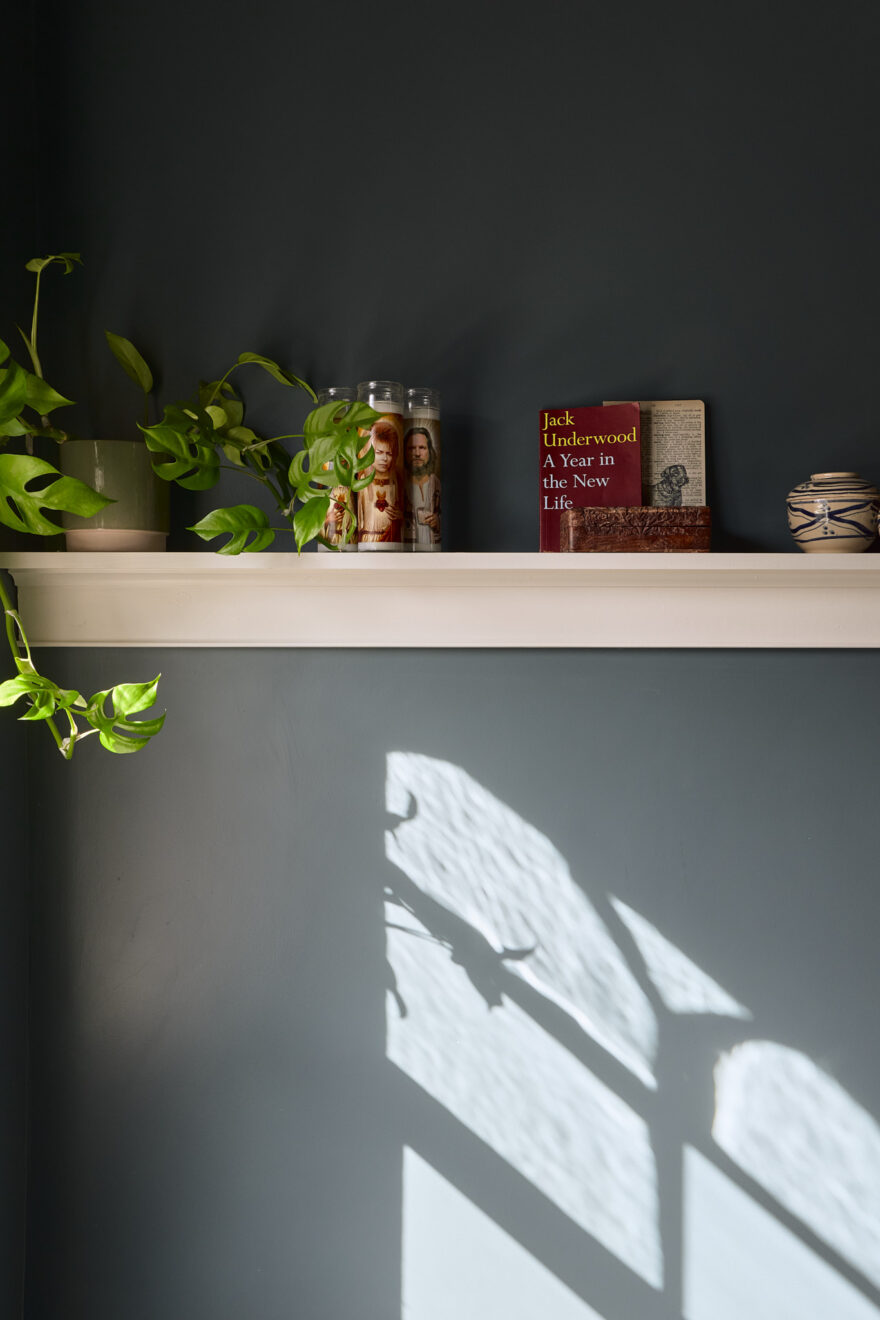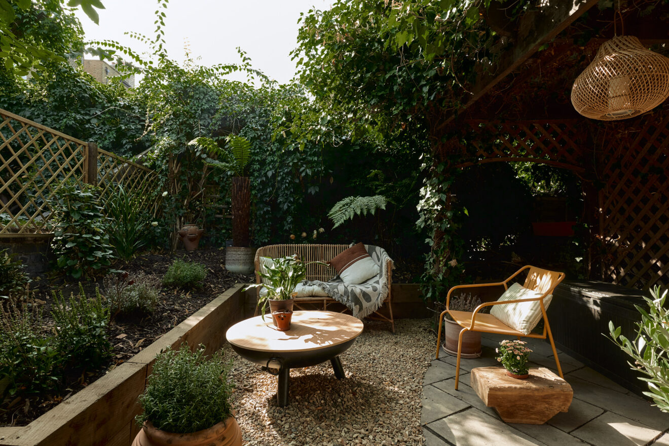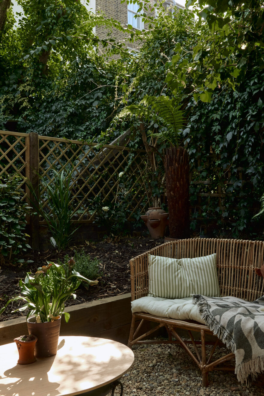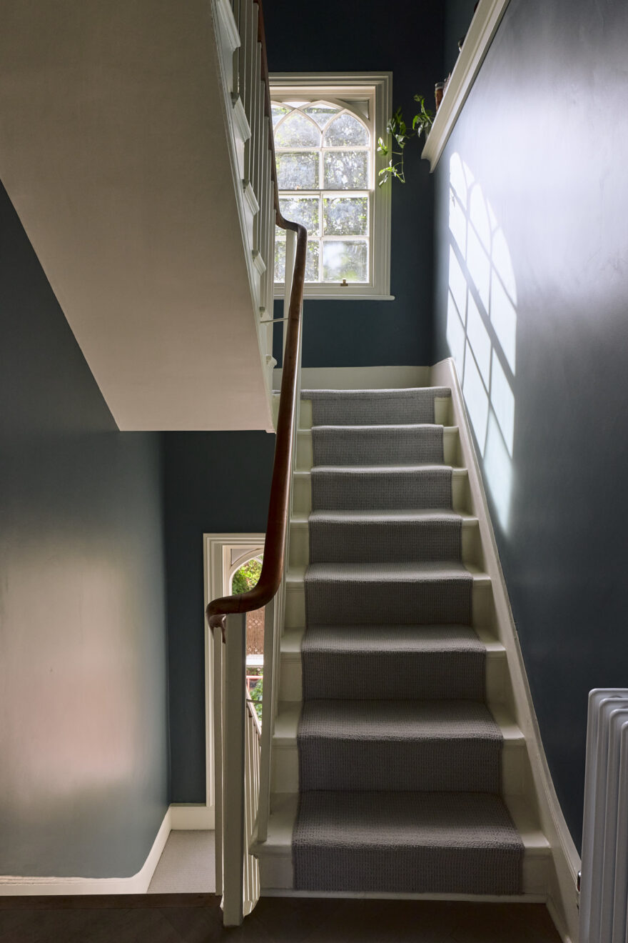 The hallway continues the theme of considered design, painted in Farrow & Ball Inchyra Blue which compliments the herringbone flooring leading the way beneath an original staircase, complete with its curved timber handrail and a classic runner. Light filters in through a series of original side-by-side sash windows, each elegantly framed by softly arched reveals. These subtle architectural details quietly underscore the home’s heritage. From the hallway, an iron staircase leads down into the west-facing, landscaped garden. Sheltered from neighbouring homes, this private retreat is ideal for morning coffee or a sundowner.