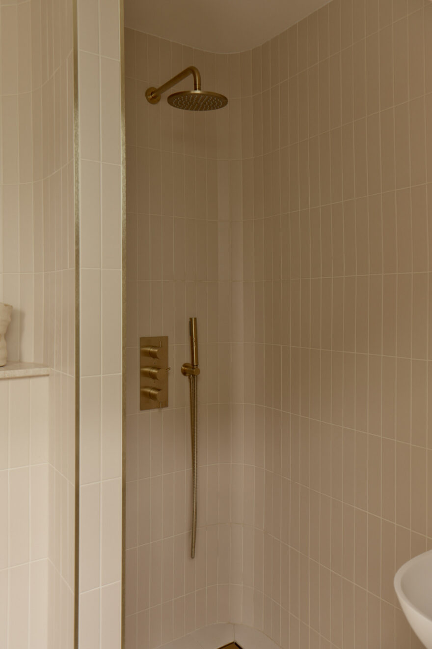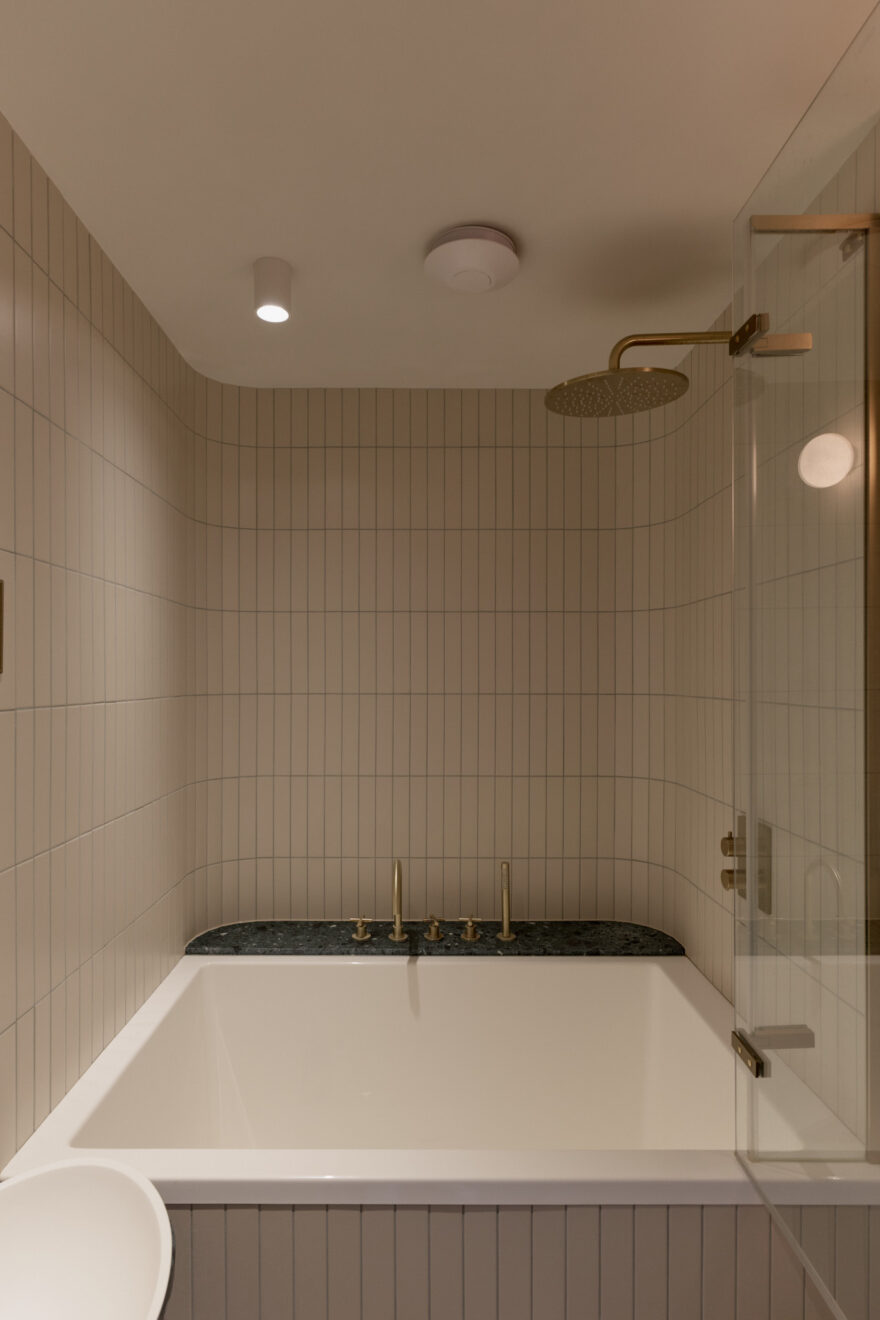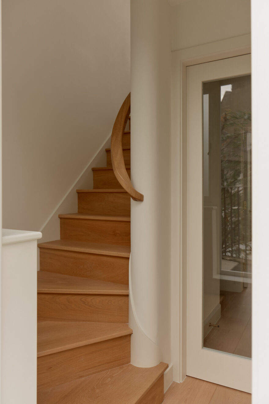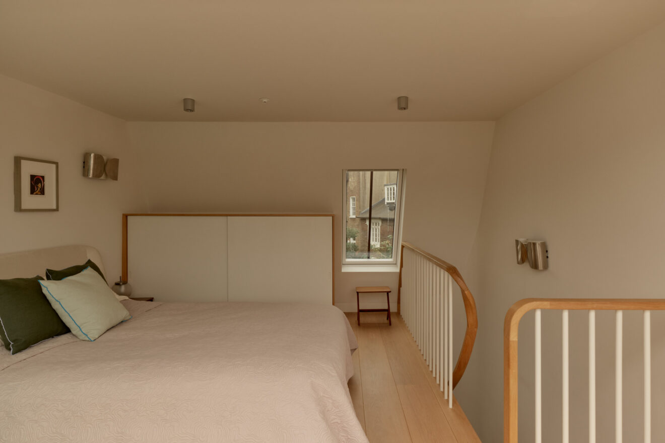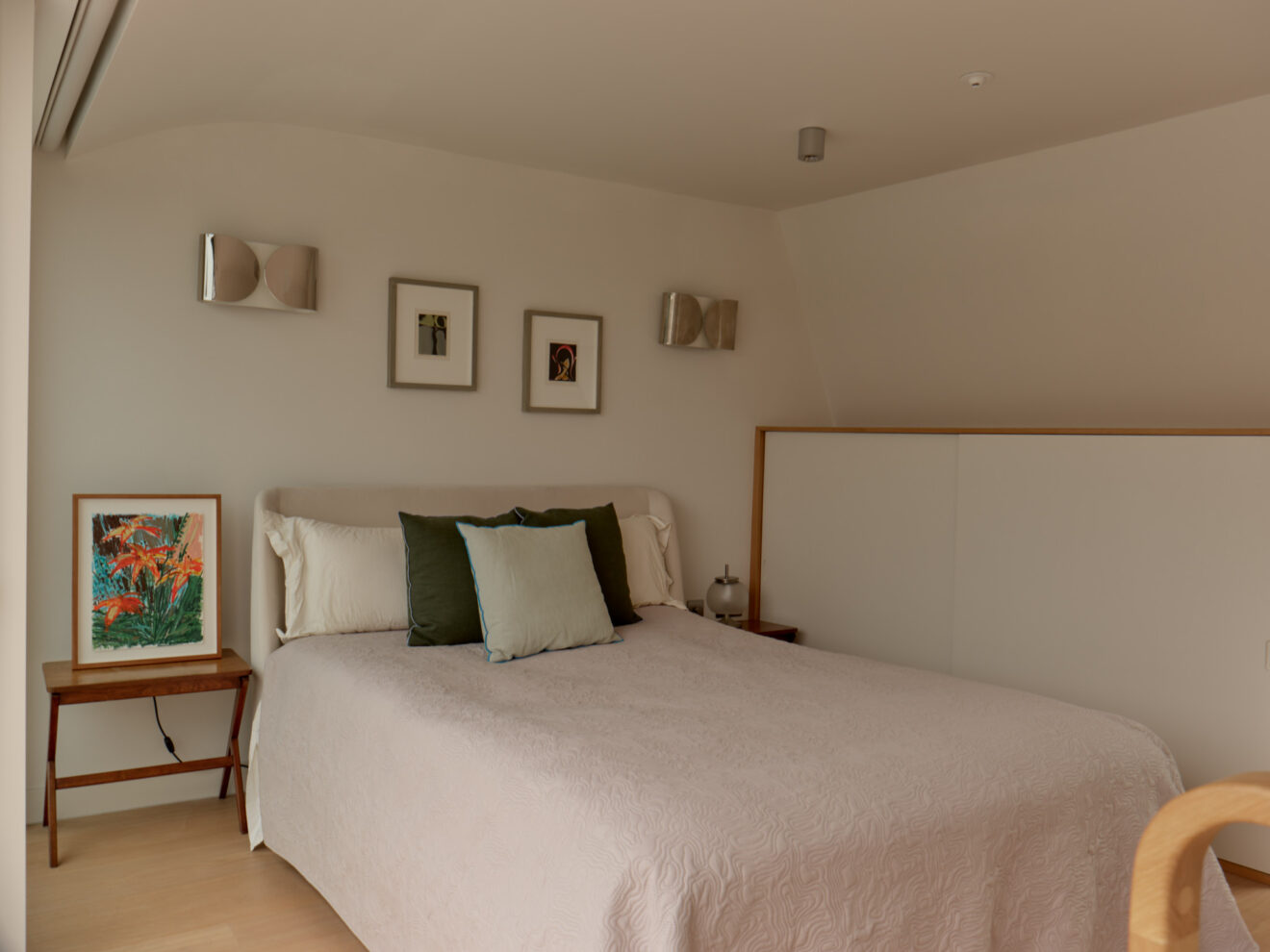 Ascending via a sculptural staircase with curved oak banister, the first floor reveals a generous bedroom and a beautifully appointed bathroom. Here, green marble accents add a rich, tactile quality, while a walk-in rainfall shower, soft terrazzo underfoot, and Flos lighting provide a spa-like experience.