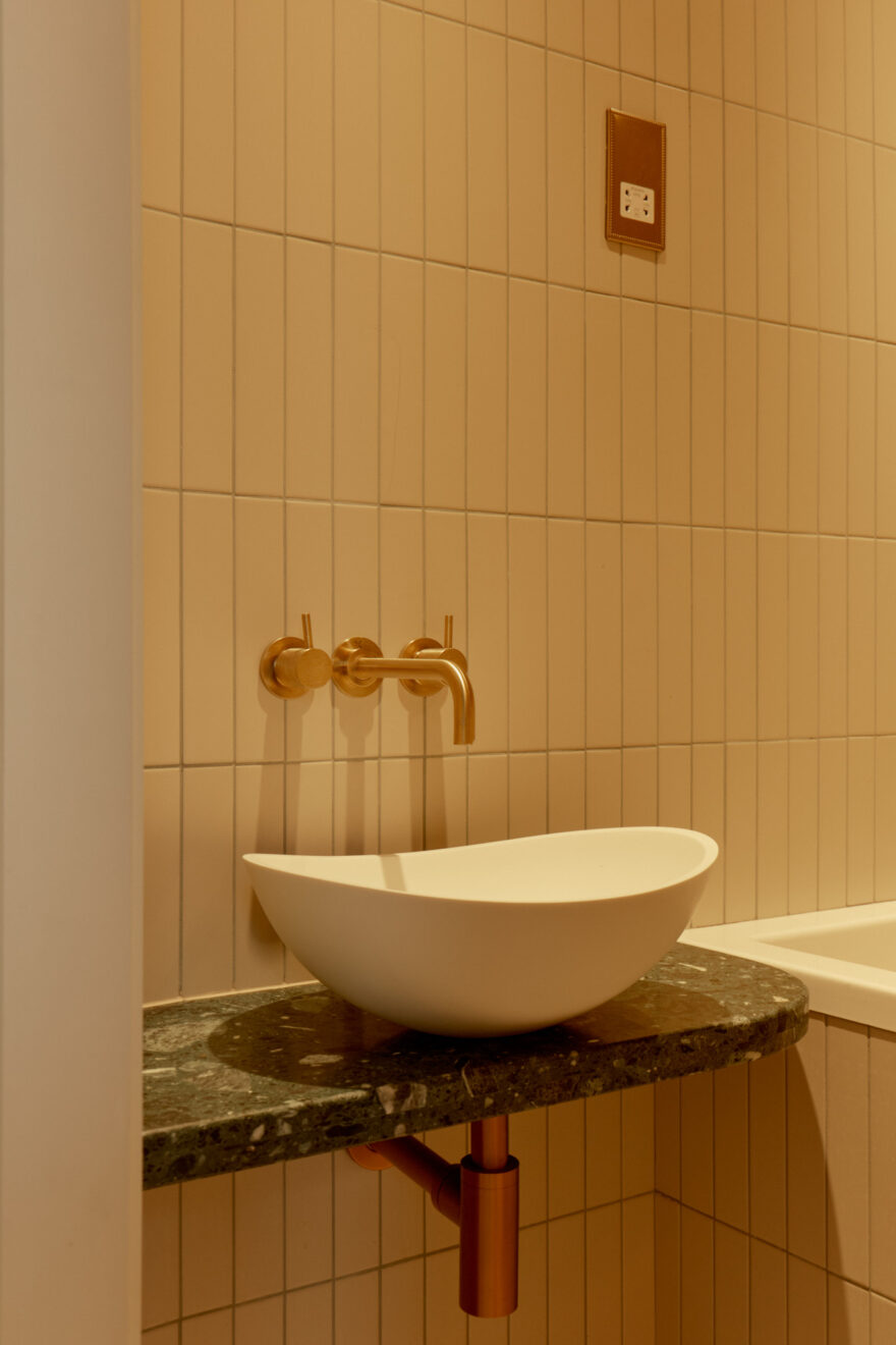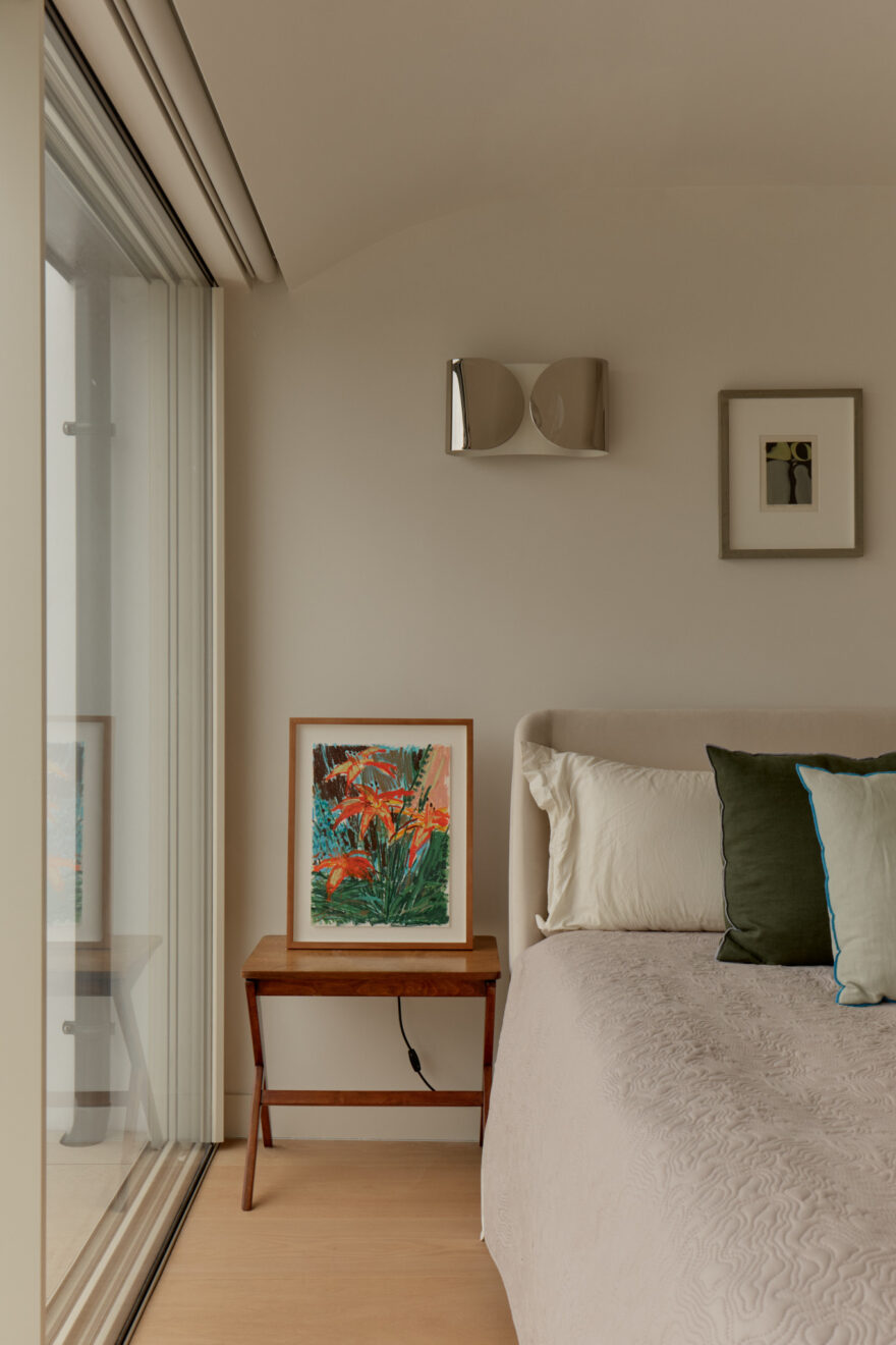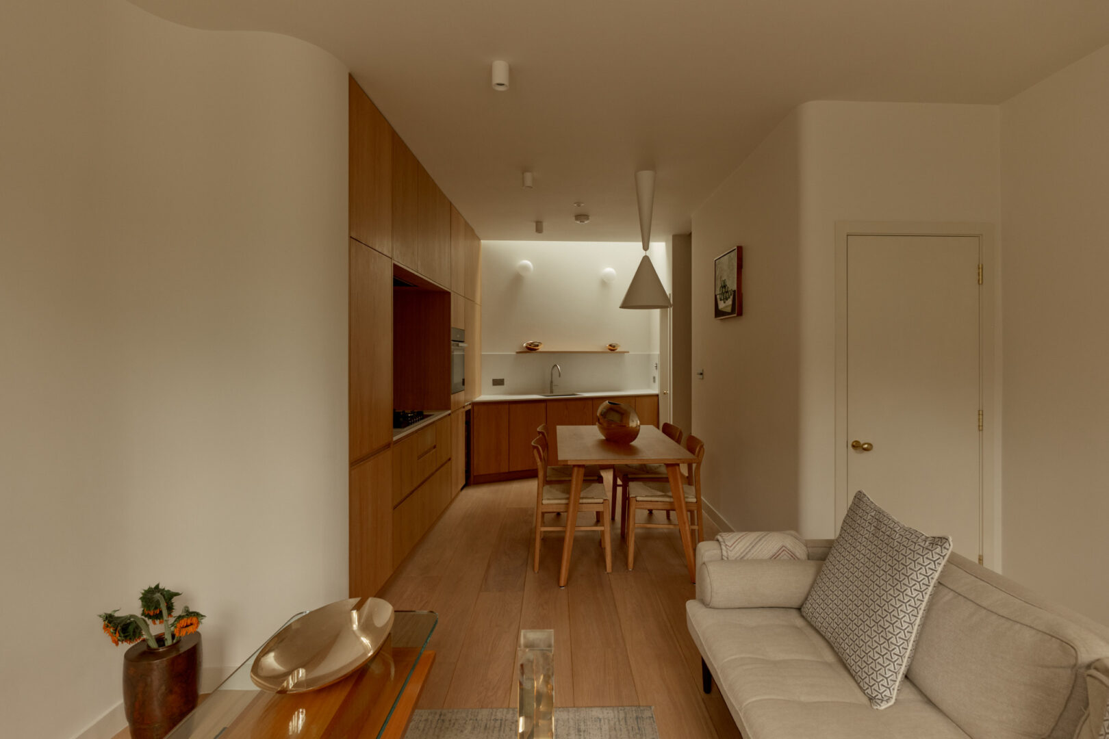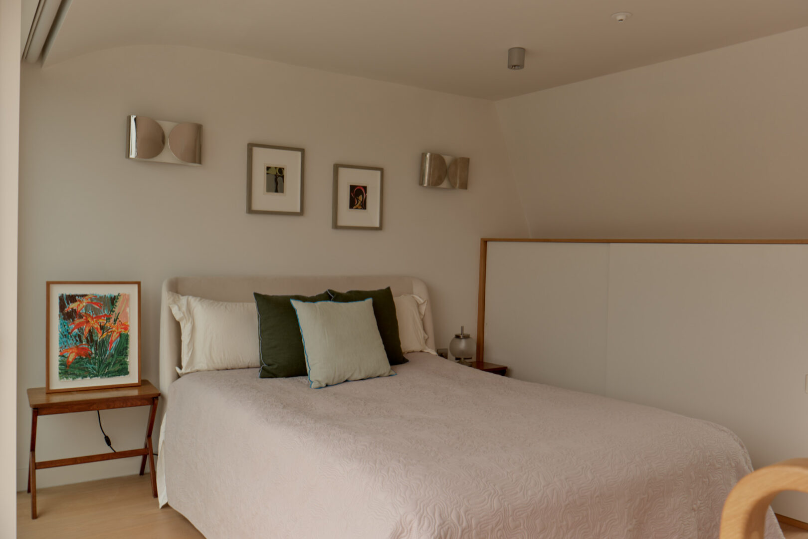 Ascending via a sculptural staircase with curved oak banister, the first floor reveals a generous bedroom and a beautifully appointed bathroom. Here, green marble accents add a rich, tactile quality, while a walk-in rainfall shower, soft terrazzo underfoot, and Flos lighting provide a spa-like experience.