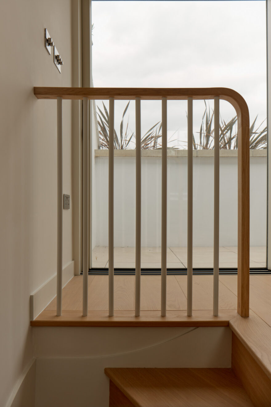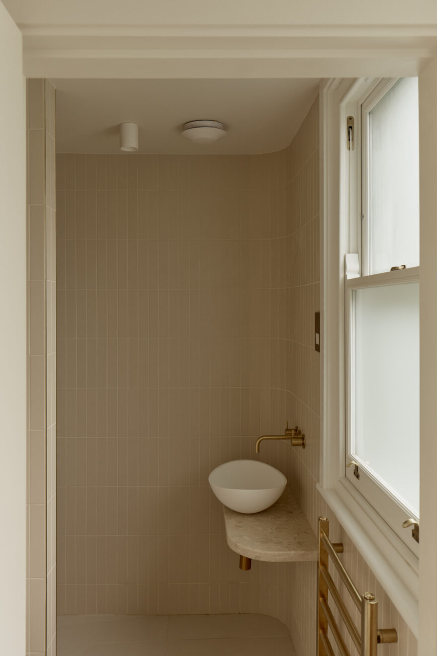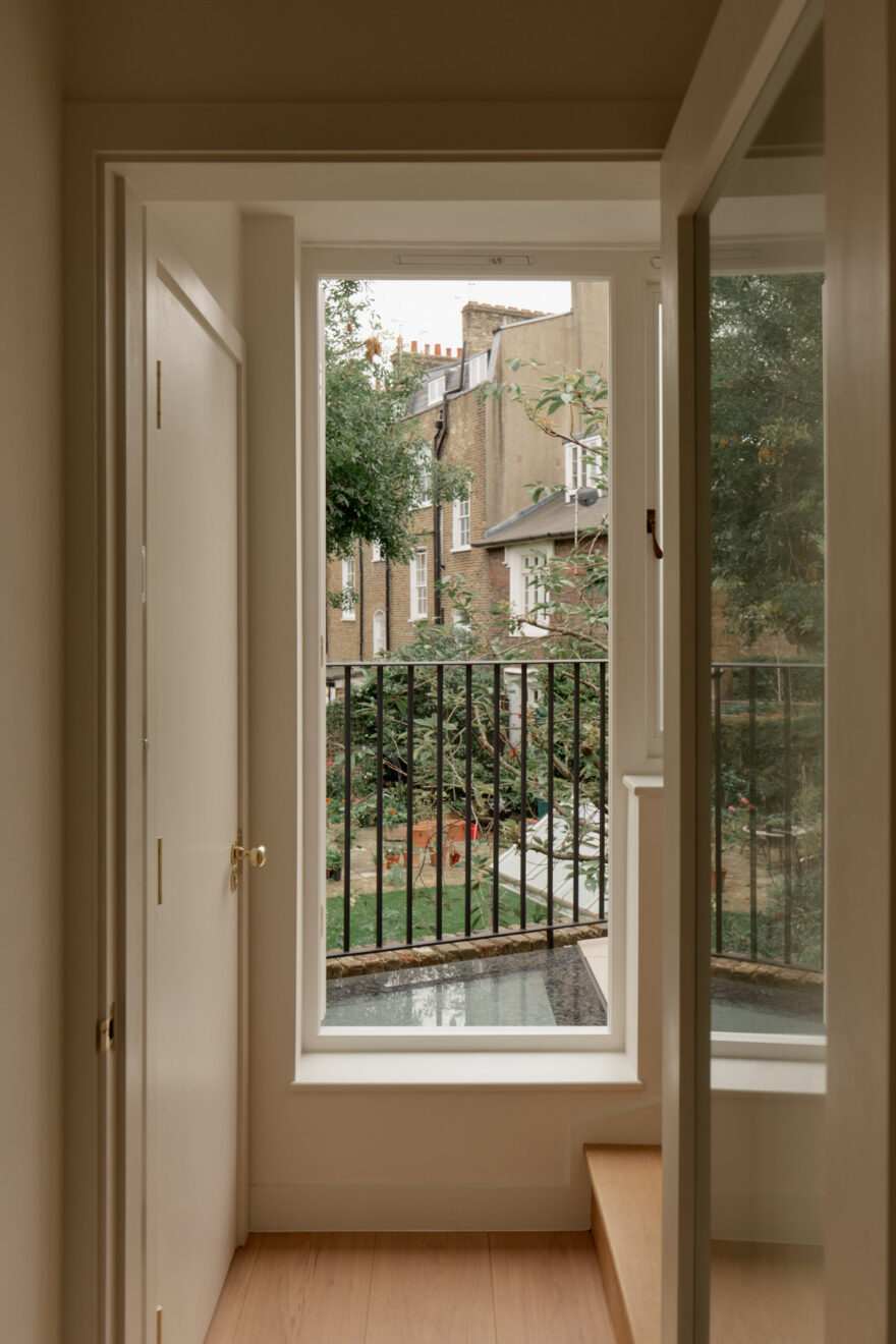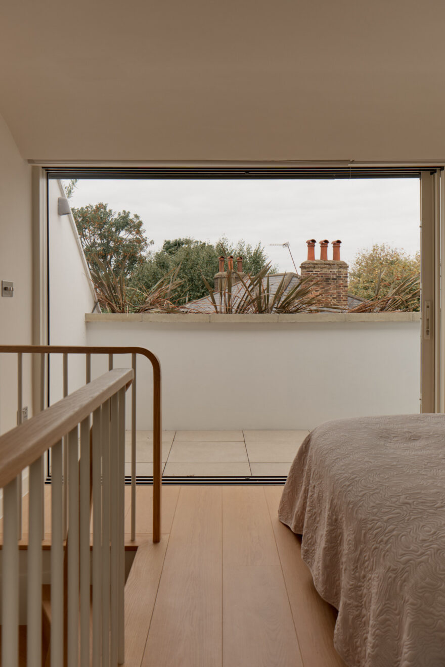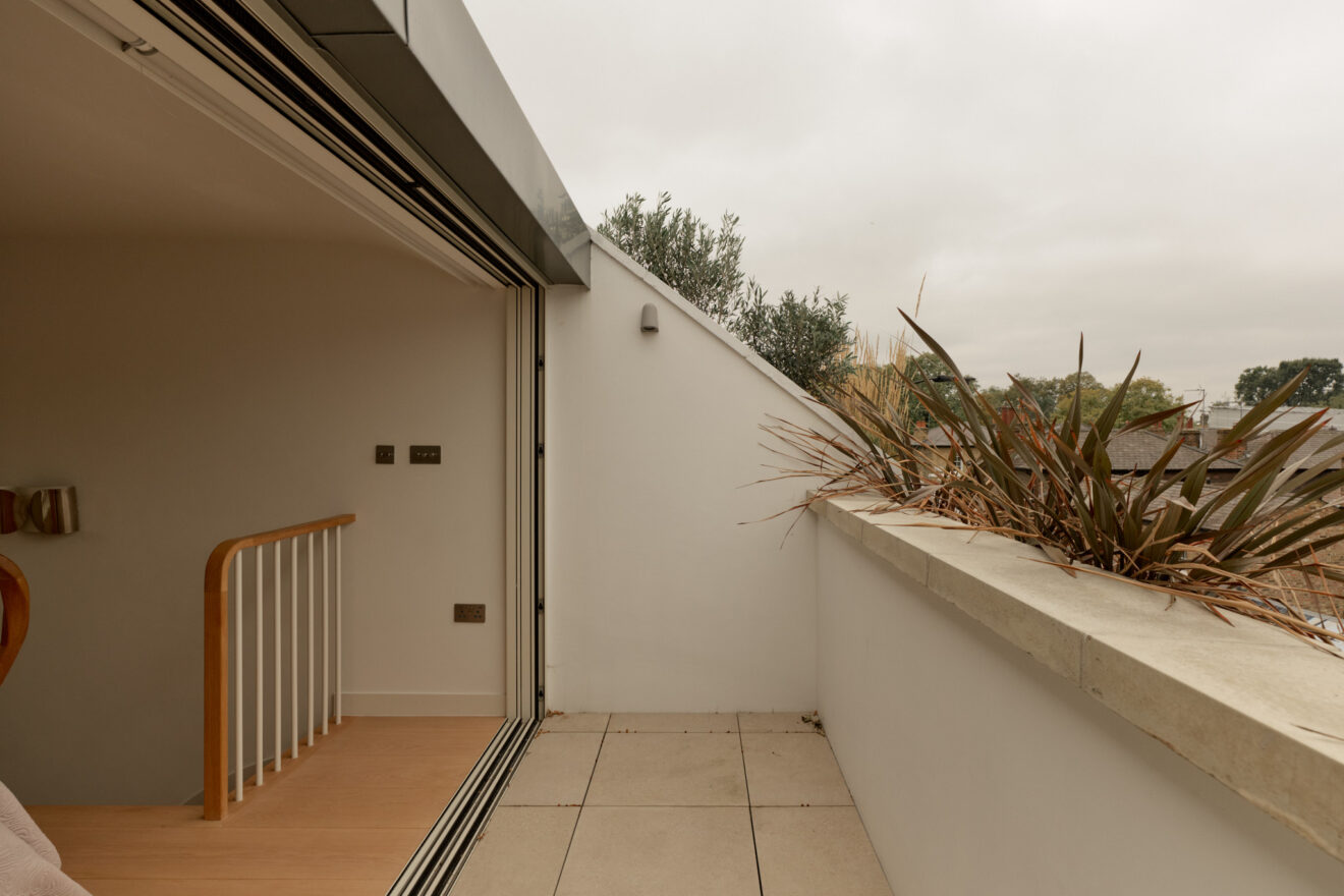 A few steps along brings you to the second bathroom, serving the principal bedroom. The design language continues here with a curved, fully tiled shower enclosure complemented by brass fittings from Crosswater. Approaching the top floor, full-width glazing opens onto a private west-facing roof terrace. A rare and tranquil retreat with far-reaching views over the mature gardens of the surrounding conservation area.