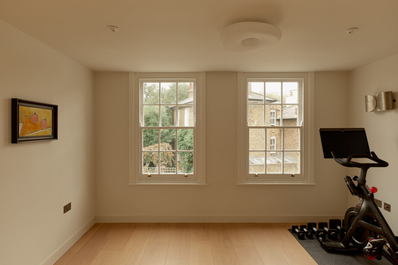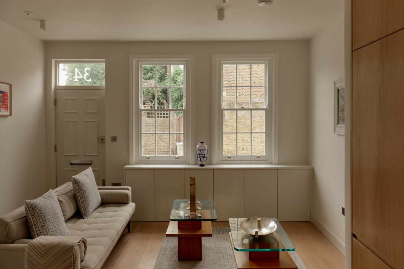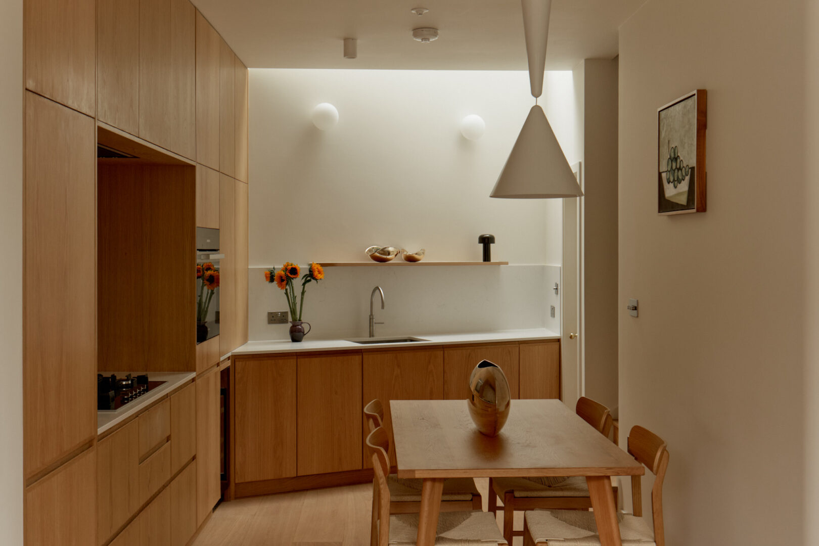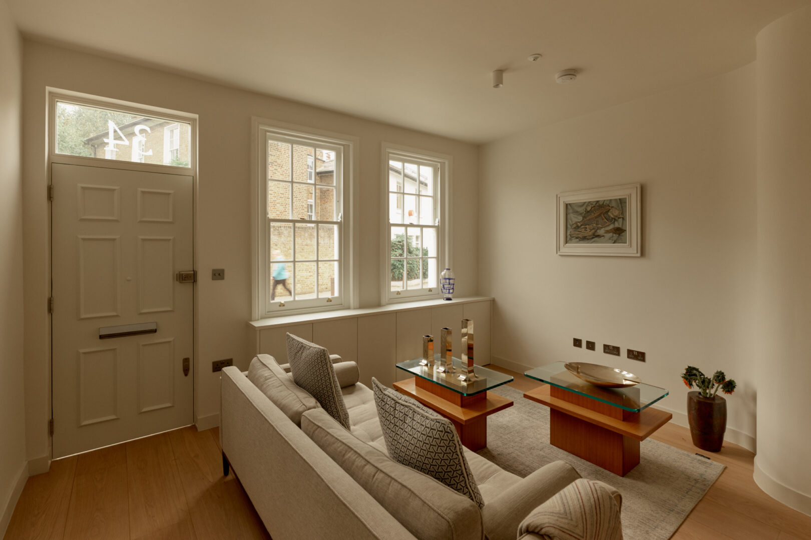 At the front of the house, traditional six-over-six sash windows frame leafy views and bathe the living space in soft natural light, setting a calm and welcoming tone. To the rear, a striking, custom-designed oak kitchen forms the heart of the home. Tailored for both everyday living and entertaining, it features sleek, integrated appliances, quartz worktops, and finely crafted cabinetry. A new architectural light well introduces an abundance of daylight, enhancing the warmth of the natural materials and lending the space a quietly luxurious feel.
