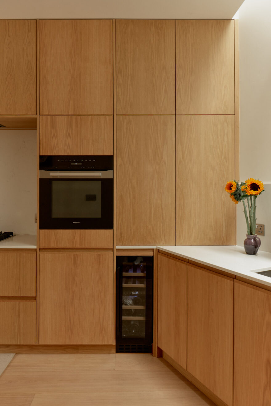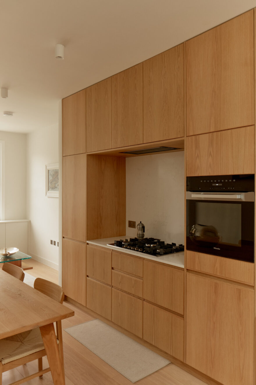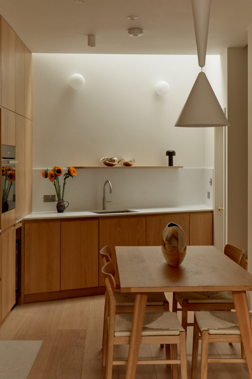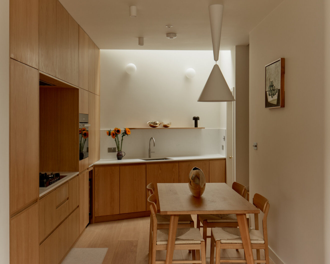 At the front of the house, traditional six-over-six sash windows frame leafy views and bathe the living space in soft natural light, setting a calm and welcoming tone. To the rear, a striking, custom-designed oak kitchen forms the heart of the home. Tailored for both everyday living and entertaining, it features sleek, integrated appliances, quartz worktops, and finely crafted cabinetry. A new architectural light well introduces an abundance of daylight, enhancing the warmth of the natural materials and lending the space a quietly luxurious feel.