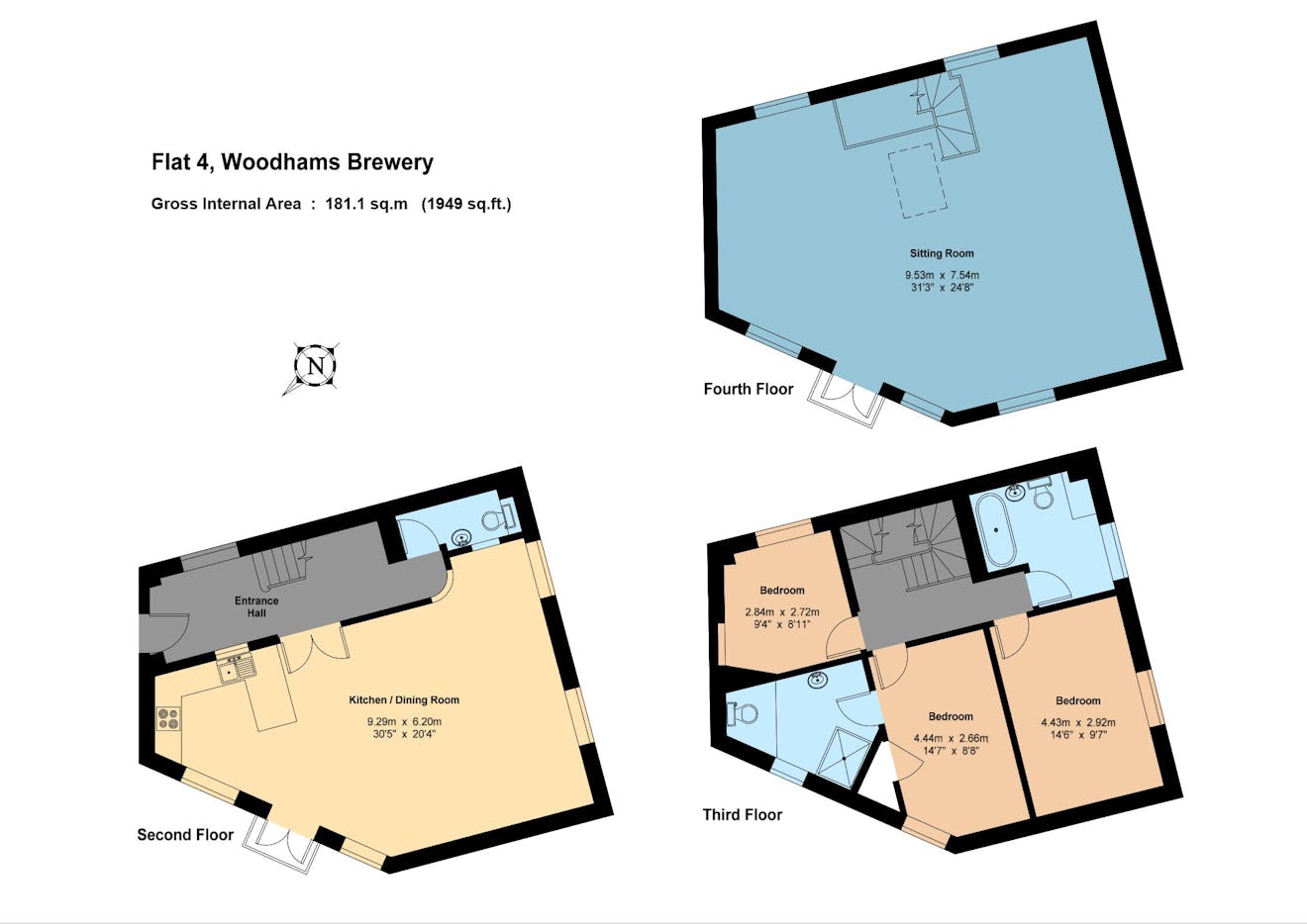 This apartment is accessed from the cobbled yard via a beautiful handmade staircase. Now quiet, calm and above the fray it wasn't always like this. The huge steel beams at the very top of the building tell you this is where the deliciously chalky water from the nearby spring was used for the first mashing of Woodhams' famous Pale and Golden ales. From this large 31ft wide living area (or ‘The Great High Chamber’ as it’s become affectionately known) you gain panoramic vistas across Rochester, Frindsbury and Chatham and, from the French doors and small balcony, wonderful views of the Italian Water Garden, Restoration House, Vines House, Rochester Castle and Rochester Cathedral. Expansive douglas fir beams span across the room. Travel down the bespoke pine staircase that connects the three levels, with its wonderfully sinuous mahogany hand rail - hand built in Chatham Dockyard, and you find a family bathroom and three bedrooms, one with en suite shower. Below them on the entrance level is a kitchen and dining room featuring a beautiful curved wall that perfectly catches the afternoon light and double doors leading to another small balcony overlooking the gardens. Off the hallway is a WC.