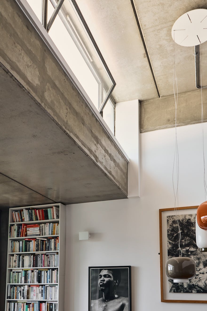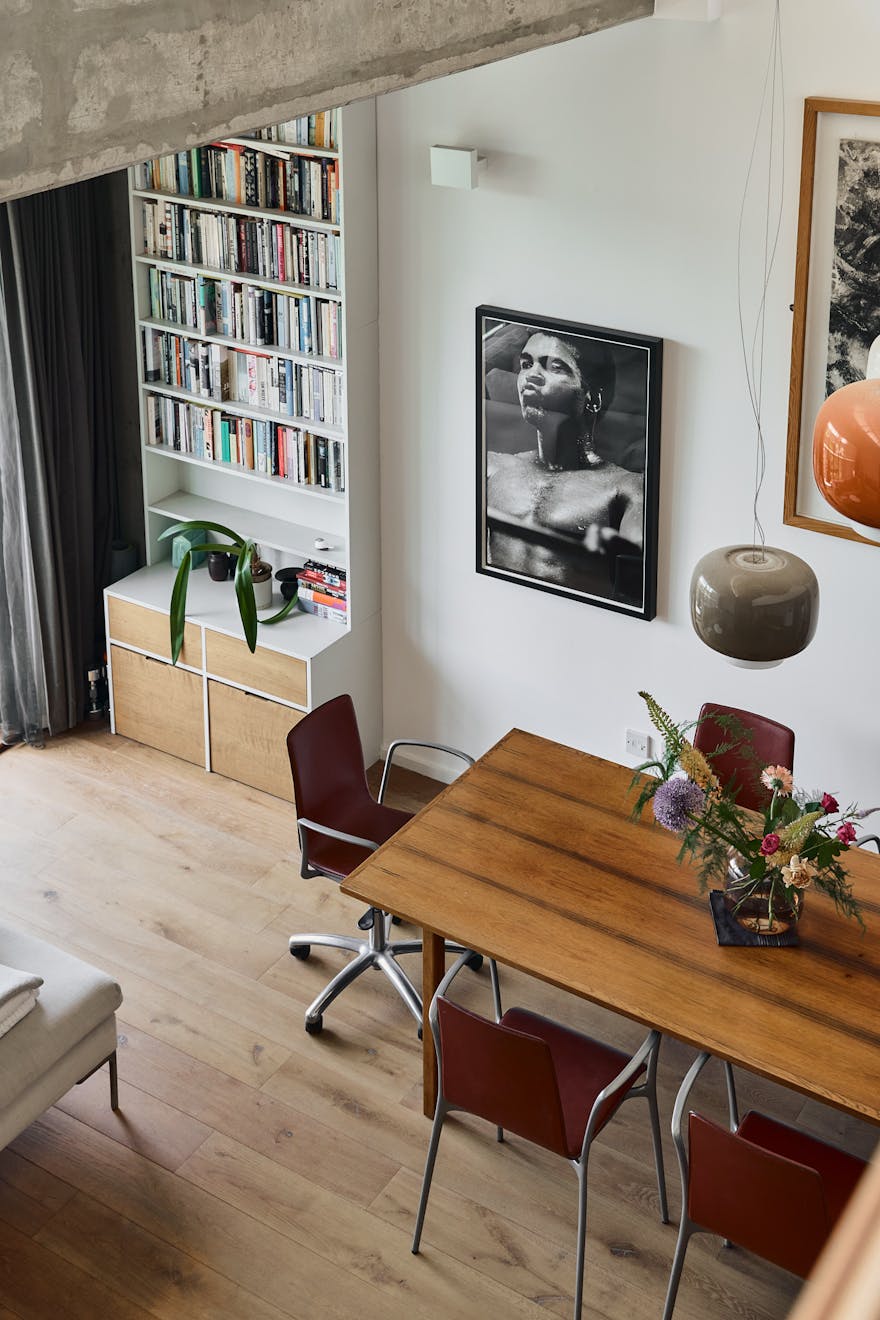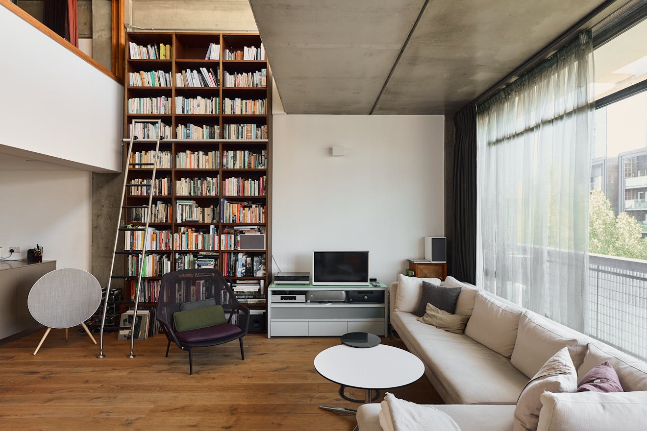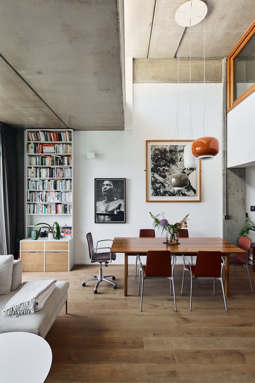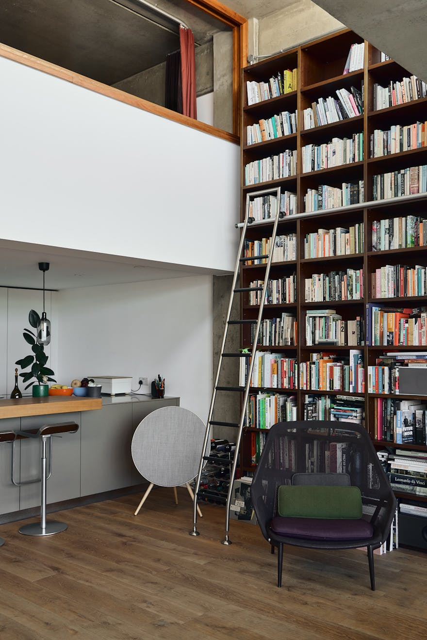 A double-height ceiling in the main living space creates an impressive sense of volume, paying homage to the area’s industrial past. Raw concrete ceiling and wall panels are paired with contemporary elements such as engineered oak flooring, underfloor heating, and bespoke joinery — including a soaring bookshelf that doubles as a striking partition between the living area and the custom-designed Bulthaup kitchen.