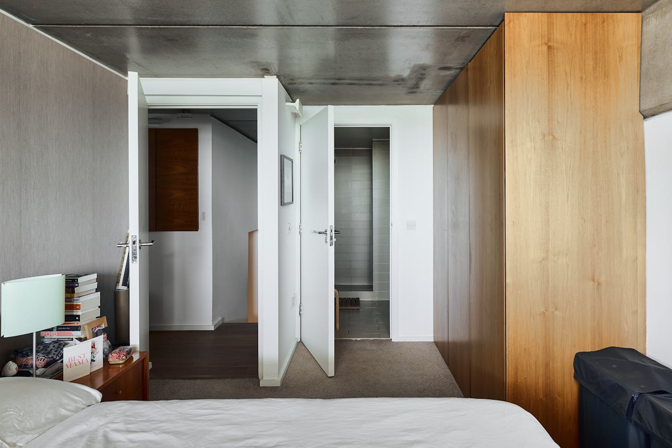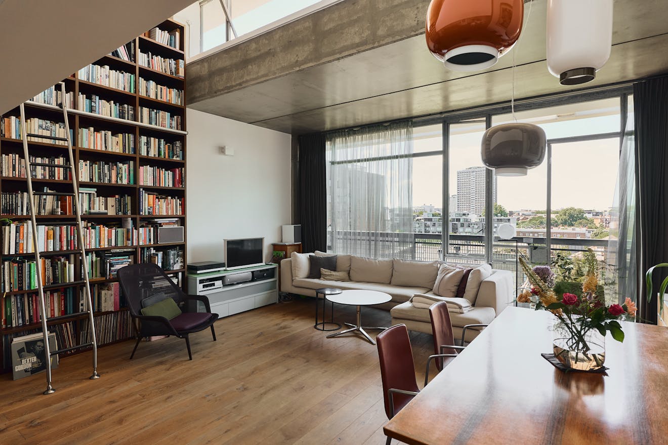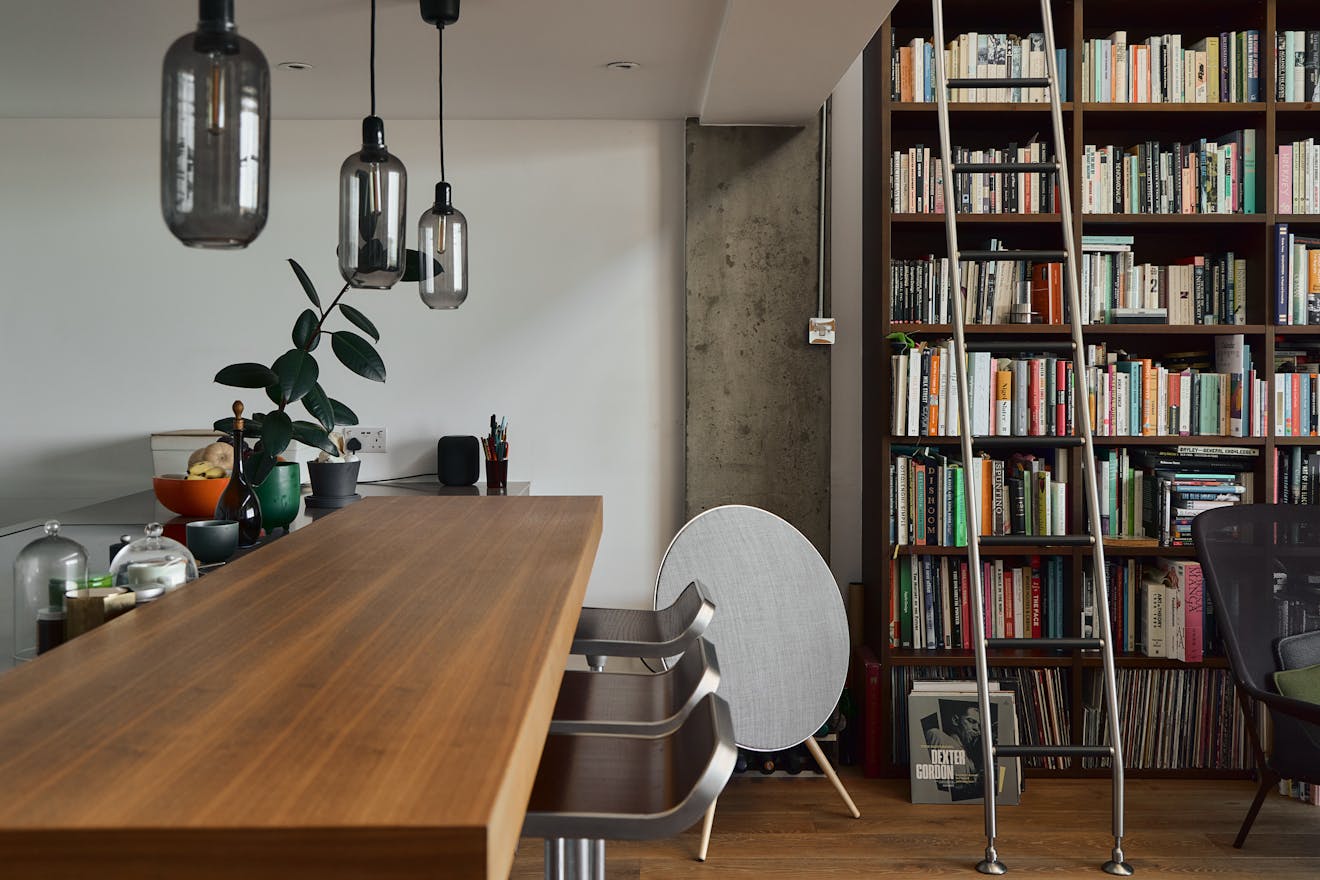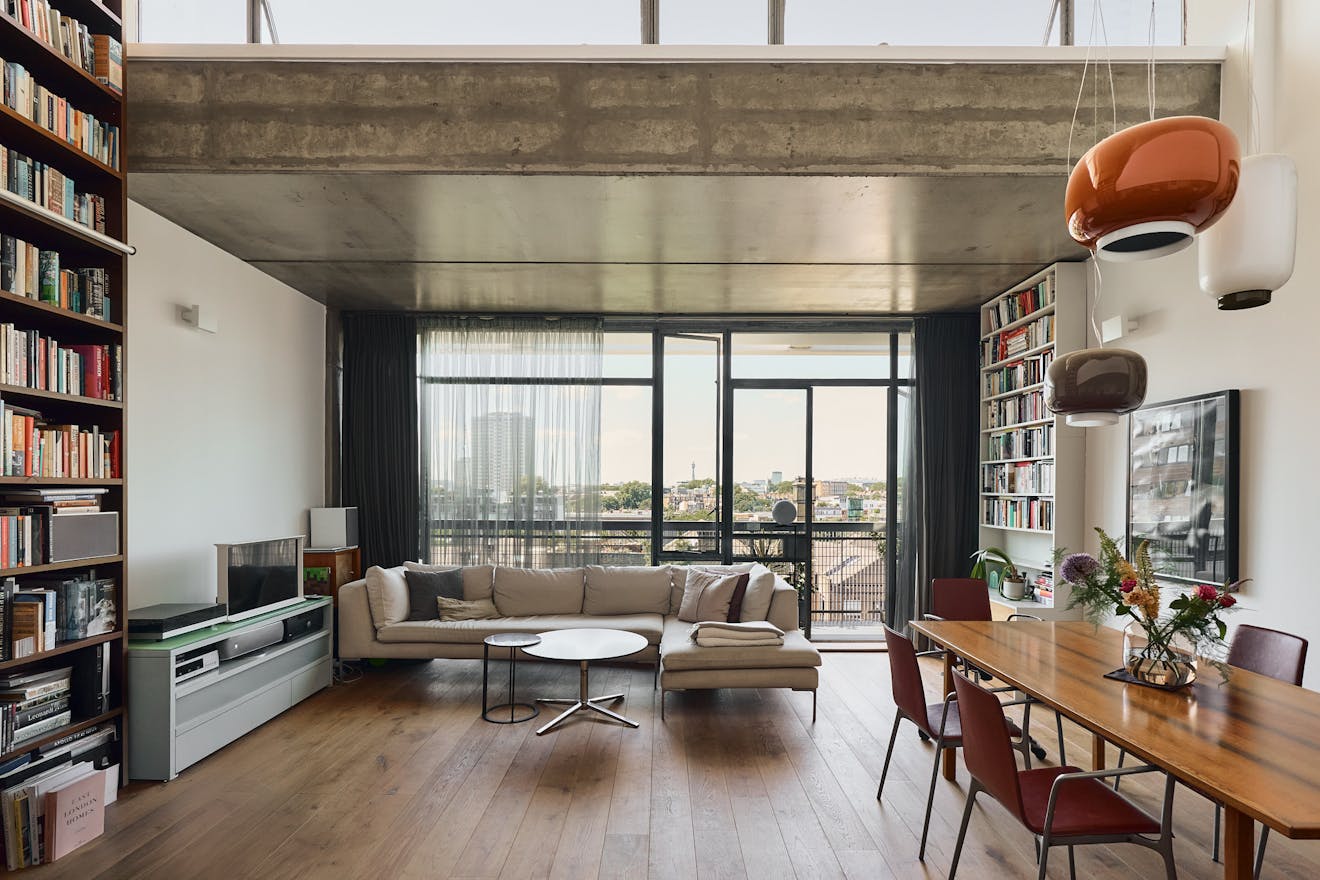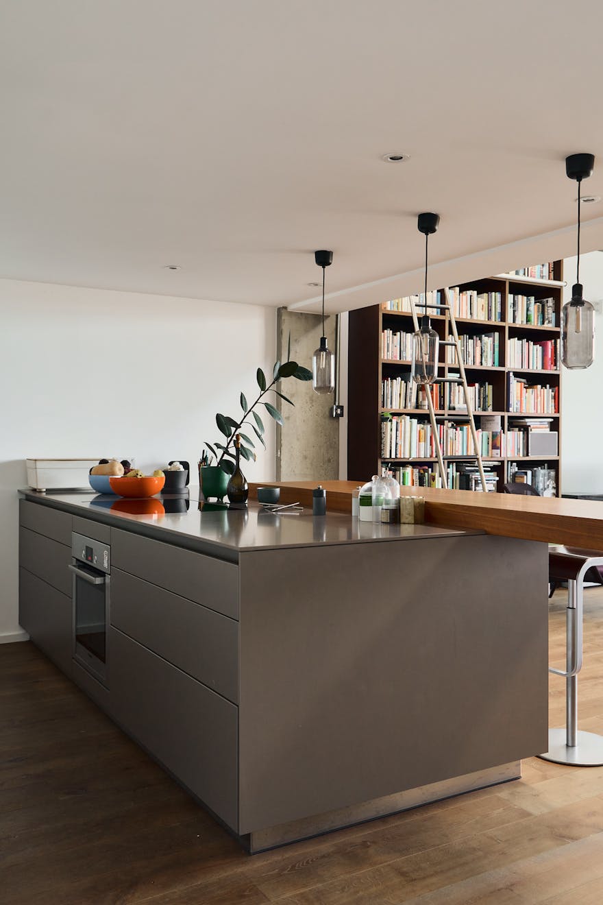 A double-height ceiling in the main living space creates an impressive sense of volume, paying homage to the area’s industrial past. Raw concrete ceiling and wall panels are paired with contemporary elements such as engineered oak flooring, underfloor heating, and bespoke joinery — including a soaring bookshelf that doubles as a striking partition between the living area and the custom-designed Bulthaup kitchen.