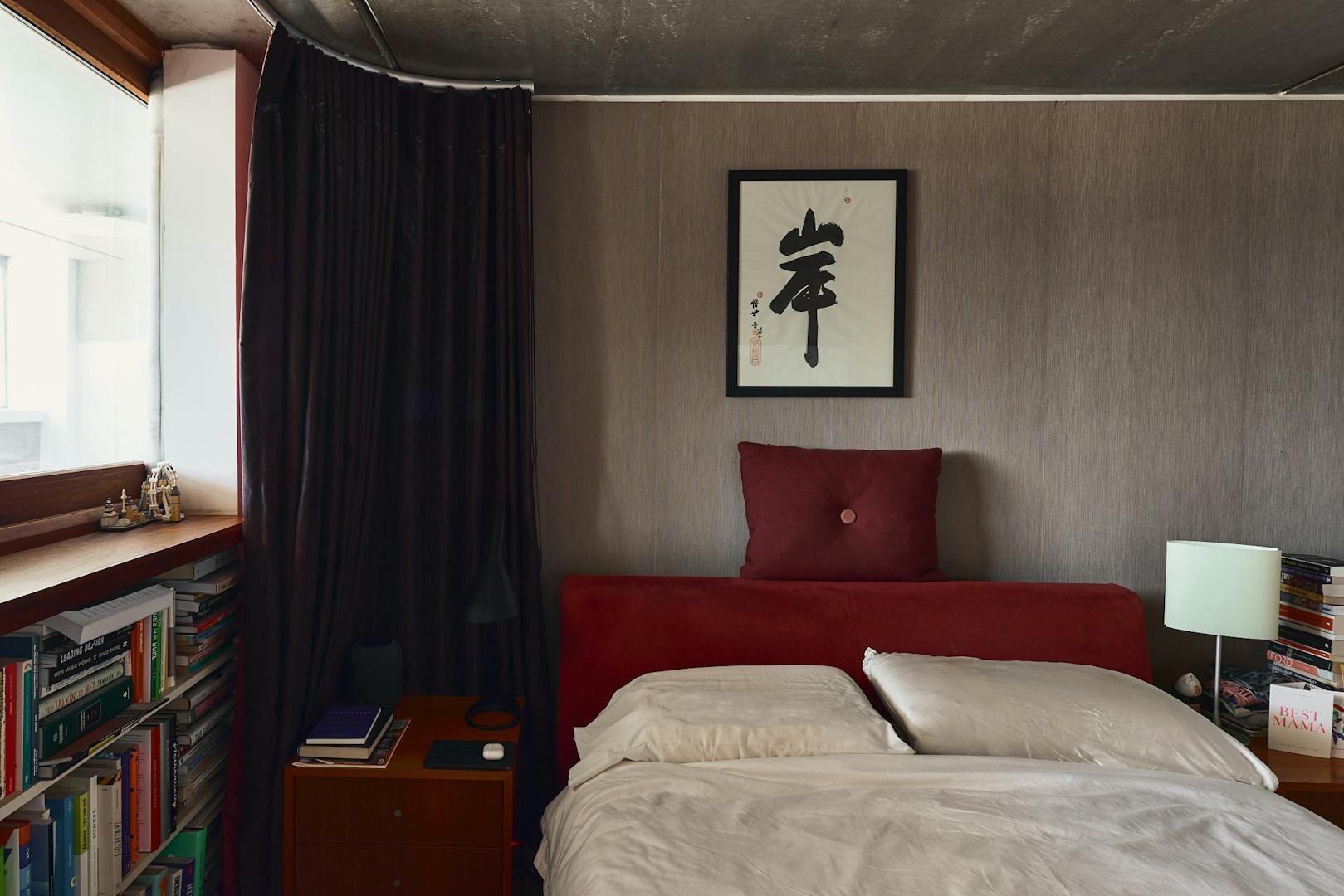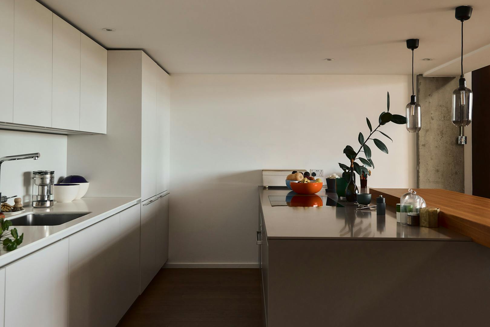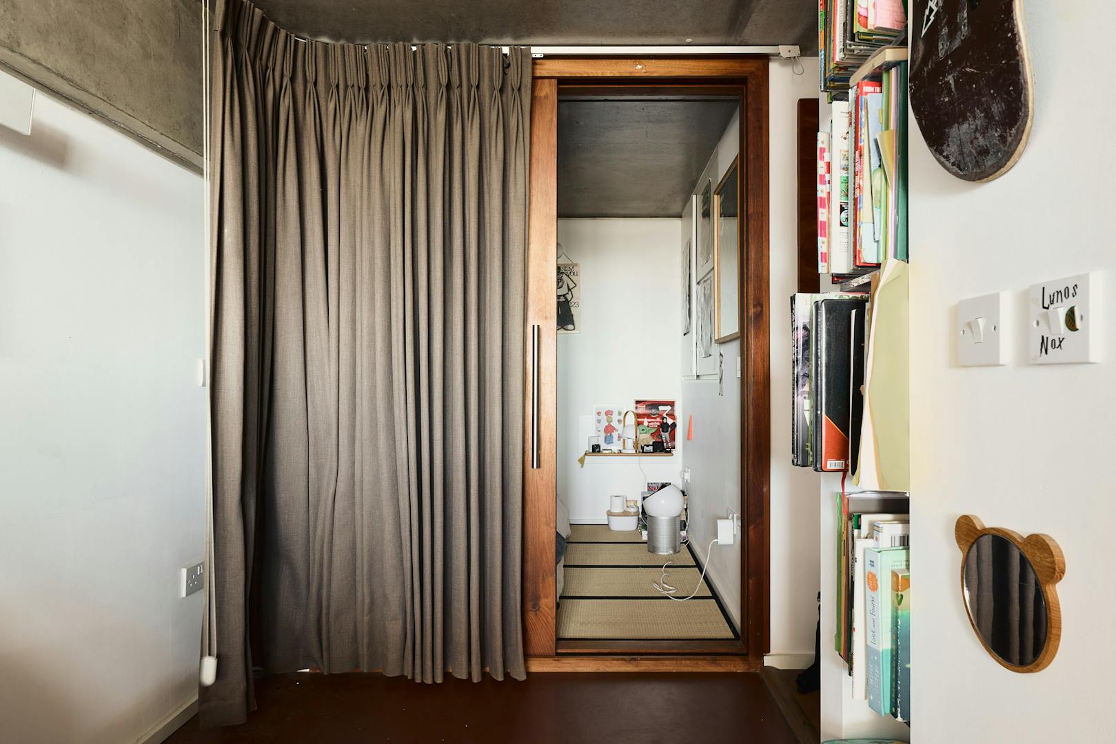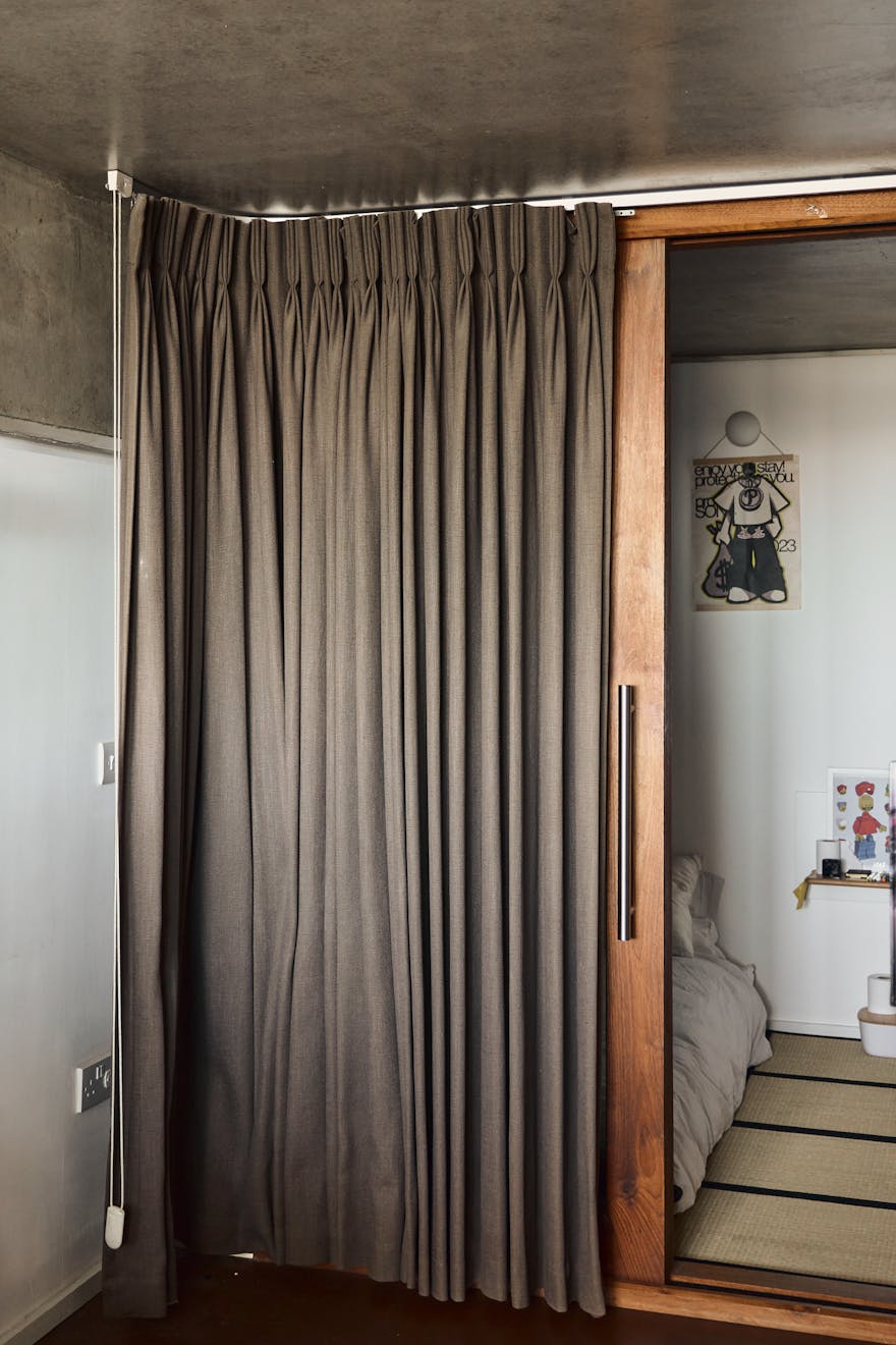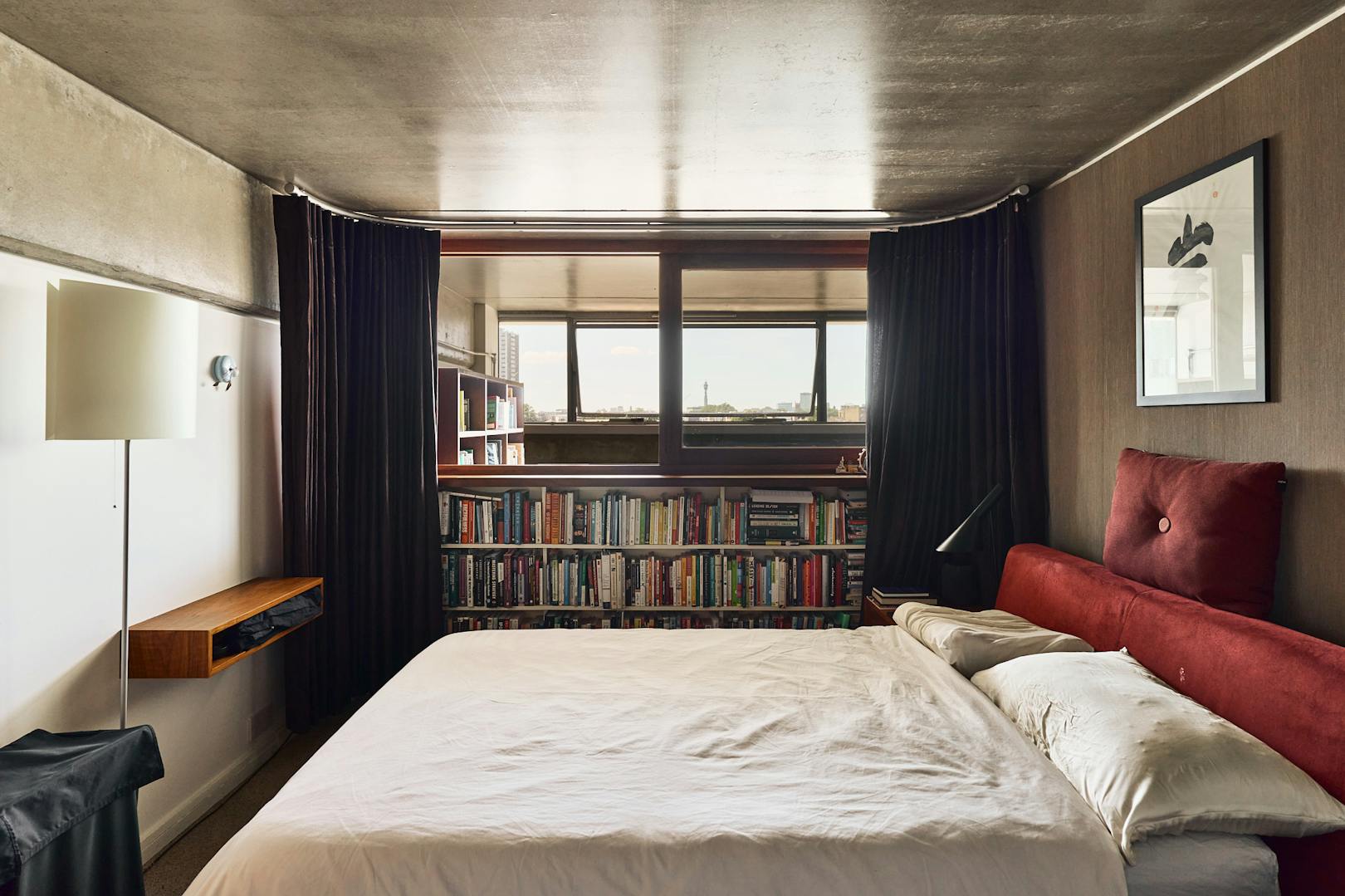 A double-height ceiling in the main living space creates an impressive sense of volume, paying homage to the area’s industrial past. Raw concrete ceiling and wall panels are paired with contemporary elements such as engineered oak flooring, underfloor heating, and bespoke joinery — including a soaring bookshelf that doubles as a striking partition between the living area and the custom-designed Bulthaup kitchen.
