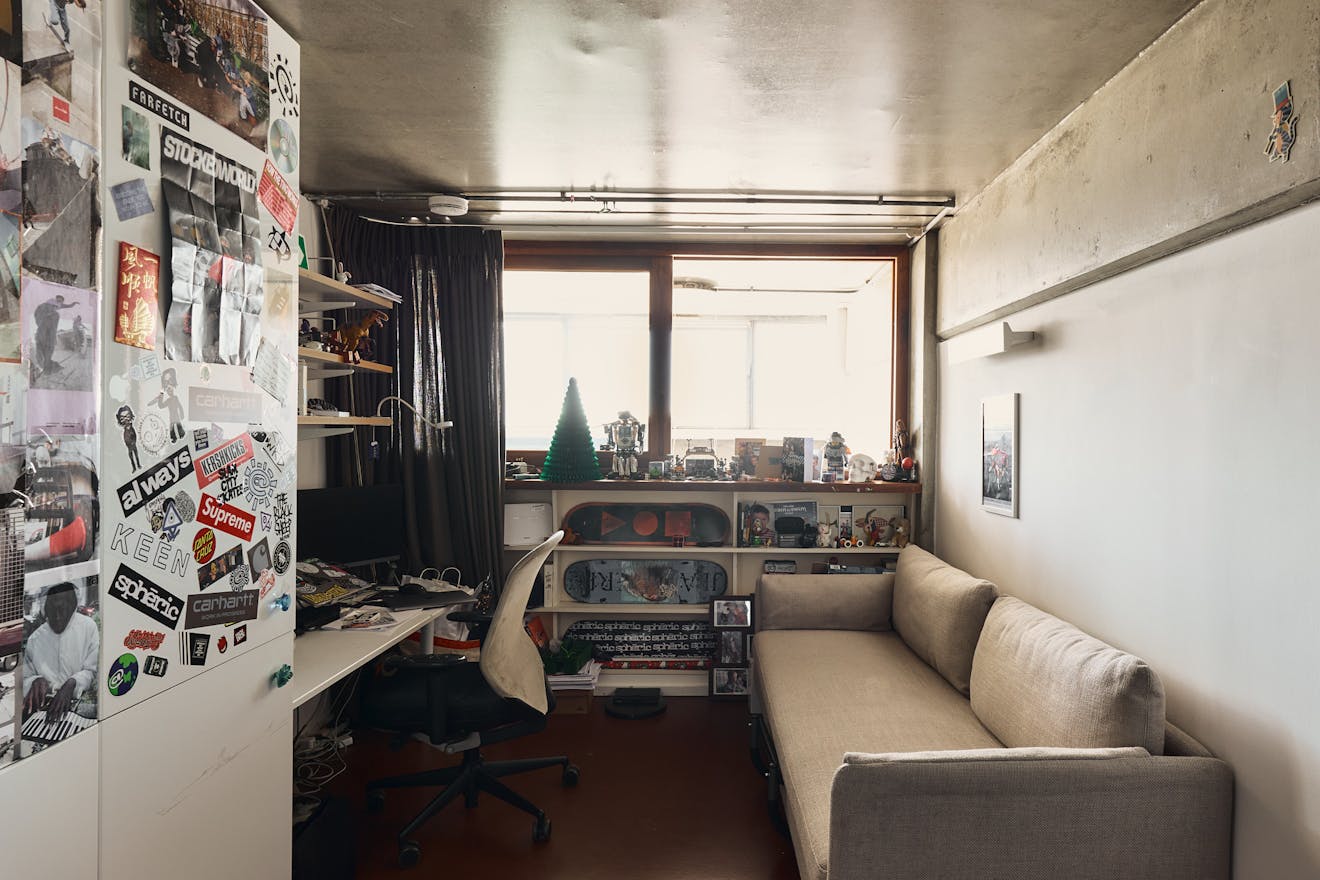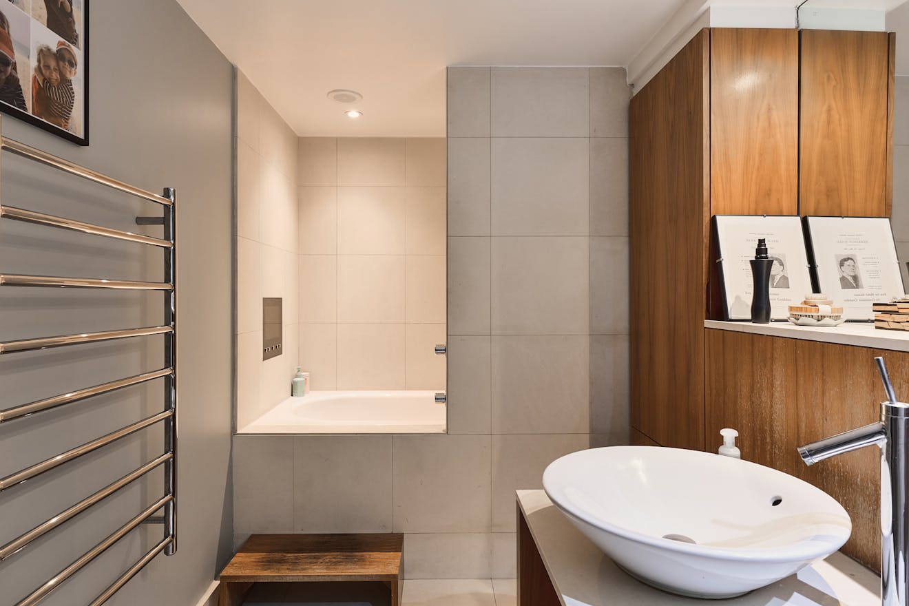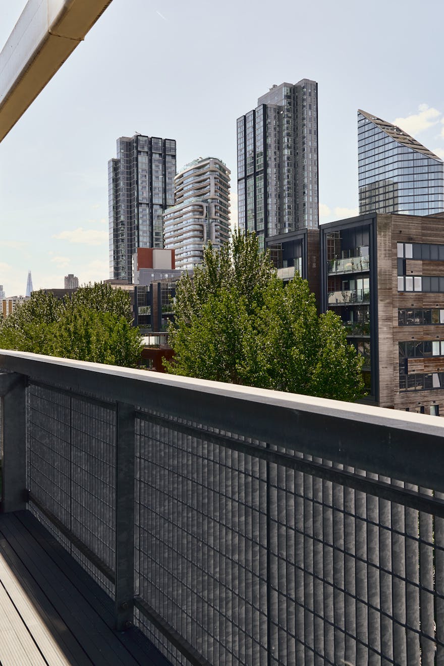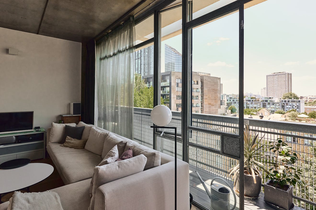Positioned on the fifth floor, at the rear of the building, the apartment is perfectly oriented to capture expansive southerly views. Full-width galvanised steel windows and doors open onto a generous balcony, framing the canal basin below and the London skyline beyond — an ideal vantage point from which to enjoy the tranquillity of the water and the architecture that surrounds it.