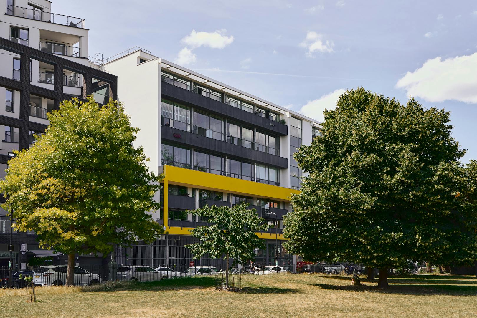 Positioned at the western edge of Shepherdess Walk Park, the building is defined by its crisp steel framework and expanses of glazing, a quietly confident presence amid the greenery. Inside the building, a generous central hallway sets the tone, with a full-time concierge on hand and lift access leading to the apartment, which unfolds across the upper two floors.