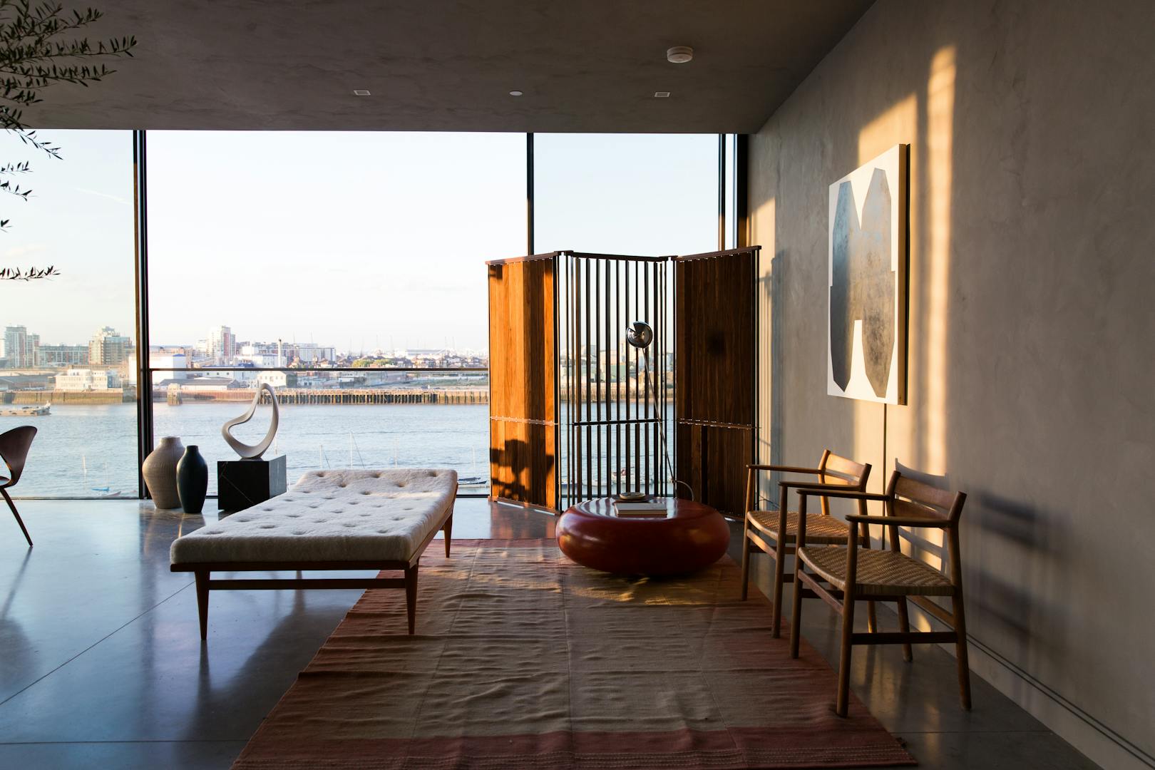 This is a stunning three-bedroom penthouse apartment with expansive roof terrace. This, the show home, is one of four new apartments for sale in this building. We asked our friends at Cereal magazine to bring their unique sense of aesthetic to the project by styling the interiors, demonstrating just how special these homes can be. The architects, Pilbrow and Partners, have made the most of the stunning and ever-changing view of the Thames by using huge, full width, floor to ceiling windows and a cantilevered living space that makes you feel as if you’re hovering over the river and the boats below.