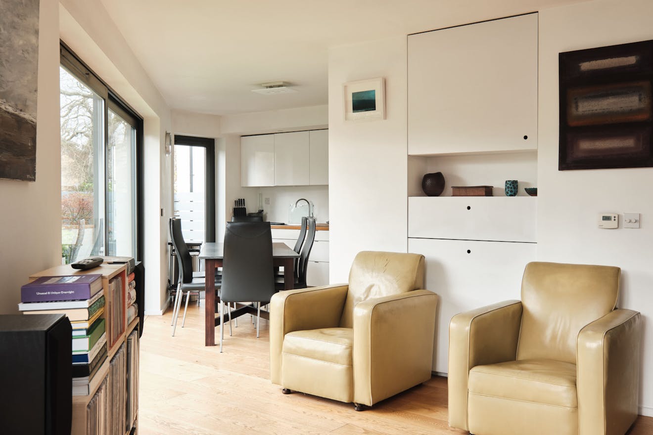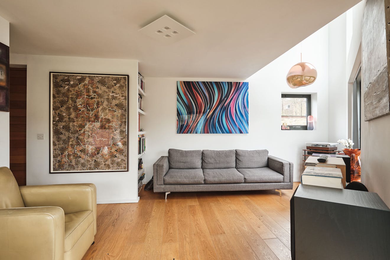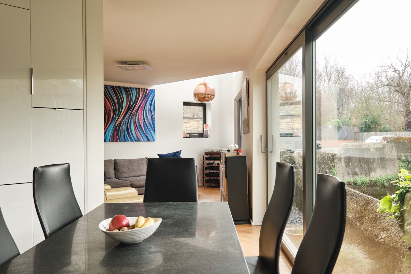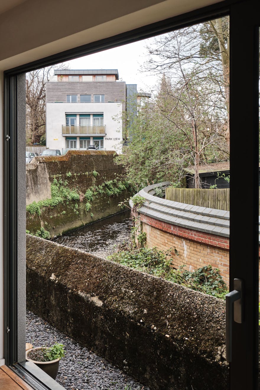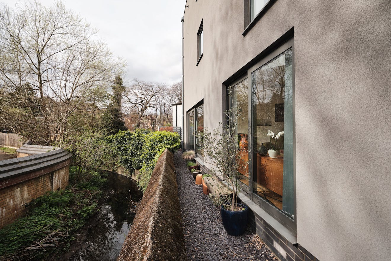 Overlooking the historic river Quaggy, the house boasts a picturesque vista with large picture windows and sliding doors that open out to a courtyard garden and the river wall, making the most of this enviable view. The open-plan living area and kitchen are on the ground floor, which also includes a double-height void, storage cupboards, a utility room and a WC.
