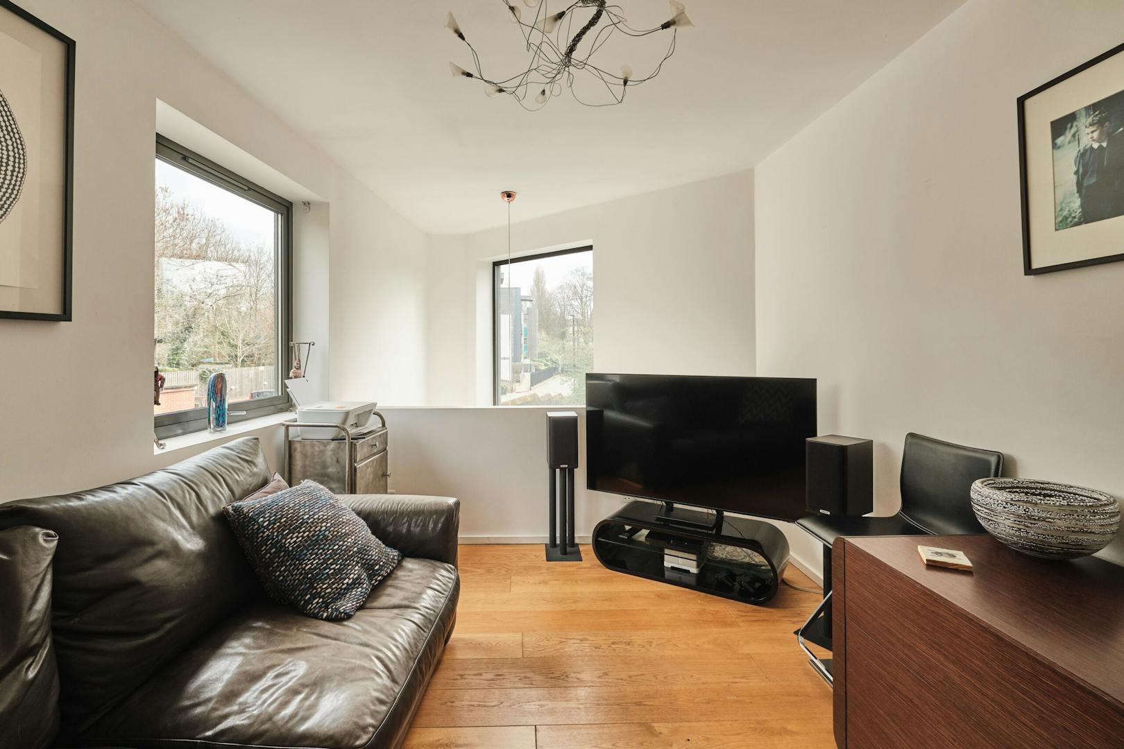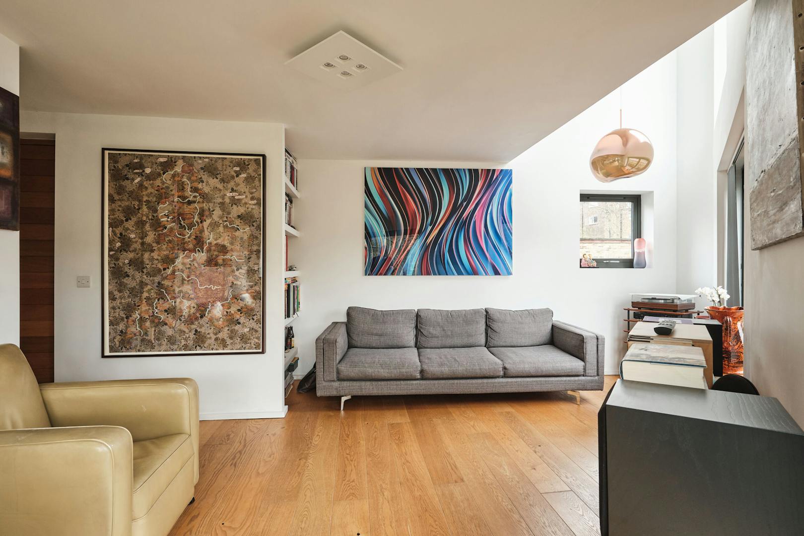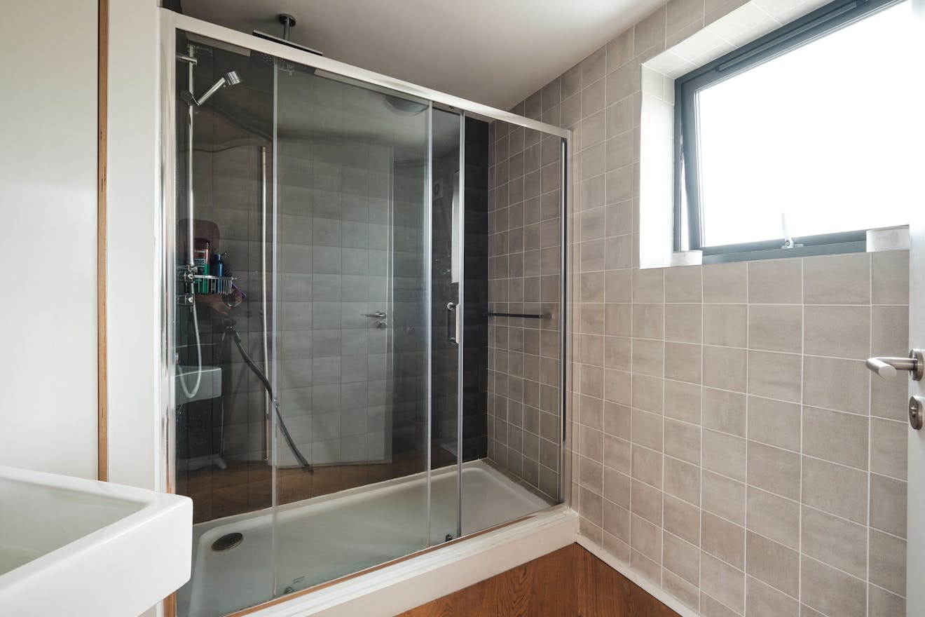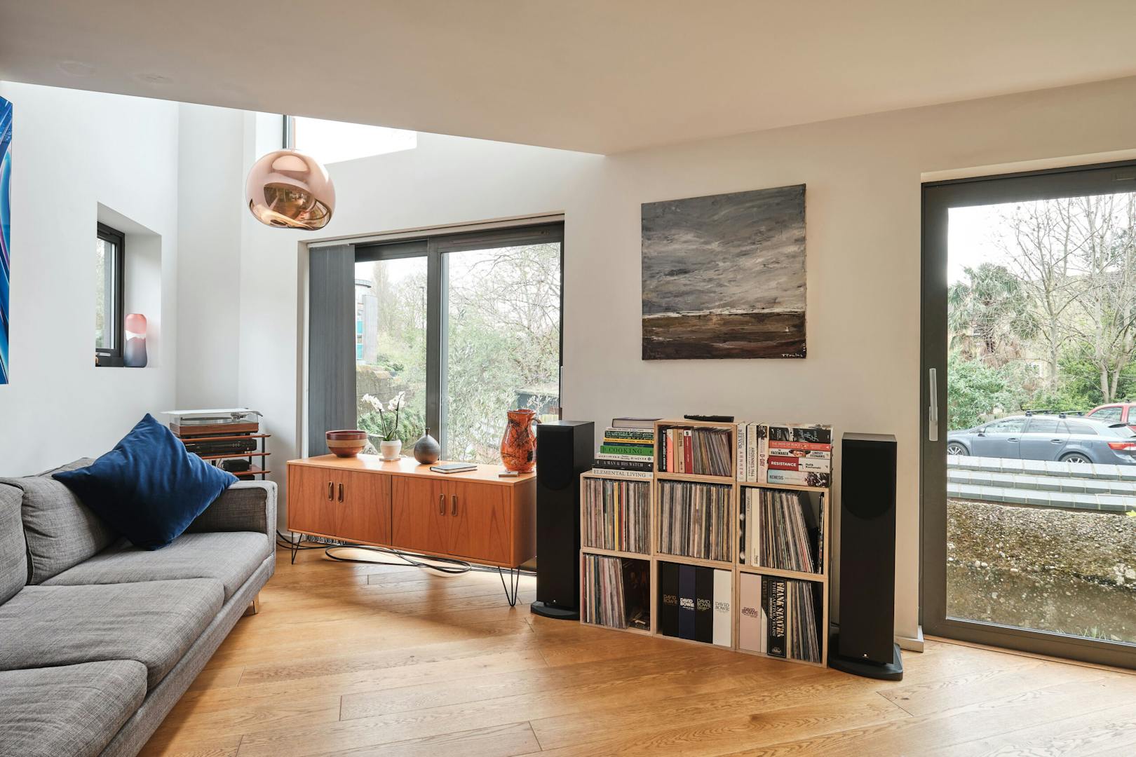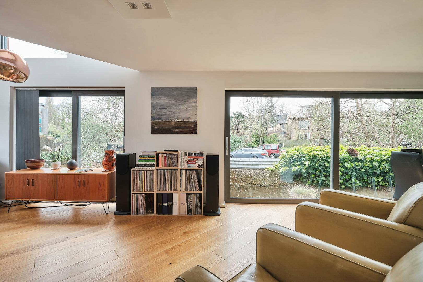 Overlooking the historic river Quaggy, the house boasts a picturesque vista with large picture windows and sliding doors that open out to a courtyard garden and the river wall, making the most of this enviable view. The open-plan living area and kitchen are on the ground floor, which also includes a double-height void, storage cupboards, a utility room and a WC.