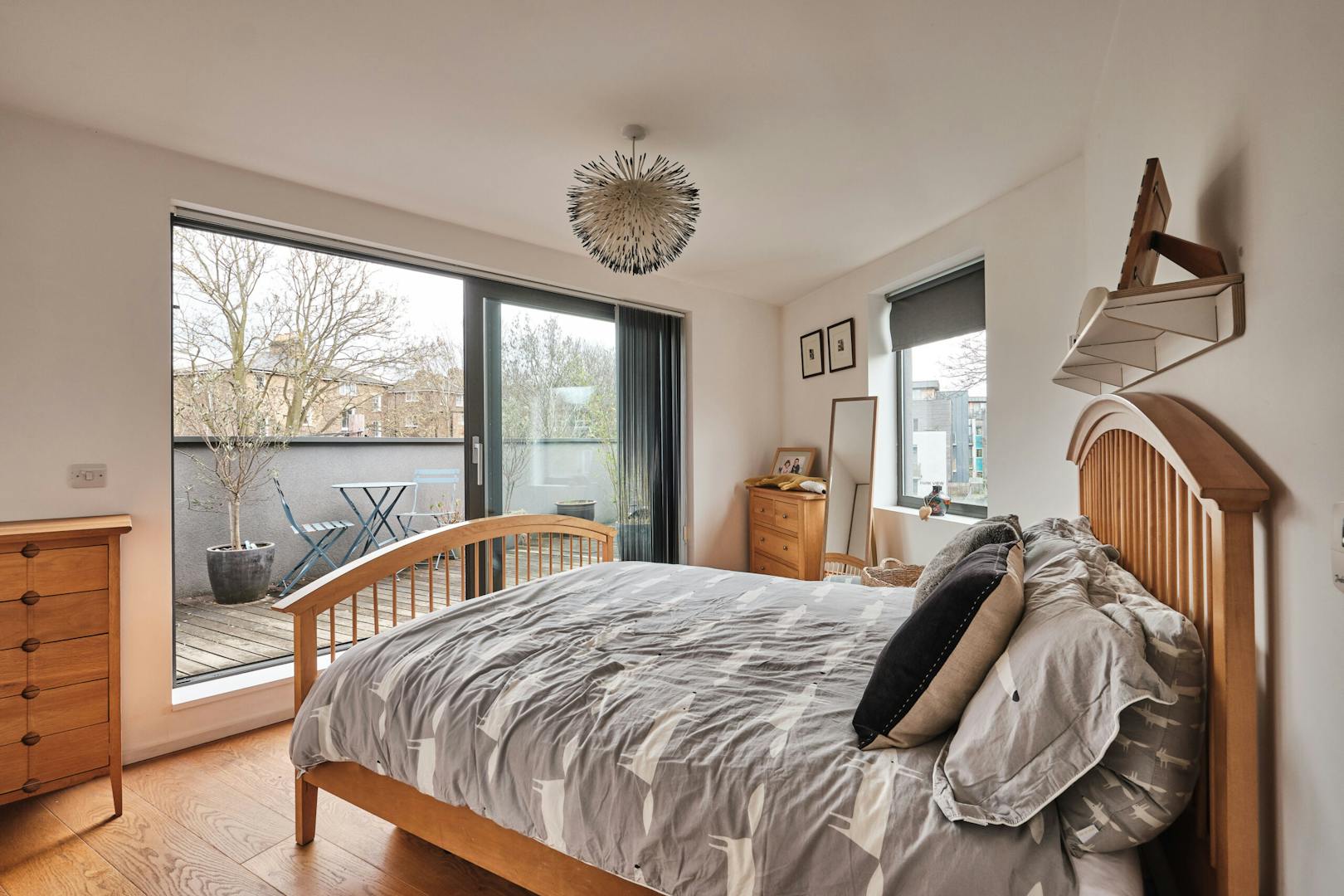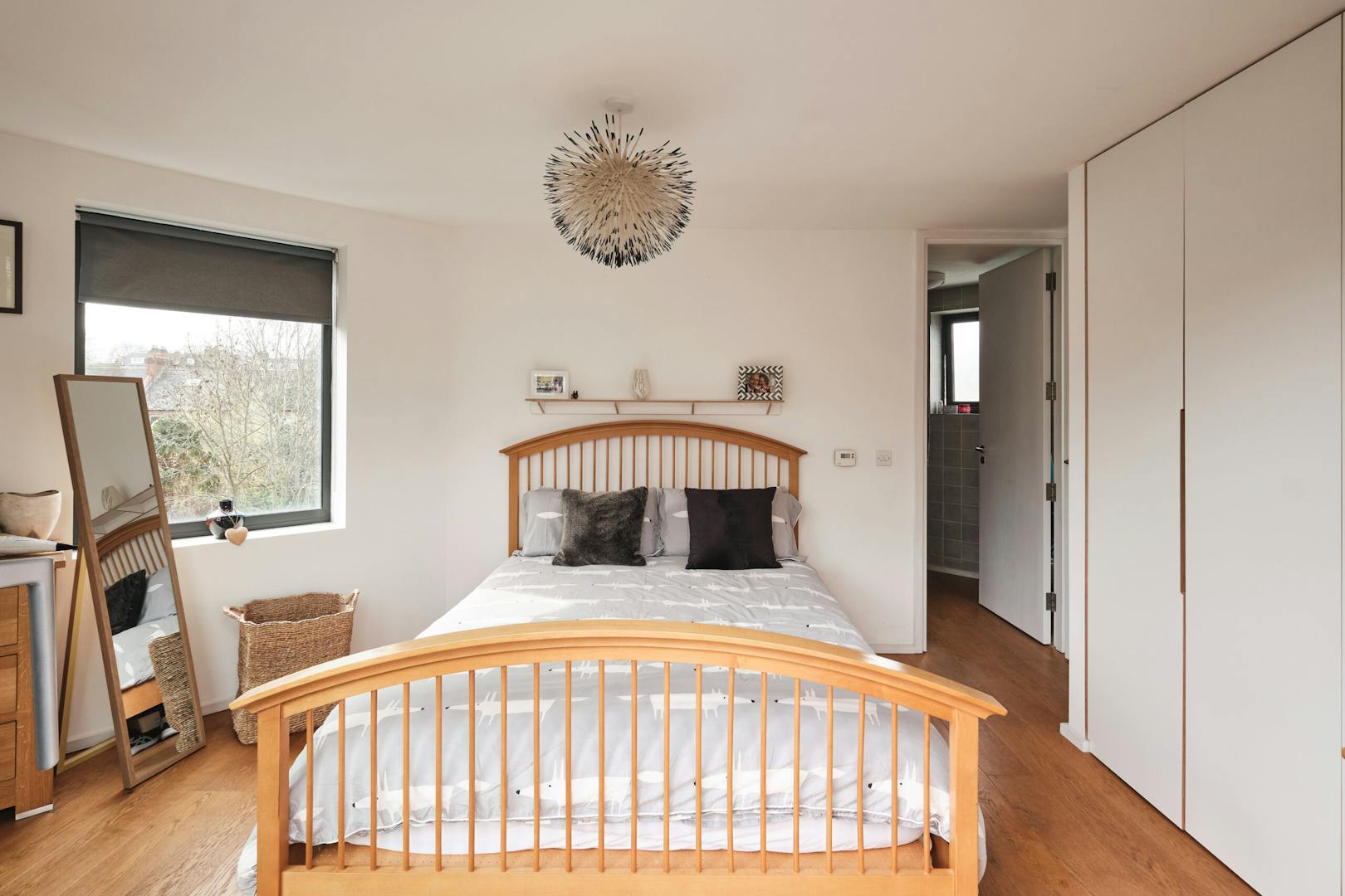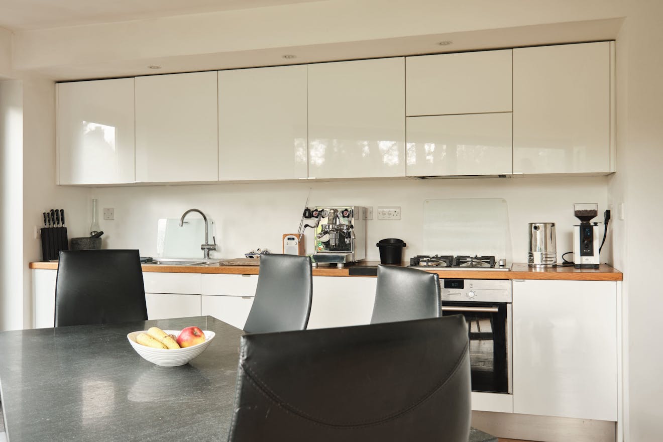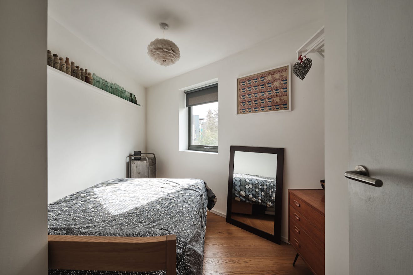 Overlooking the historic river Quaggy, the house boasts a picturesque vista with large picture windows and sliding doors that open out to a courtyard garden and the river wall, making the most of this enviable view. The open-plan living area and kitchen are on the ground floor, which also includes a double-height void, storage cupboards, a utility room and a WC.