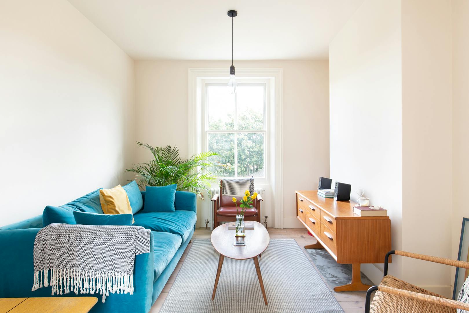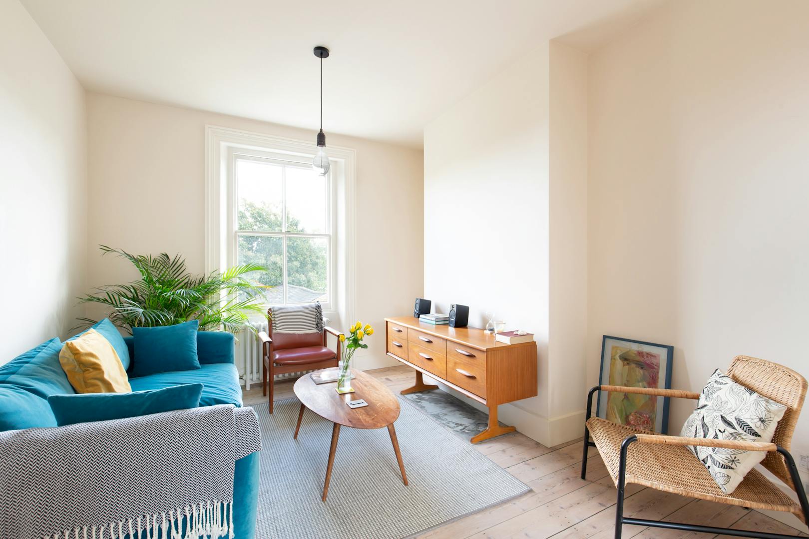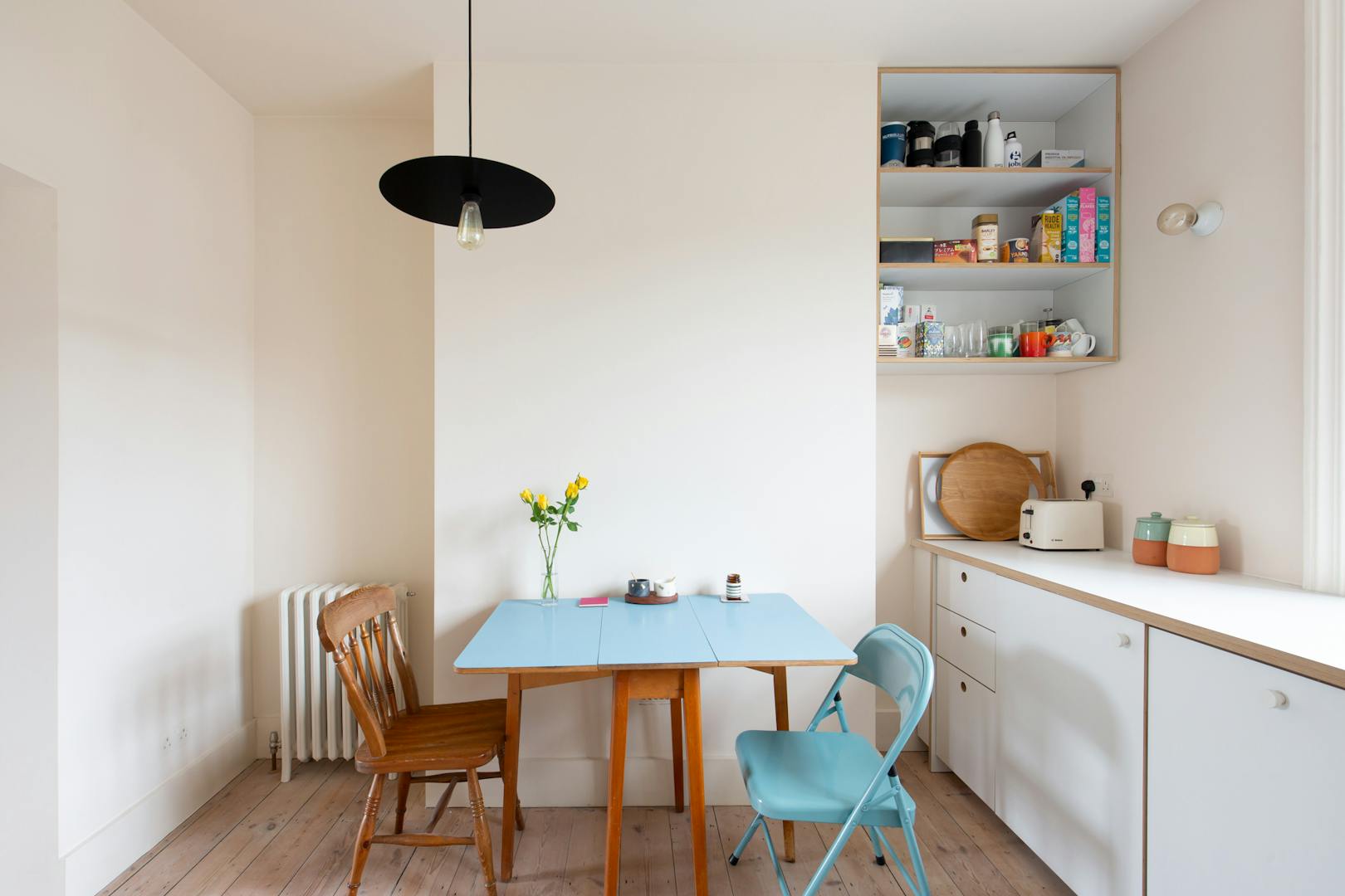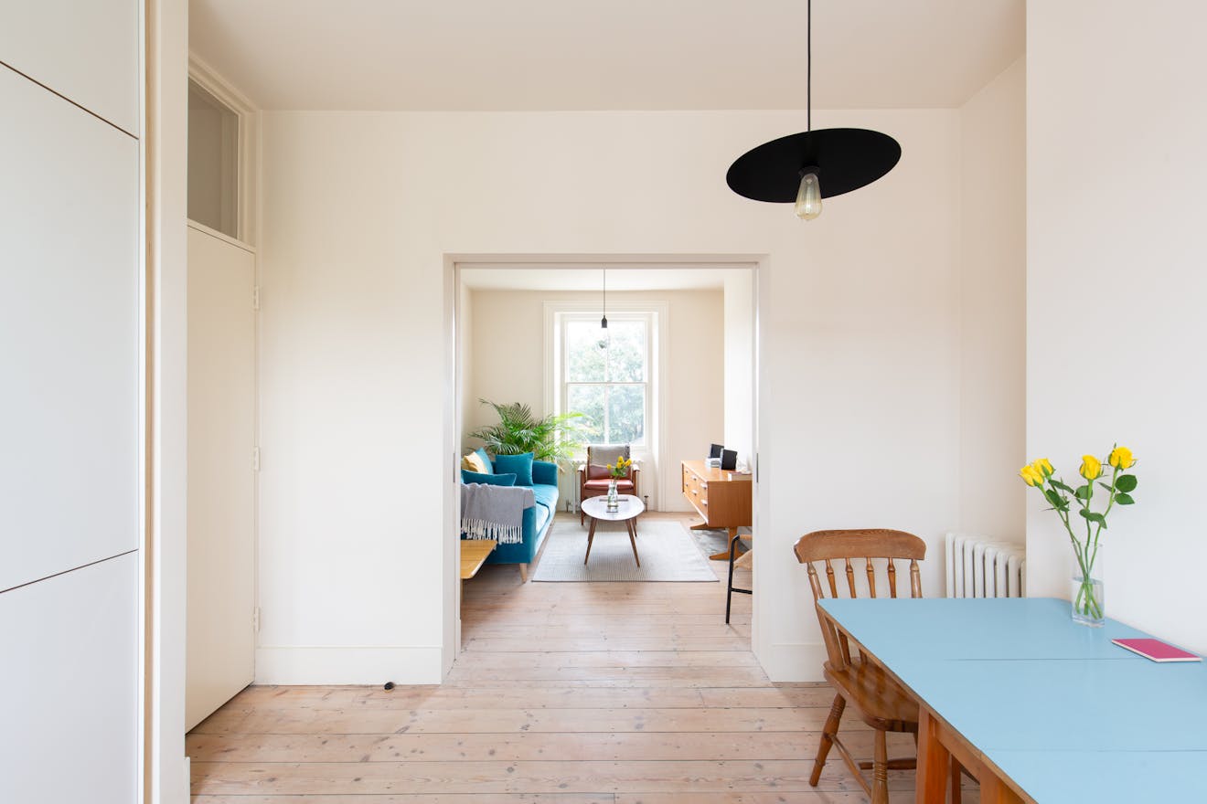 The details of this well-designed flat have been carefully considered and executed. The restored floorboards – sanded with lye and white matt oil – keep the palette natural and warm. The serene, calming Little Greene paint brings warmth to the light that reaches every corner. And the striking porcelain light switches add a pleasing tactility throughout.