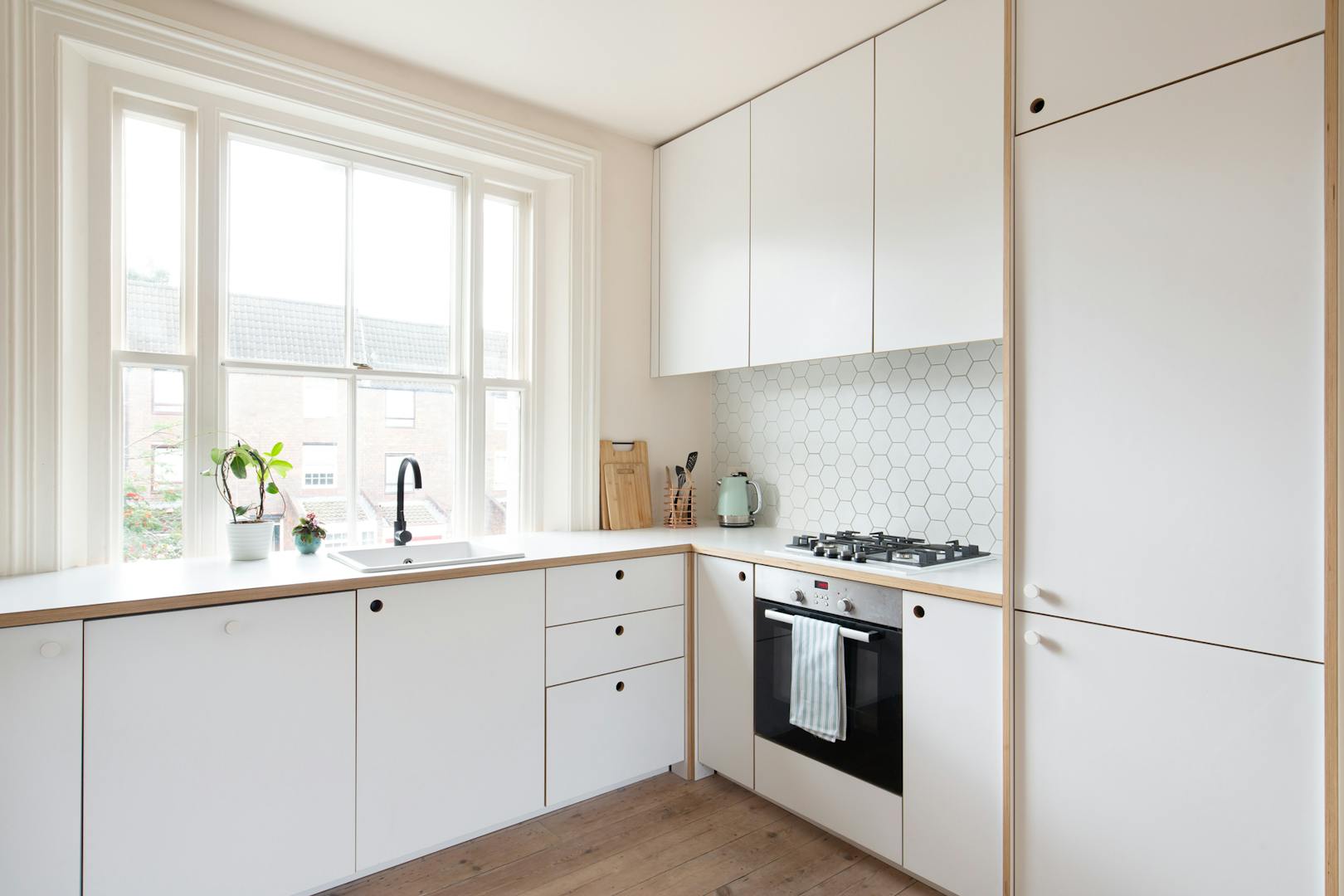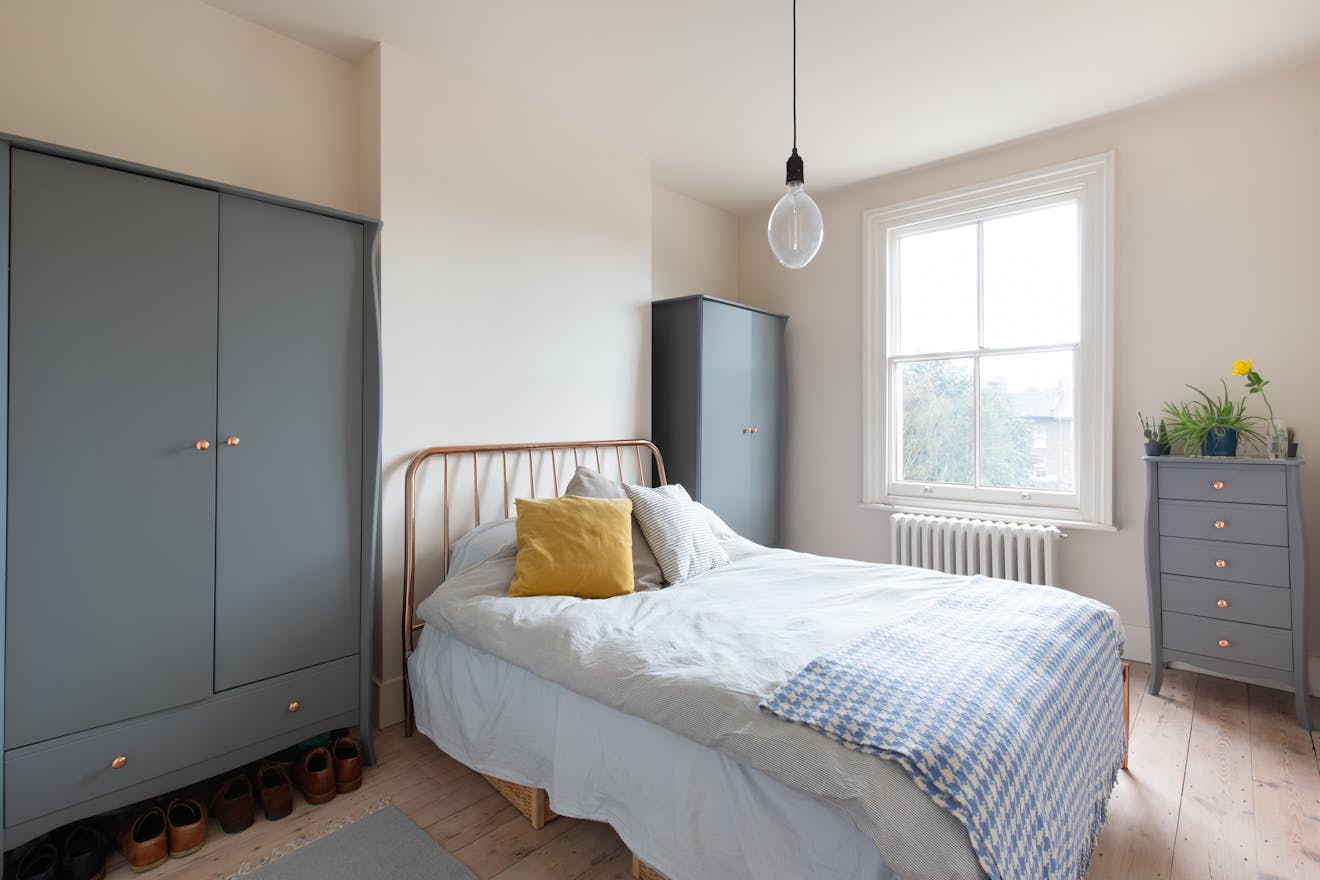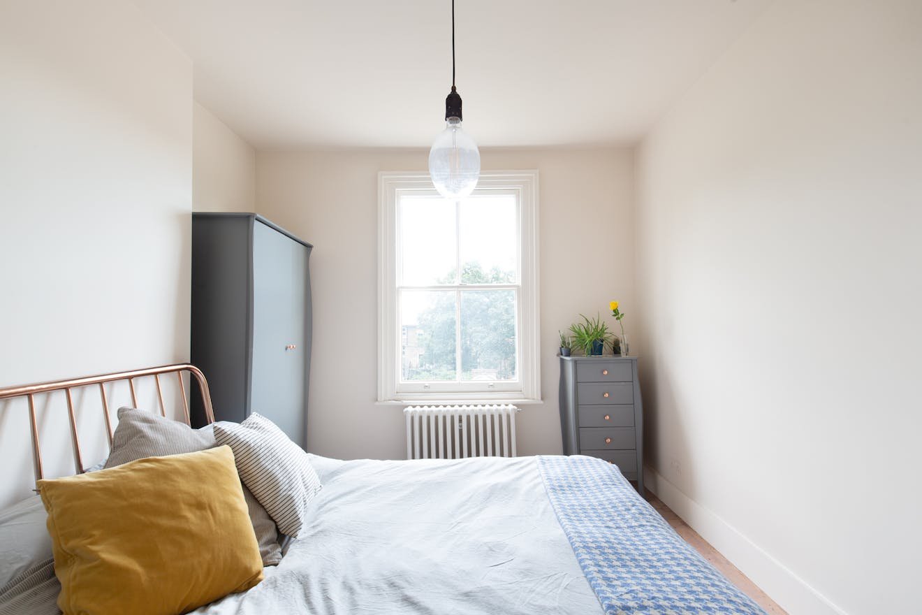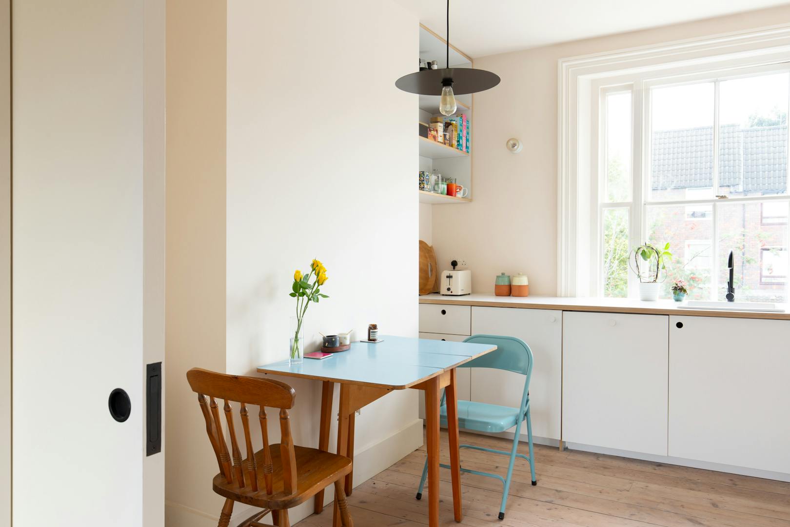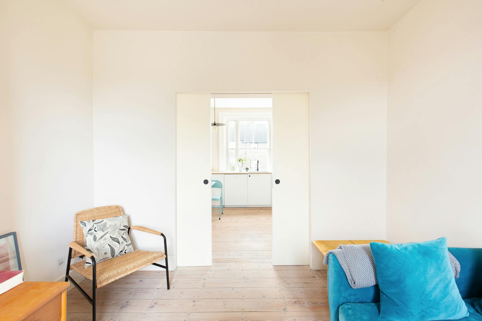 The details of this well-designed flat have been carefully considered and executed. The restored floorboards – sanded with lye and white matt oil – keep the palette natural and warm. The serene, calming Little Greene paint brings warmth to the light that reaches every corner. And the striking porcelain light switches add a pleasing tactility throughout.
